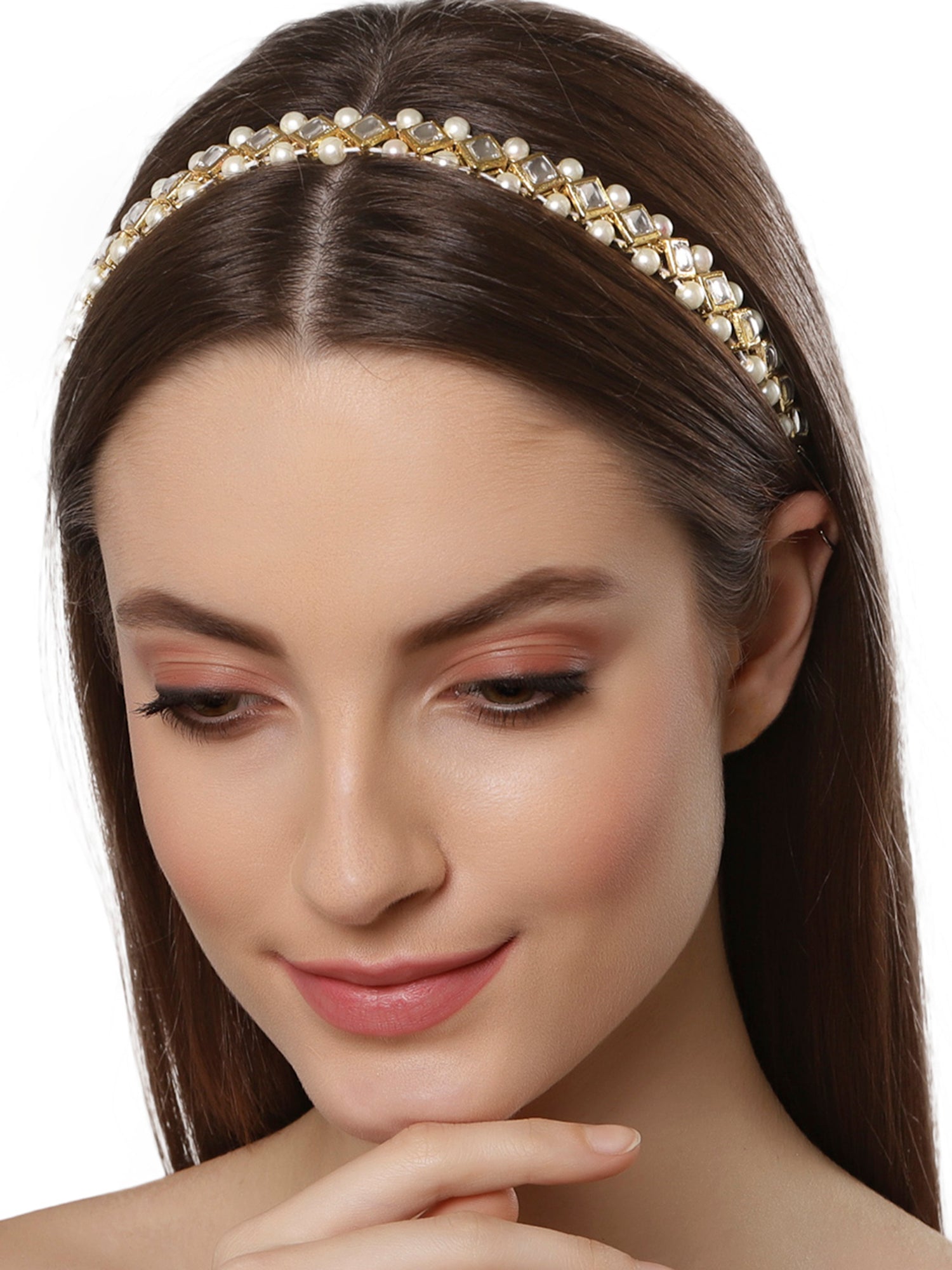 - Diamond Shape Kundan and Pearl Studded Hairband for Women. A beautifully handcrafted hairband studded with Kundan. This hairband gives you the elegant look that makes everyone's heads turn on you. It's Five Layer Micro Gold Plated and Embellished with Kundan for High Durability. Intricate high polish creates glamorous reflections and adds a luxurious look. Perfect for Weddings, Festivals, Traditional Occasions. Best when paired with any Indian outfit.