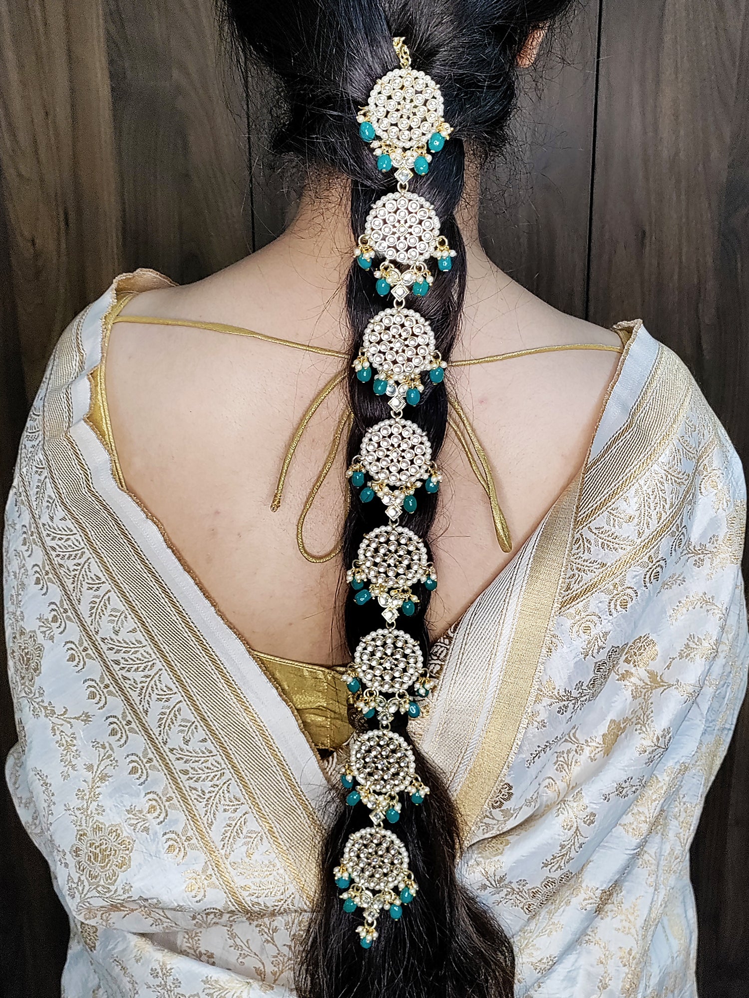 - Karatcart Floral Shape Gold Plated Green Tumble Kundan Bridal Wedding Hair Braid Choti for Women. Our products are designed with high-quality Kundan Stones and these products are enhanced with plating that are skin-friendly & with love to reach your heart.