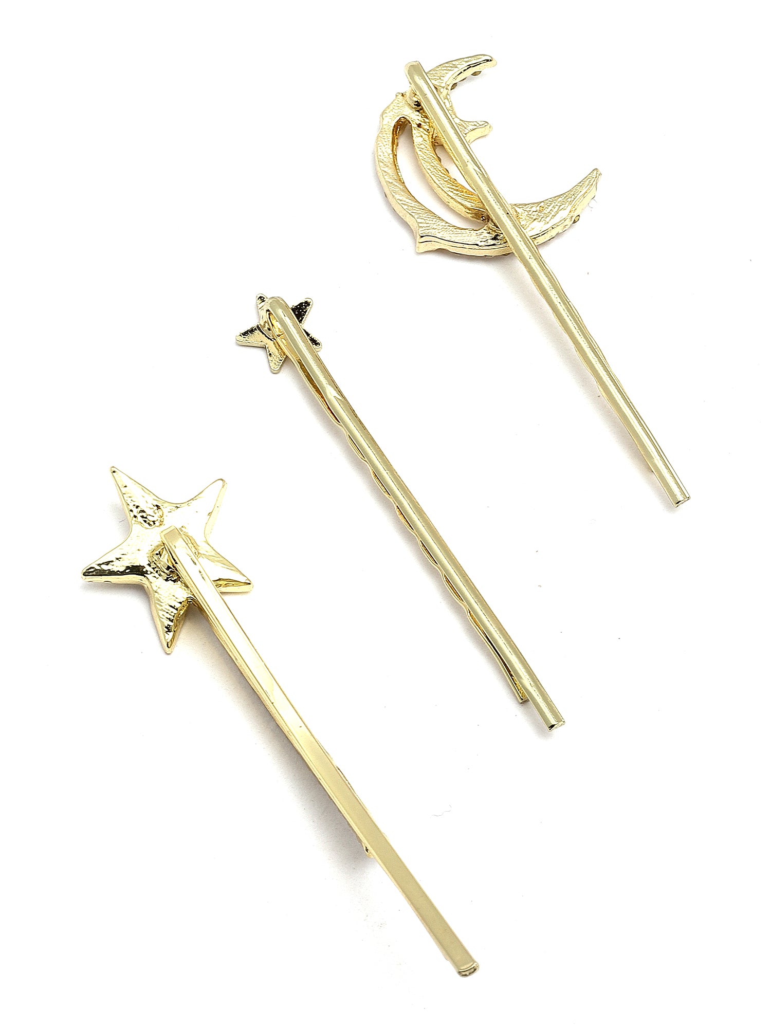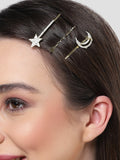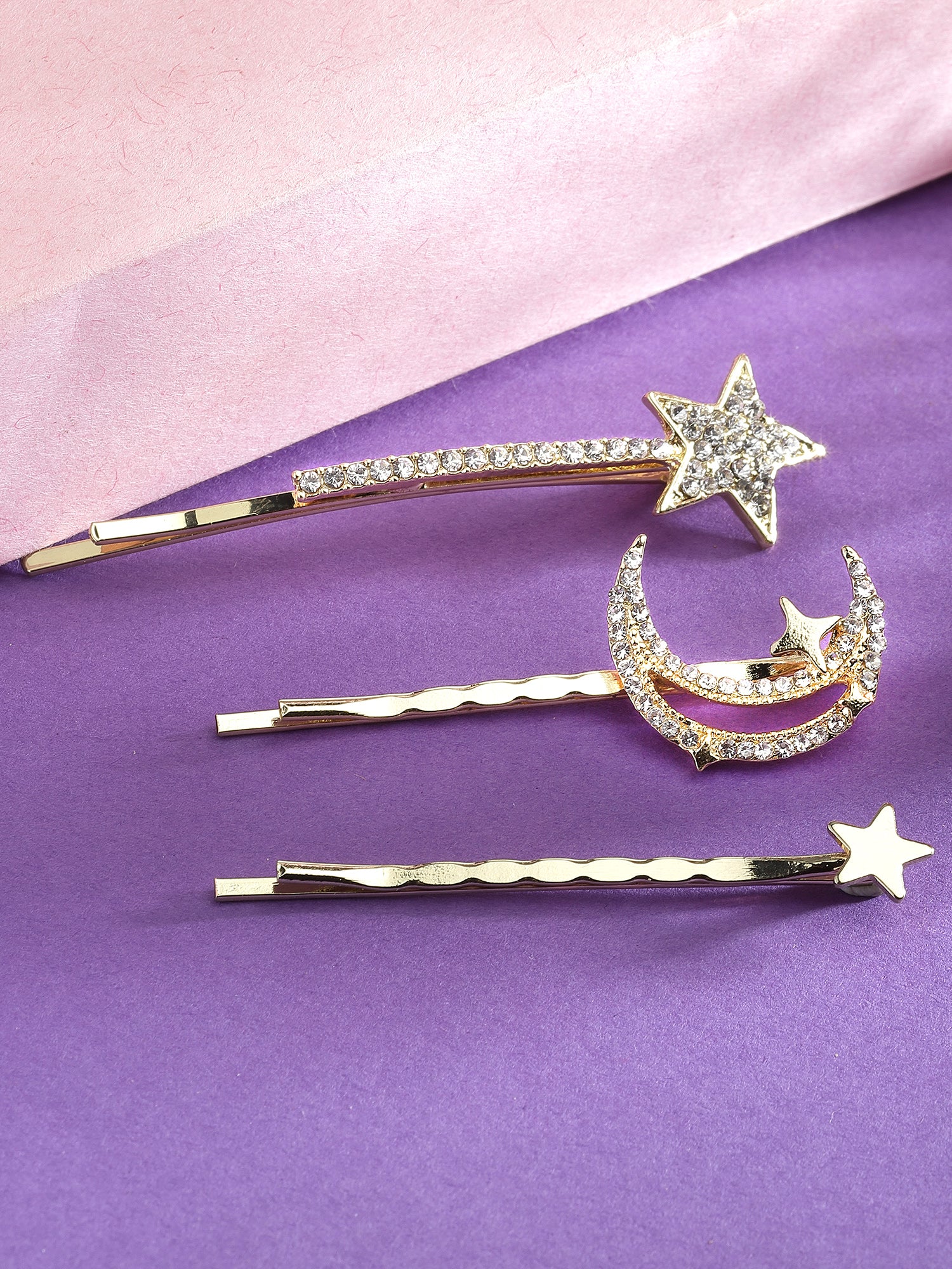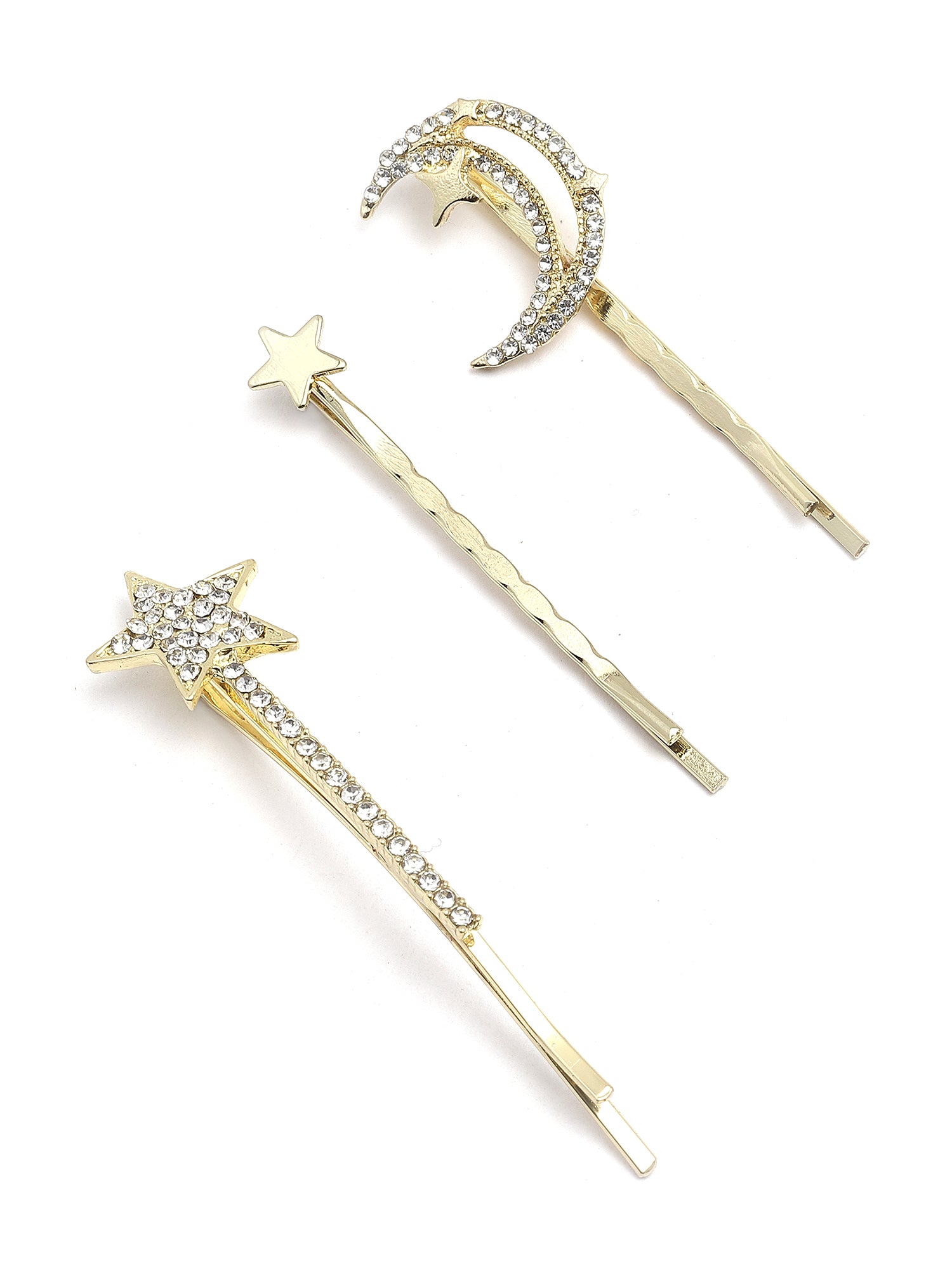Bohey by KARATCART Set of 3 Gold Plated Moon and Star Crystal Studded Hair Clips for Women