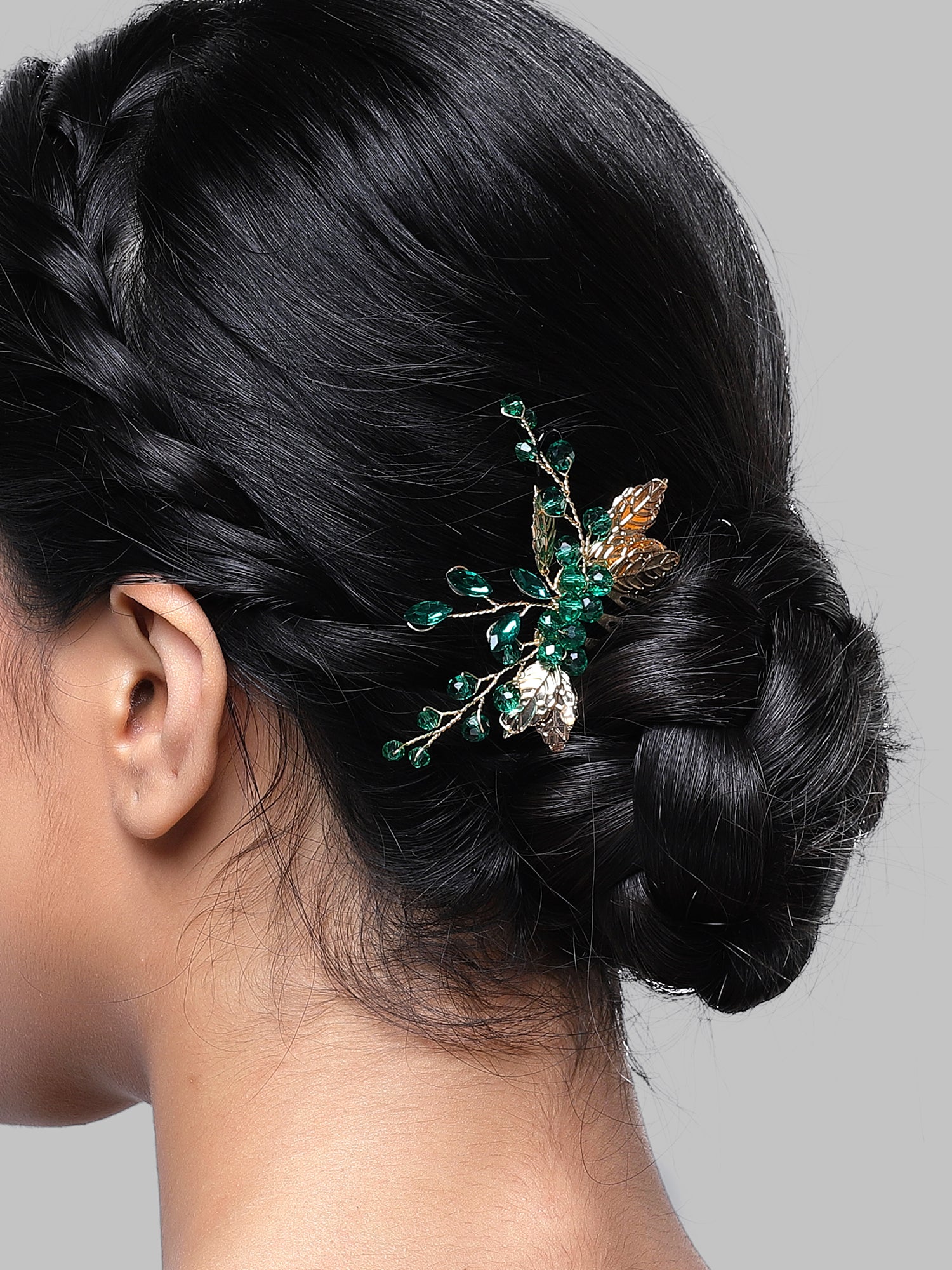 - Karatcart Green Crystal Leaf Design Hair Clip for Women. Our products are designed with high-quality material and these products are enhanced with plating that are skin-friendly & with love to reach your heart.