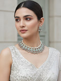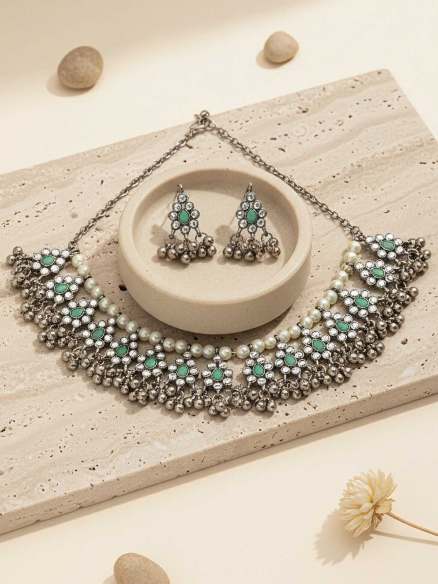 Oxidised Silver Light Green Kundan Studded Handcrafted Necklace Set