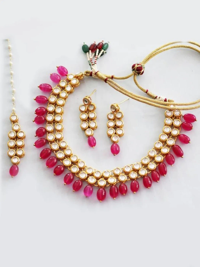 Add a touch of brilliance to your look with this gorgeous maang tikka set, which has been crafted into a design that is an absolute stunner. Crafted out of alloy, the kundan studded set has been given a yellow gold plating and perfect finish. The stunning polki set will look splendid with any ethnic outfit.