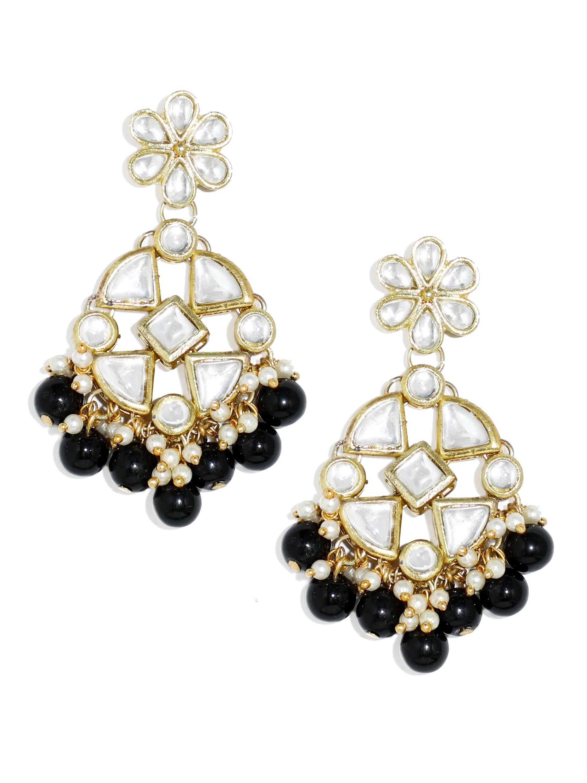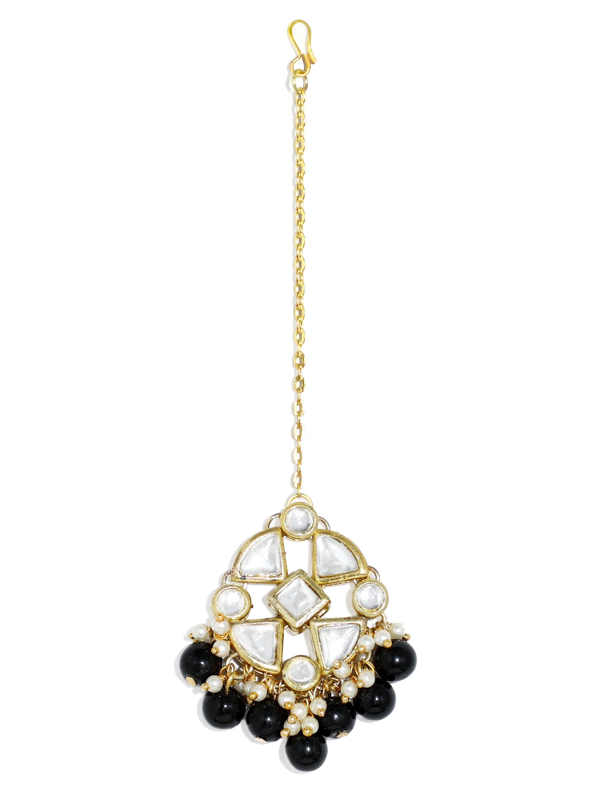 - Gold Plated Black Beads Kundan Dangler Earrings with Maangtikka for Women. It's Five Layer Micro Gold Plated and Embellished with Kundan for High Durability. Intricate high polish creates glamorous reflections and adds a luxurious look. Perfect for Weddings, Festivals, Traditional Occasions. Best when paired with any Indian outfit.