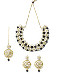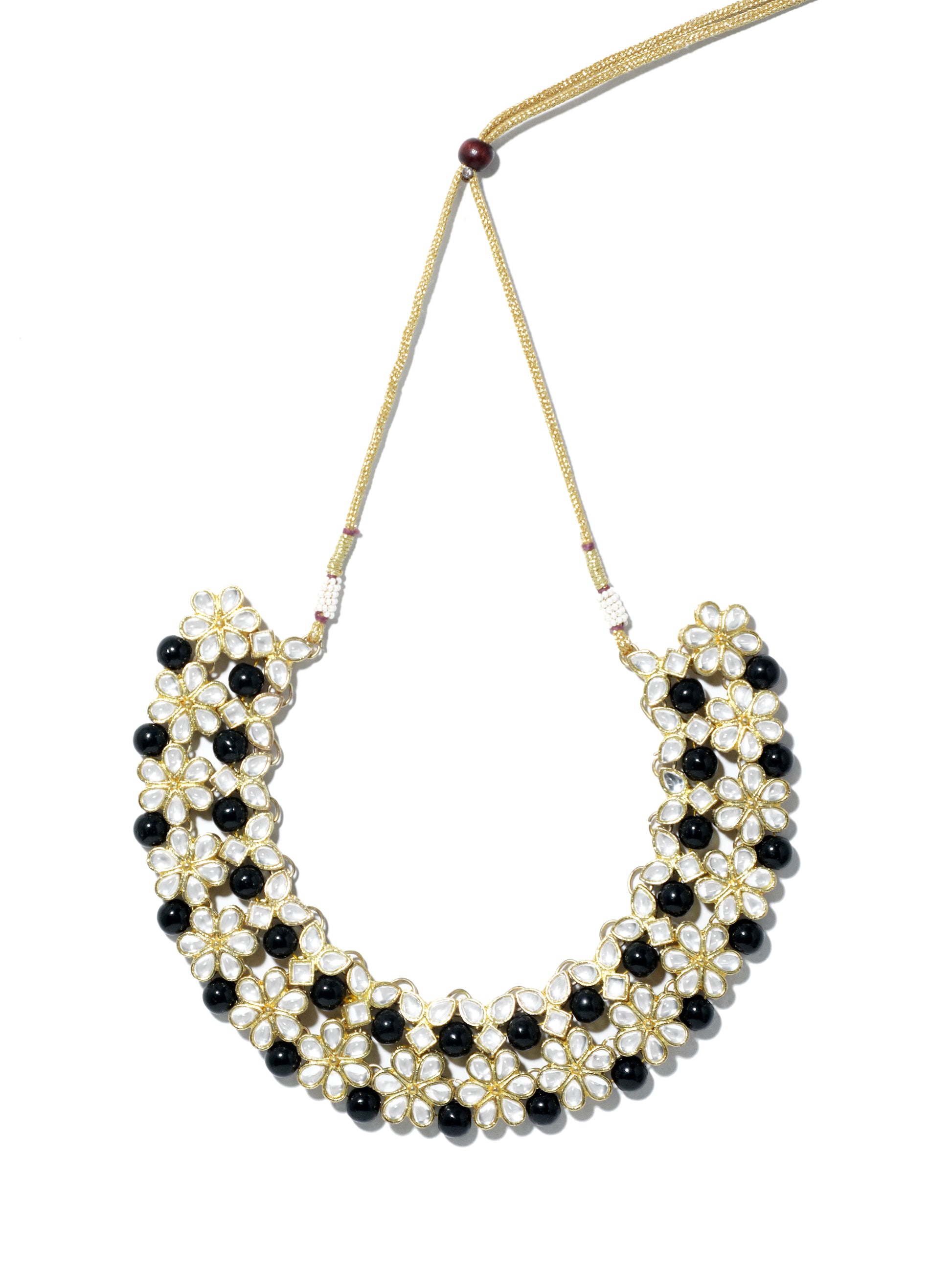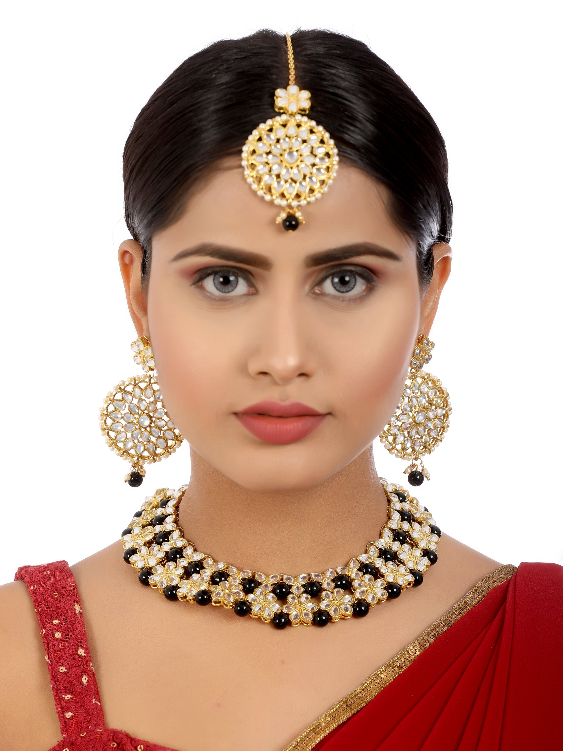 - Look Stylish and Trendy with this Black Beads Studded Kundan Choker Necklace with Earrings and Maangtikka. Best when paired with Indian or Indo Western Attire. Made with Internationally approved skin-friendly material