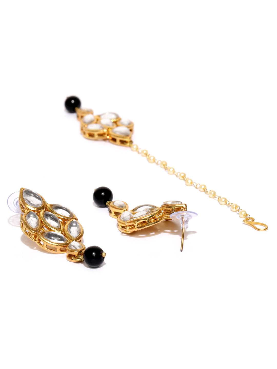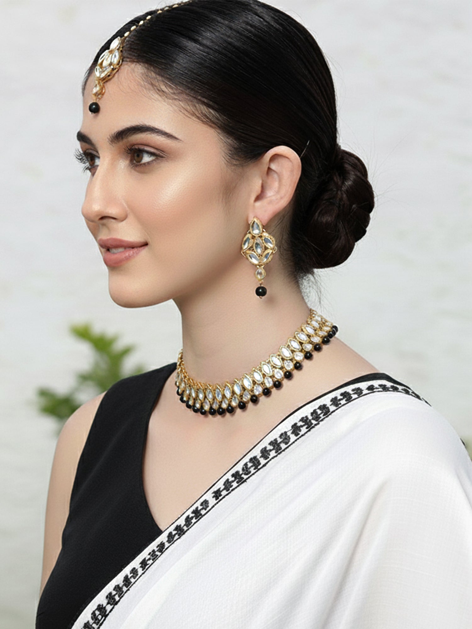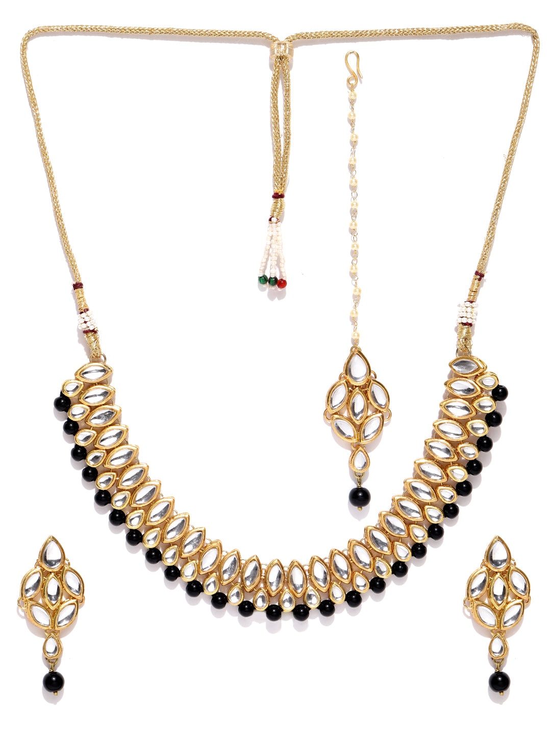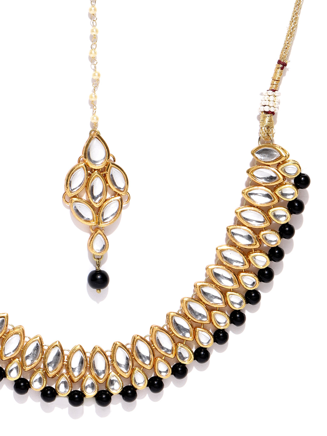 - Karatcart Gold-Plated Handcrafted Kundan & Black Beads Studded Choker Necklace with Earrings and Maangtikka. It's Five Layer Micro Gold Plated and Embellished with Kundan for High Durability. Intricate high polish creates glamorous reflections and adds a luxurious look. Perfect for Weddings, Festivals, Traditional Occasions. Best when paired with any Indian outfit.