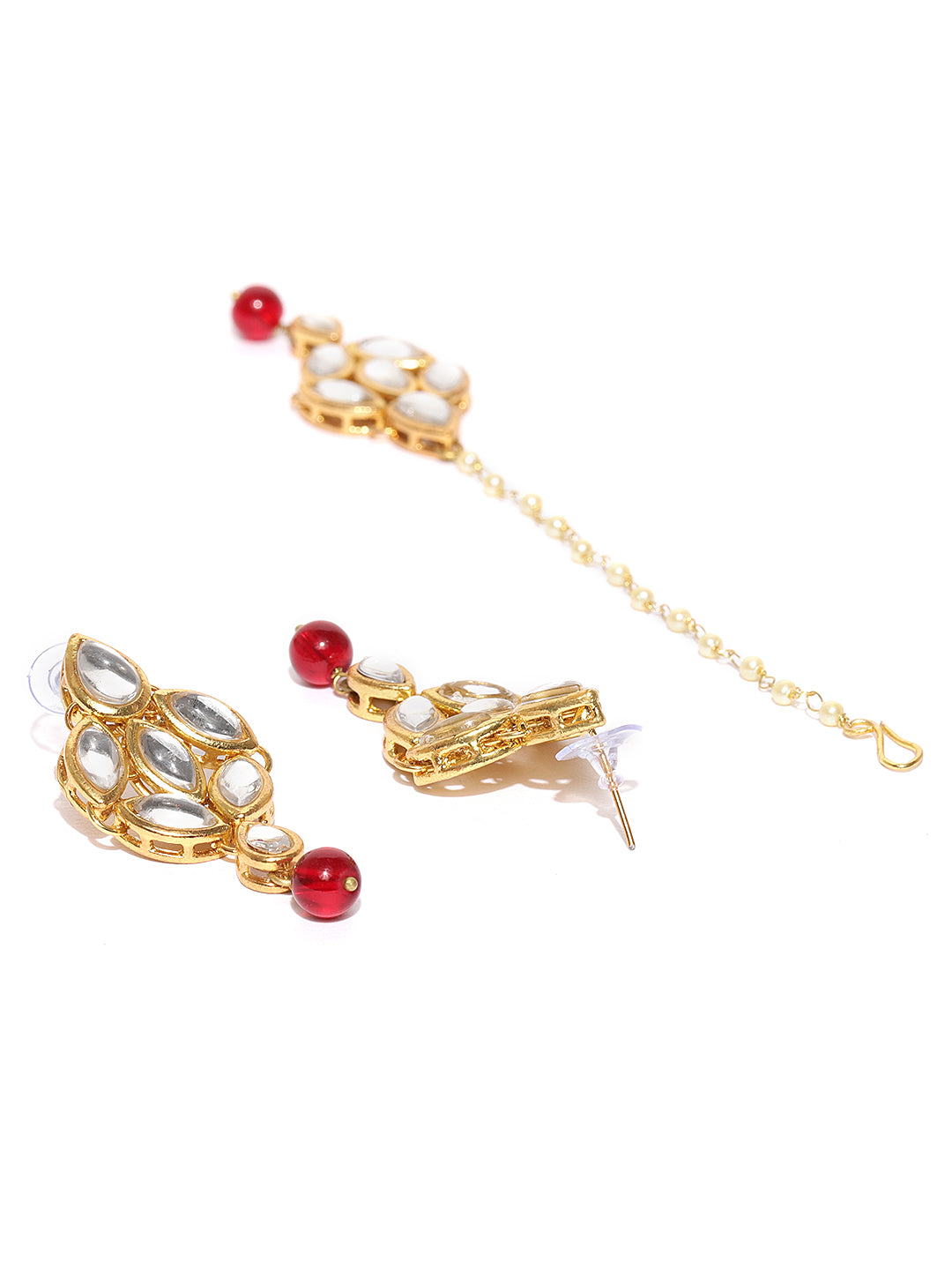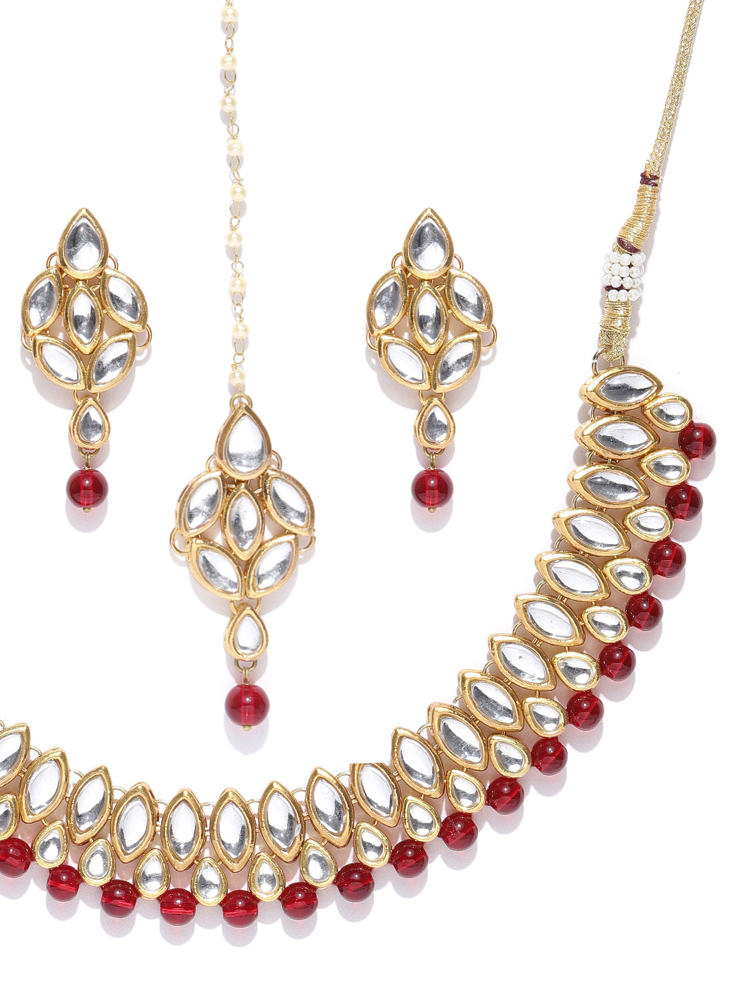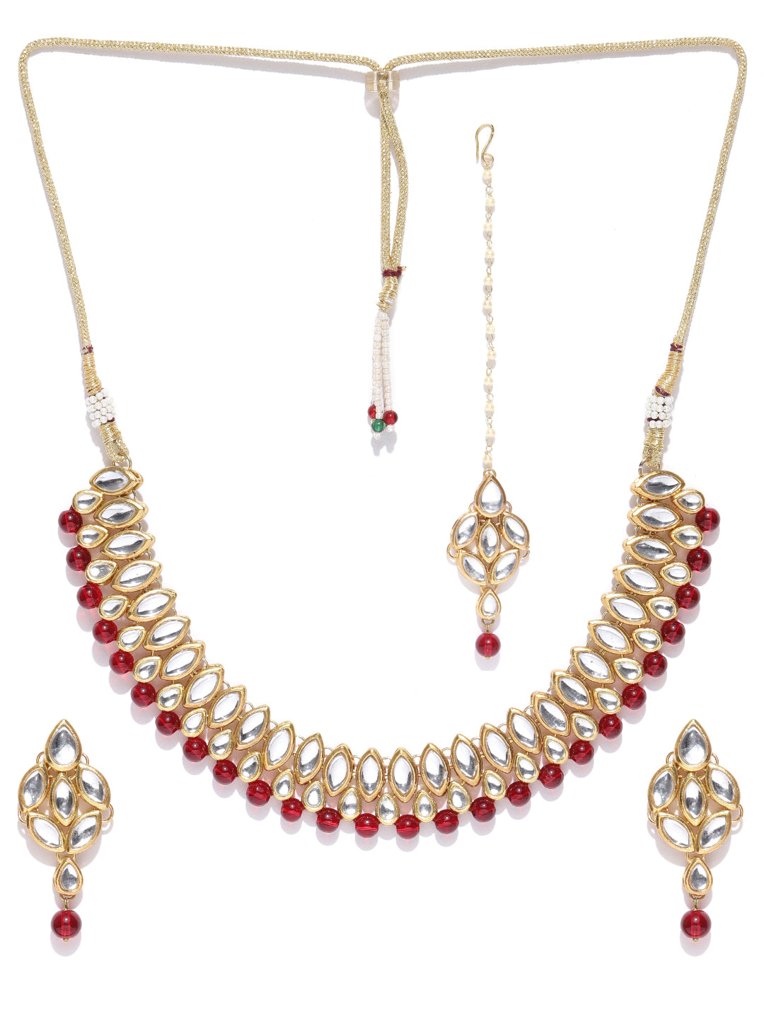 - Karatcart Gold-Plated Handcrafted Kundan & Red Beads Studded Necklace with Earrings and Maangtikka. It's Five Layer Micro Gold Plated and Embellished with Kundan for High Durability. Intricate high polish creates glamorous reflections and adds a luxurious look. Perfect for Weddings, Festivals, Traditional Occasions. Best when paired with any Indian outfit.