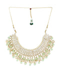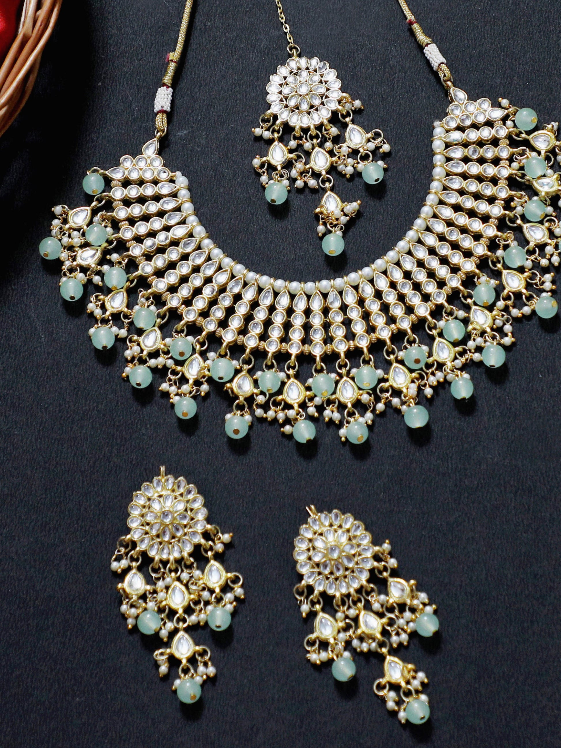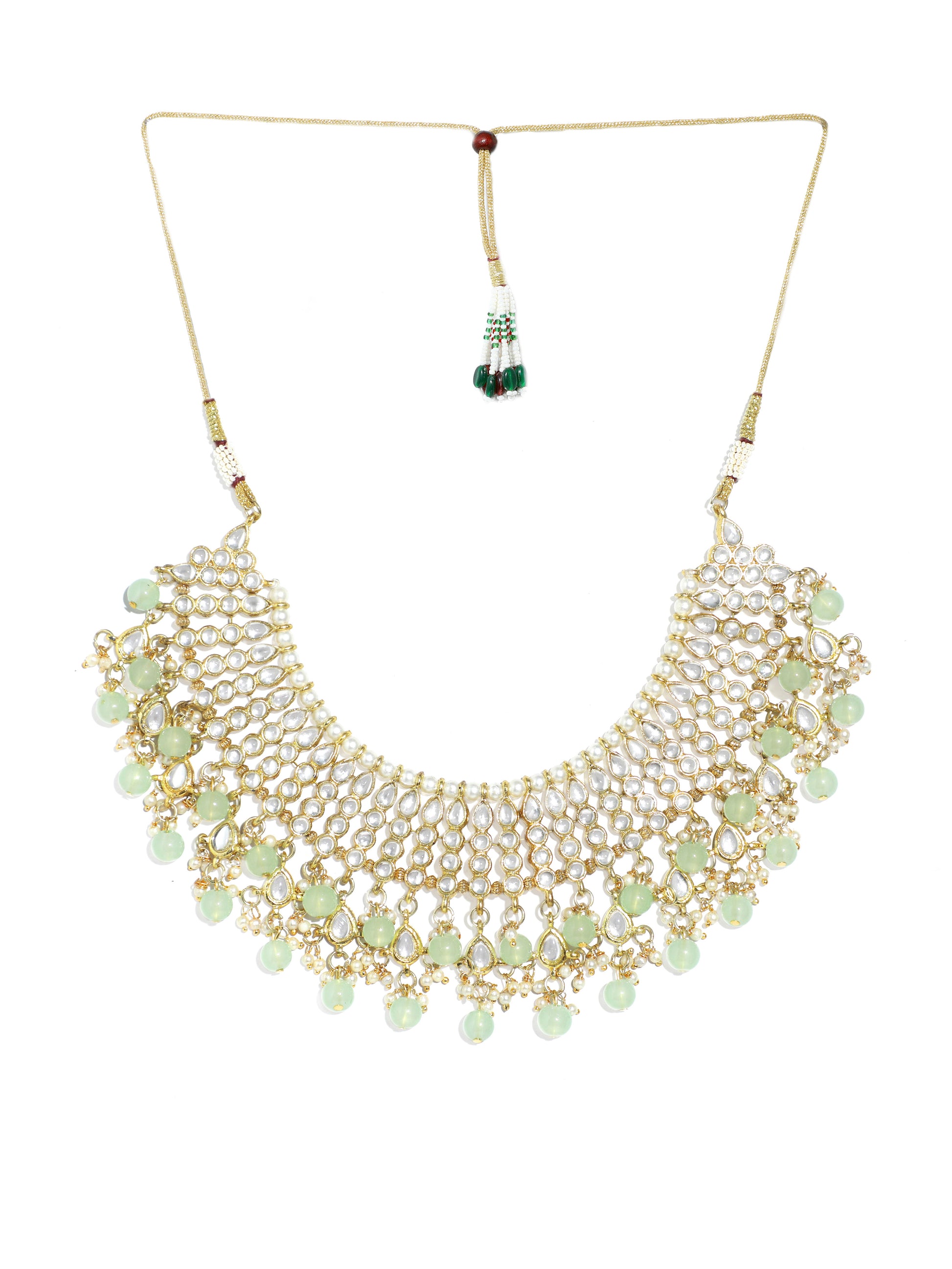 - Gold Plated Light Green Kundan Choker Necklace Set. It's Five Layer Micro Gold Plated and Embellished with Elegant Kundan for High Durability. Intricate high polish creates glamorous reflections and adds a luxurious look. Perfect for Weddings, Festivals, Traditional Occasions. Best when paired with any Indian outfit.