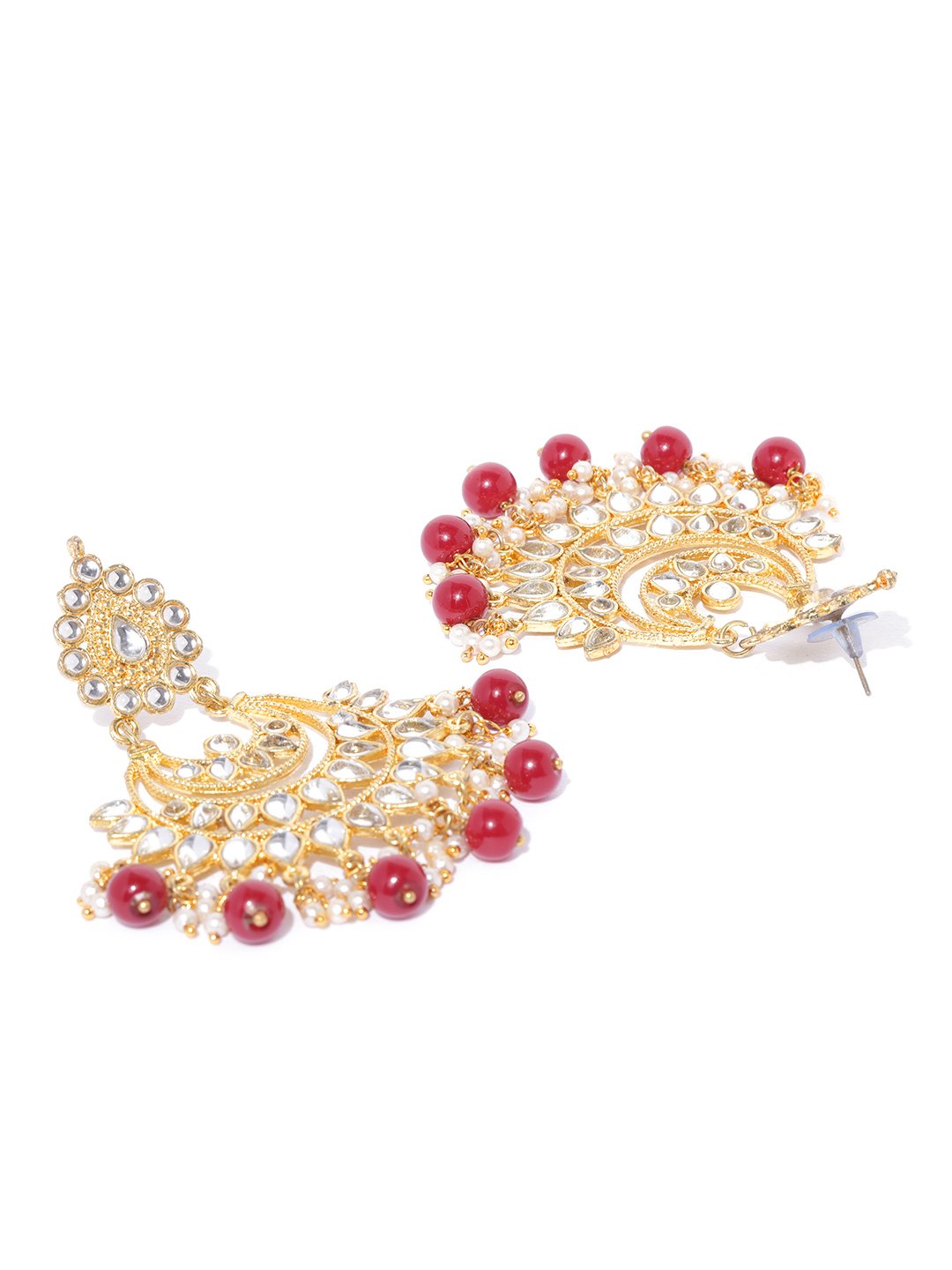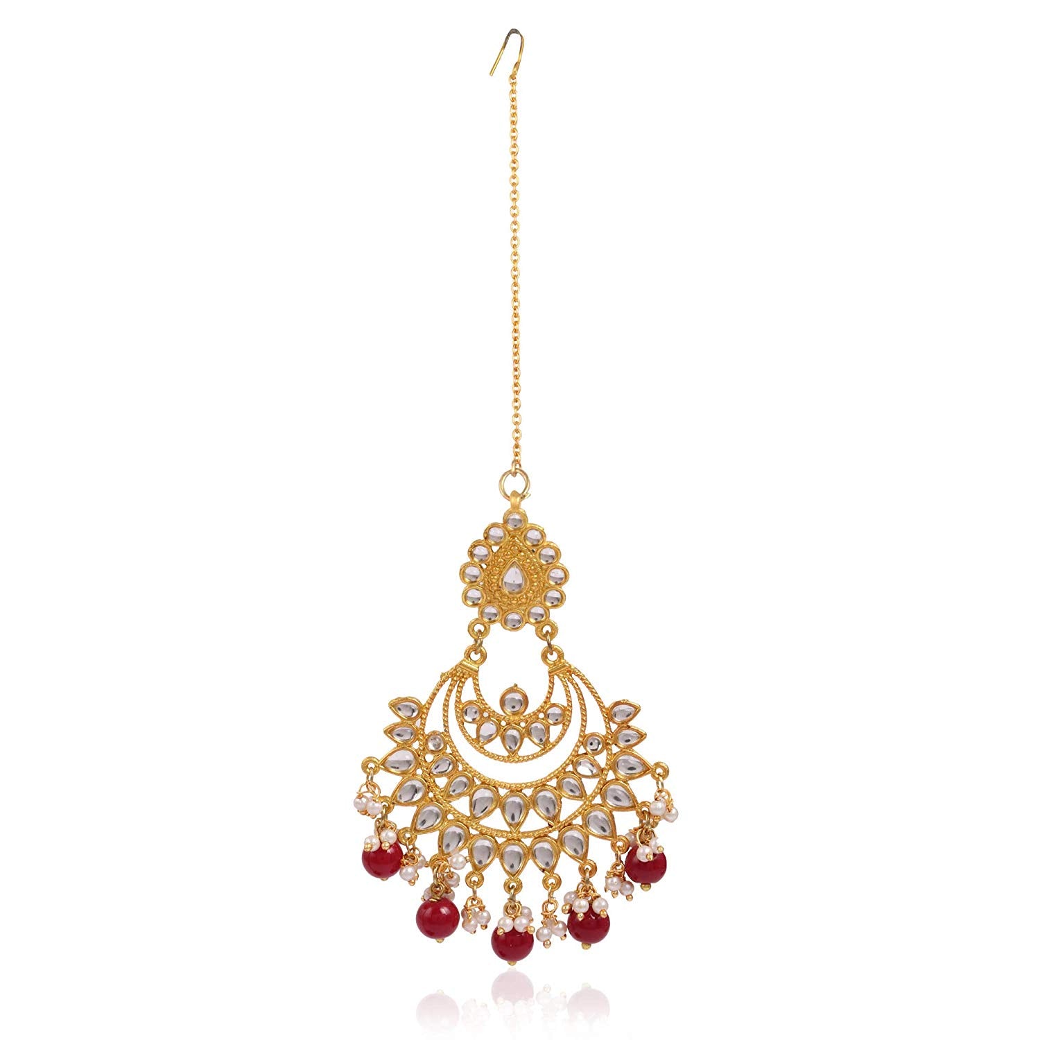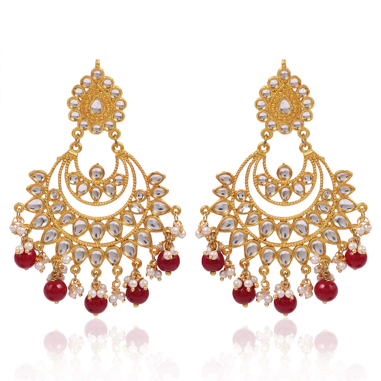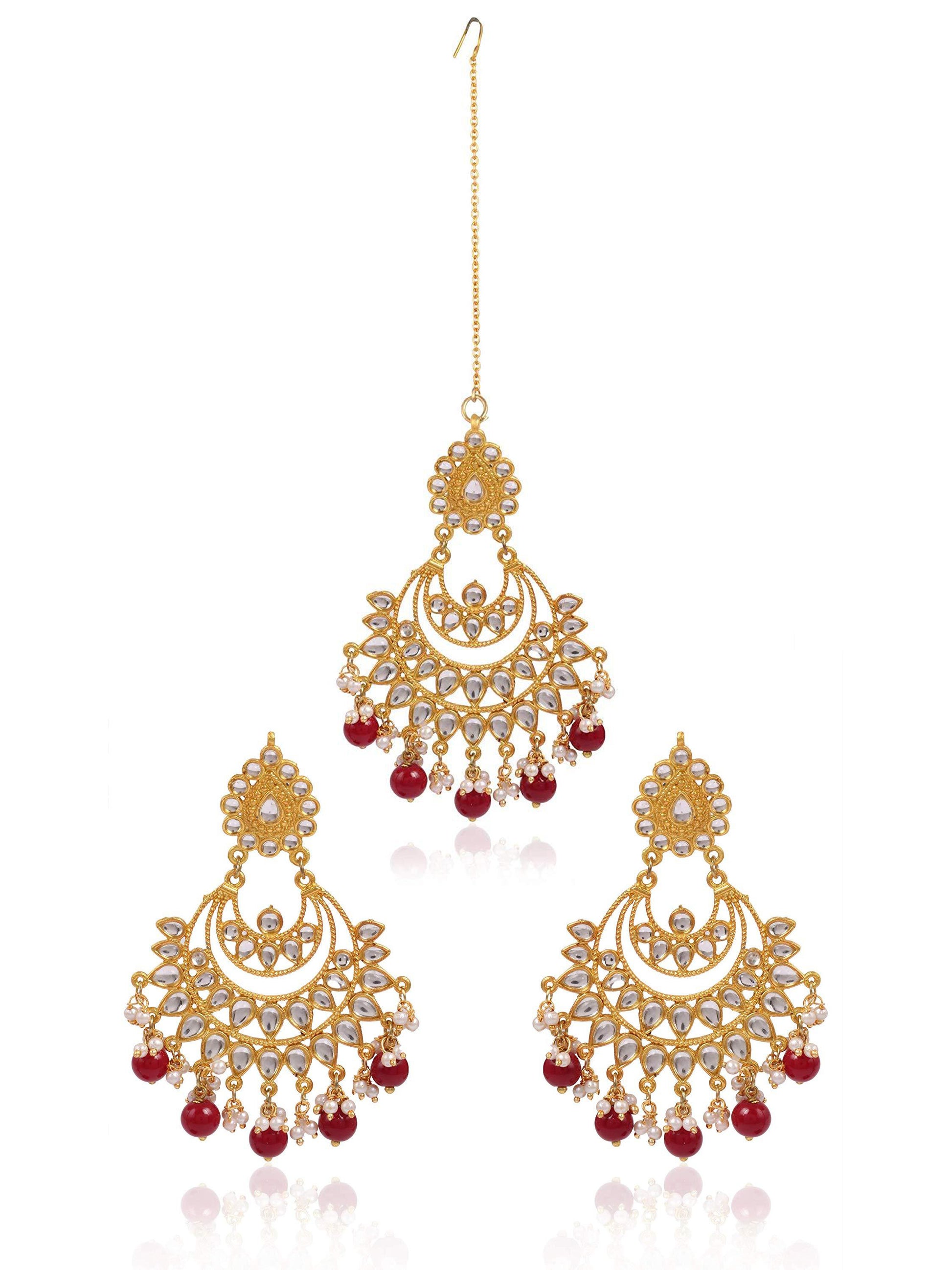 - Kunuz Red Beads and Kundan Chandbali Earrings with Maangtikka. It's Five Layer Micro Gold Plated and Embellished with Kundan for High Durability. Intricate high polish creates glamorous reflections and adds a luxurious look. Perfect for Weddings, Festivals, Traditional Occasions. Best when paired with any Indian outfit.