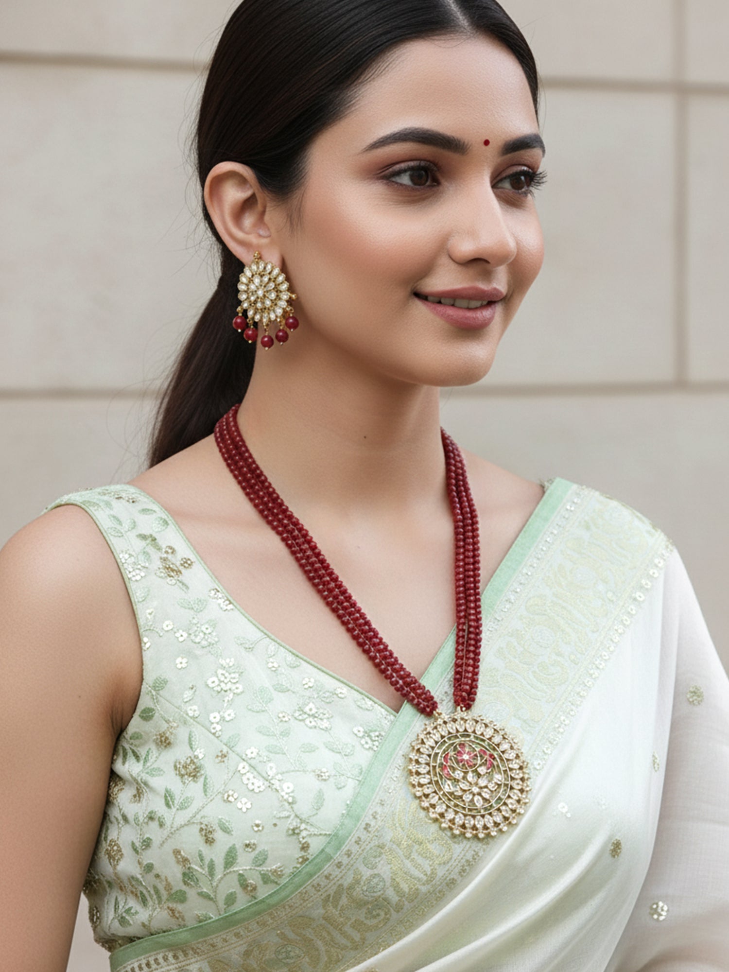 - Gold Plated Antique Red Kundan Rani Haar Beaded Pendant Set. Best when paired with Indian or Indo-Western Attire. Made with Internationally approved skin-friendly material, this set is a must-have for your collection.