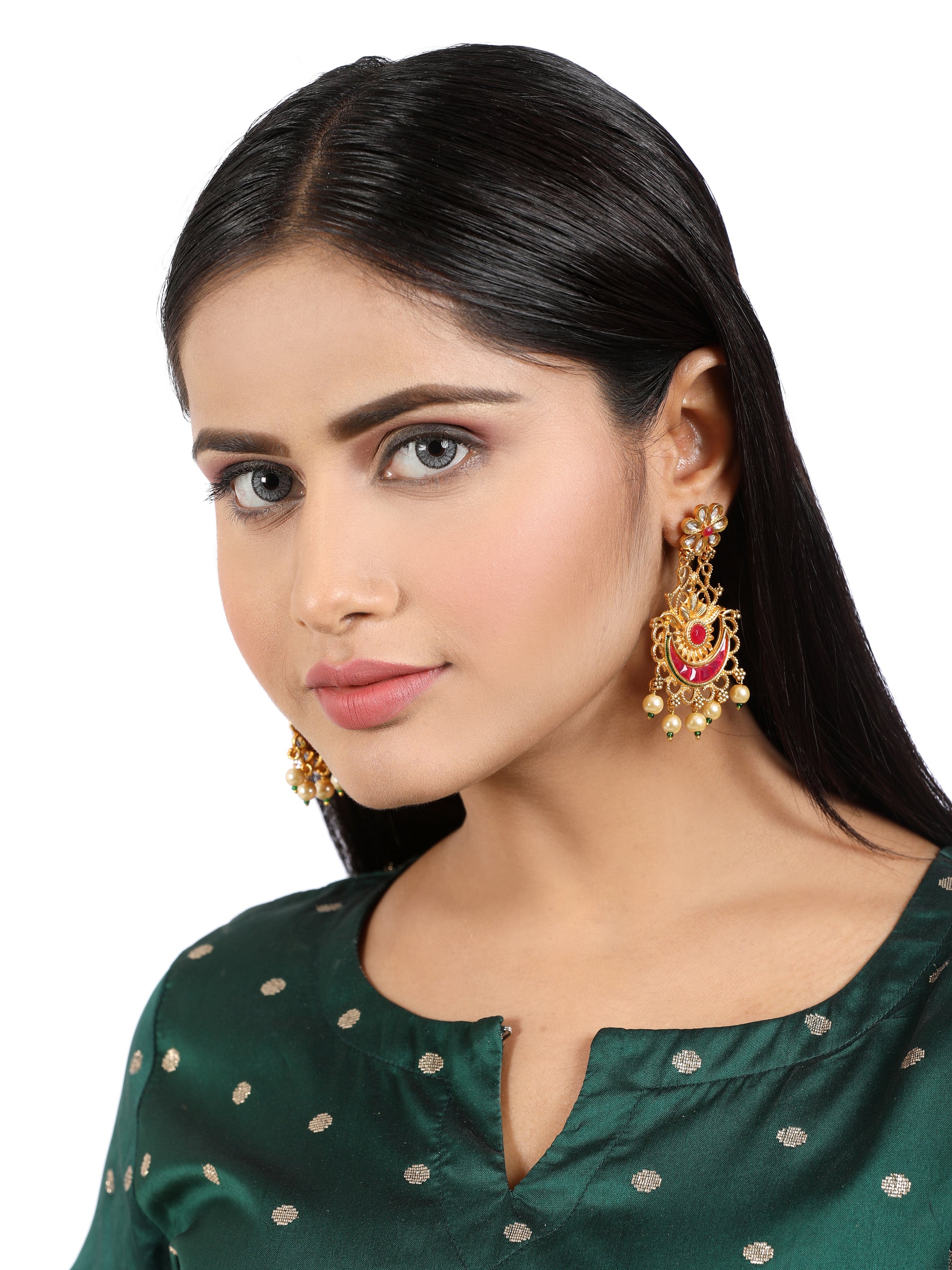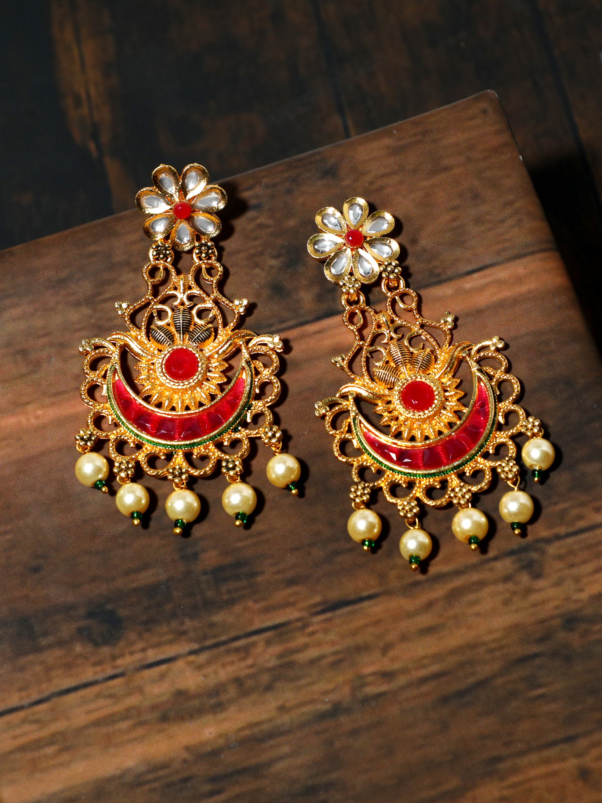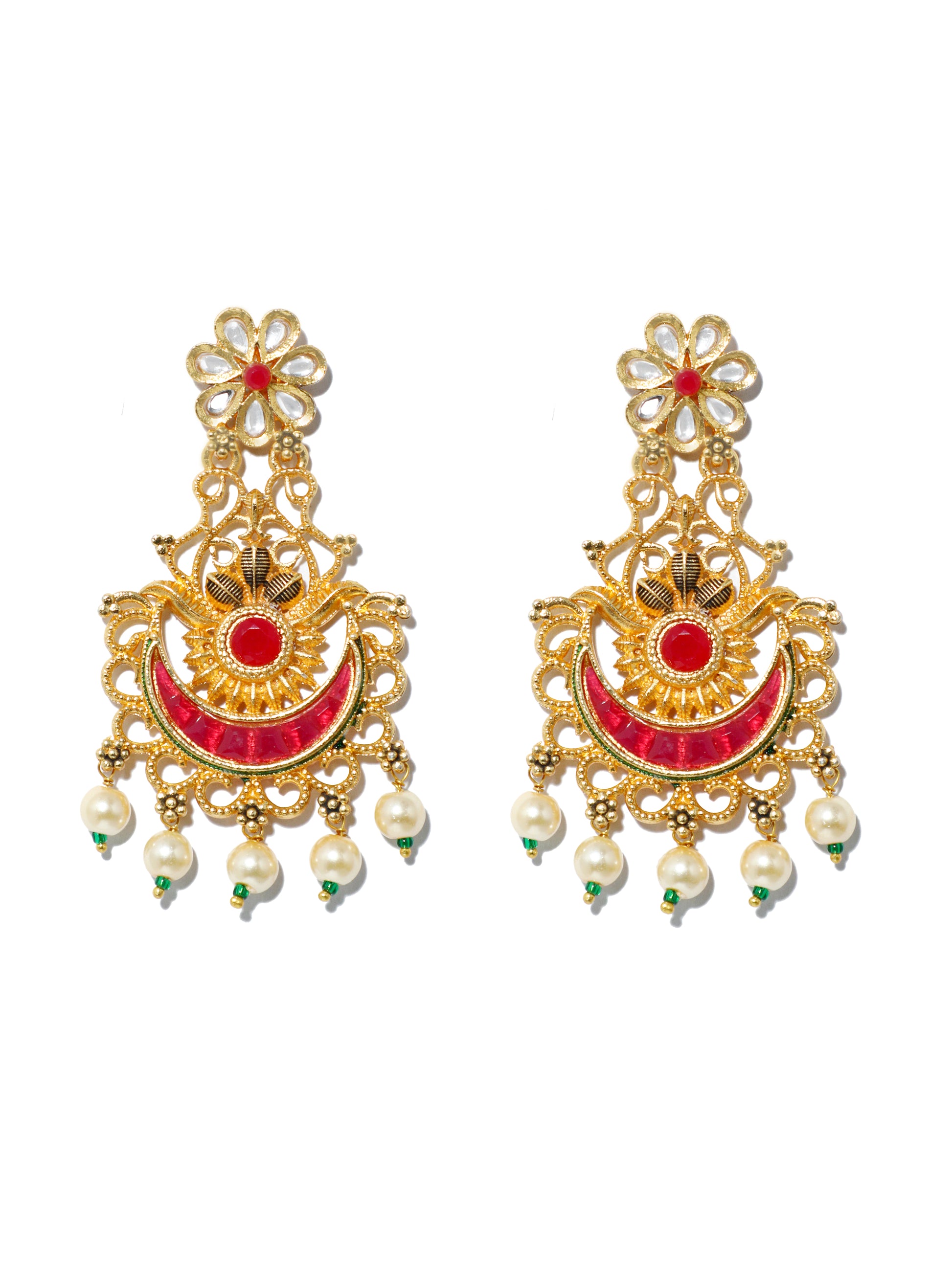 - Gold Plated Bridal Pearl Beads Red Kundan Chandbali Earrings for Women's. This set can be best paired with Indian Attire. Made with Internationally approved skin-friendly materials. Five Layer Micro Gold Plated For High Durability. Intricate high polish creates glamorous reflections and adds a luxurious look.