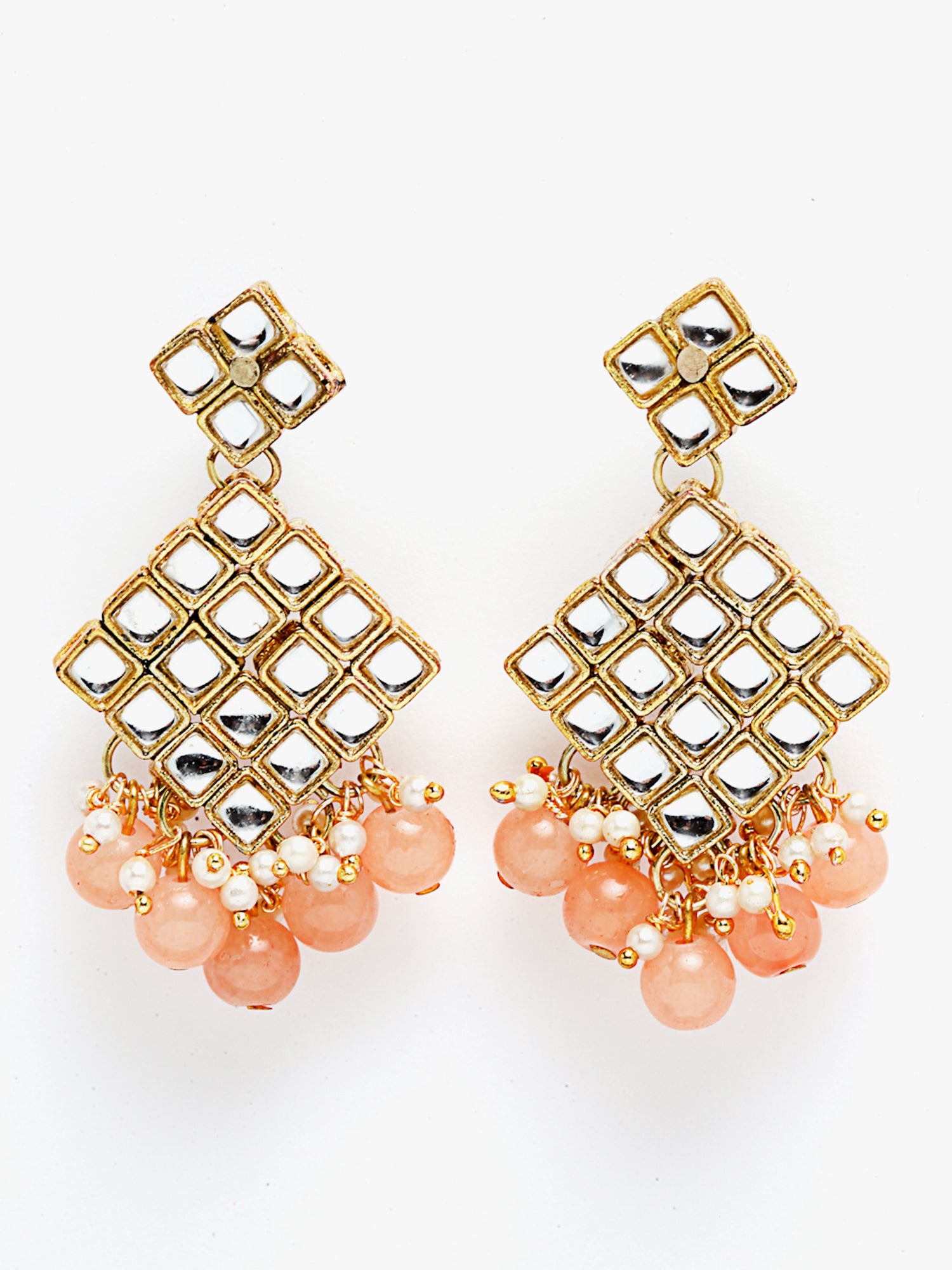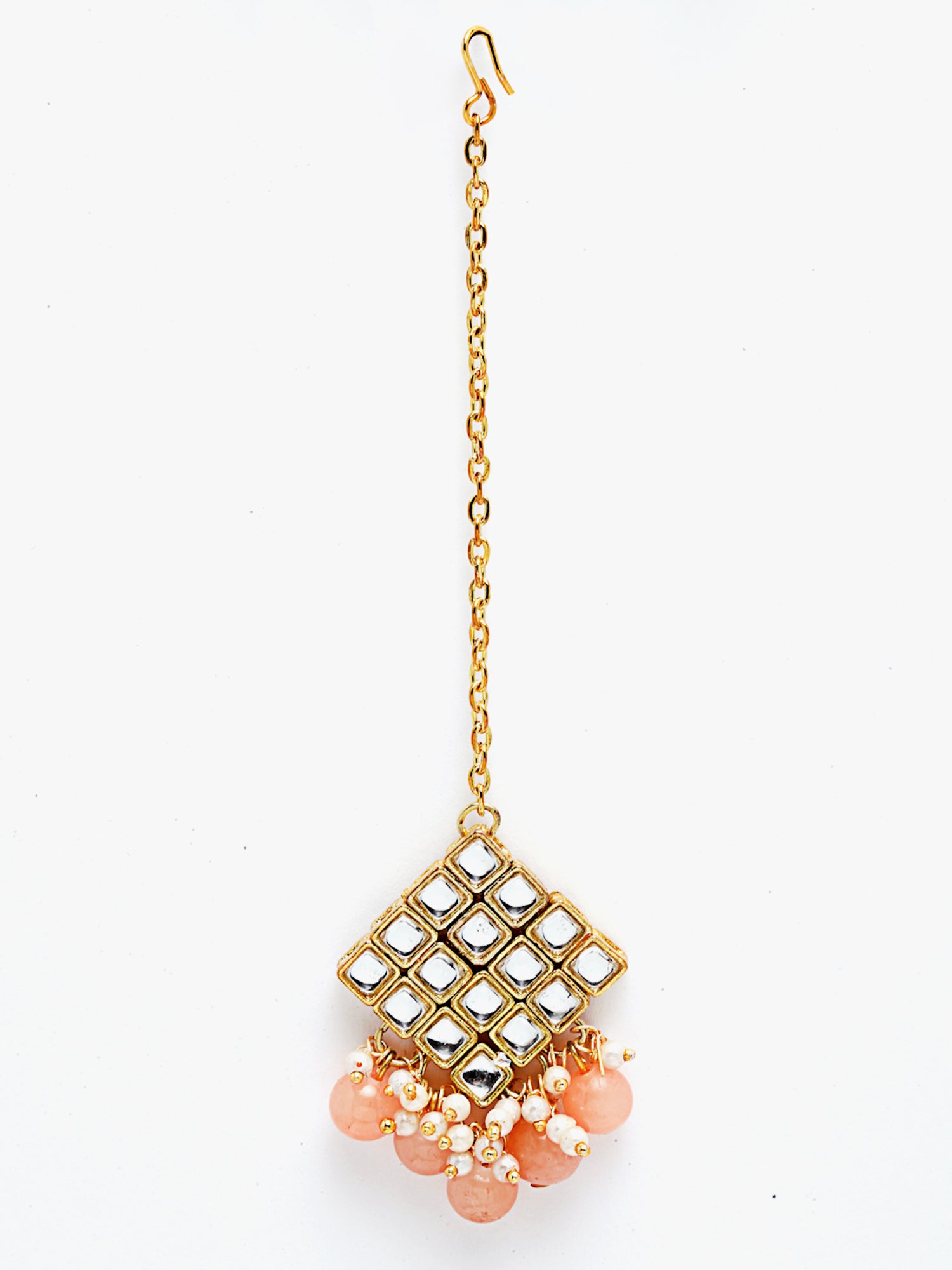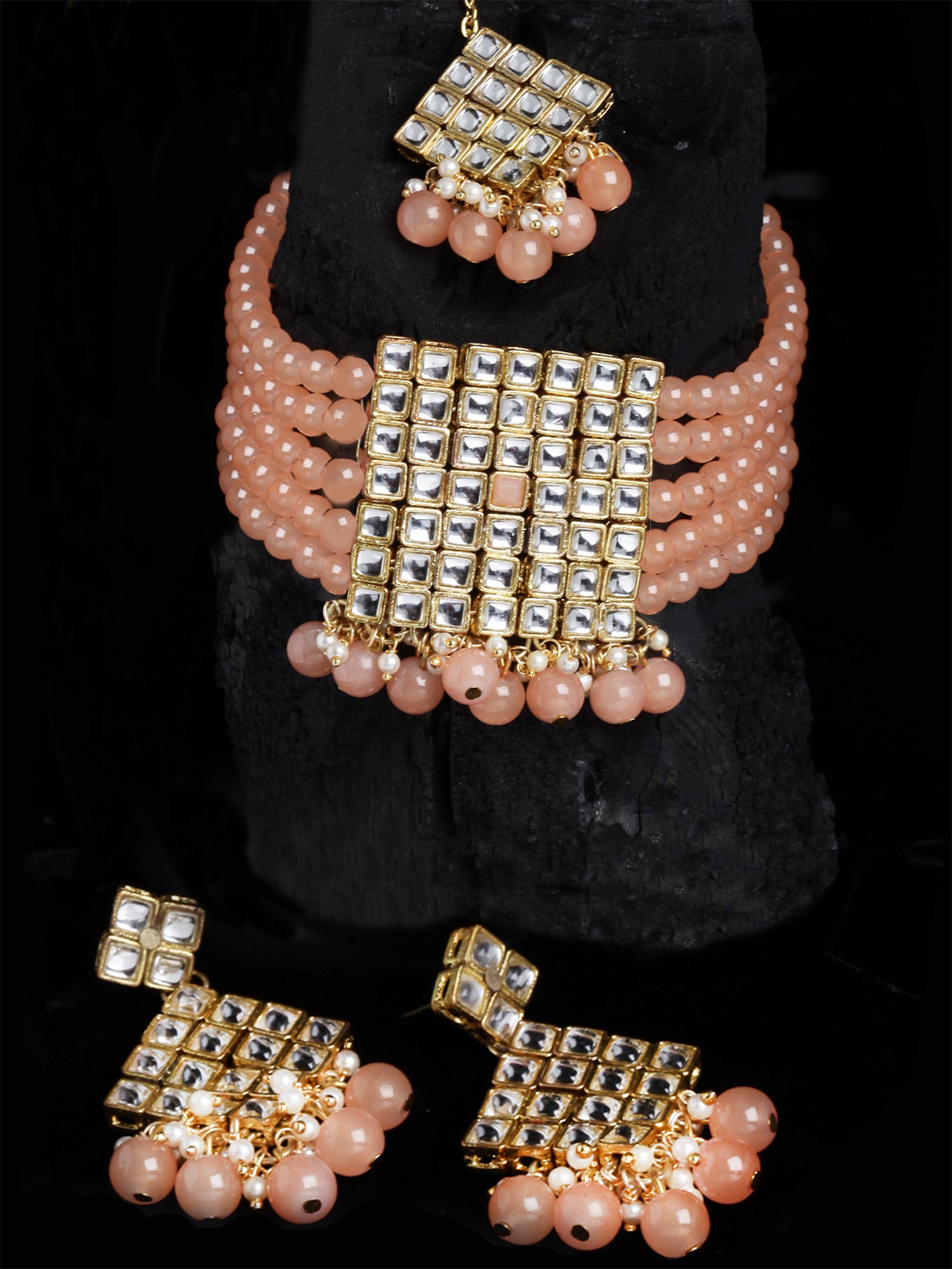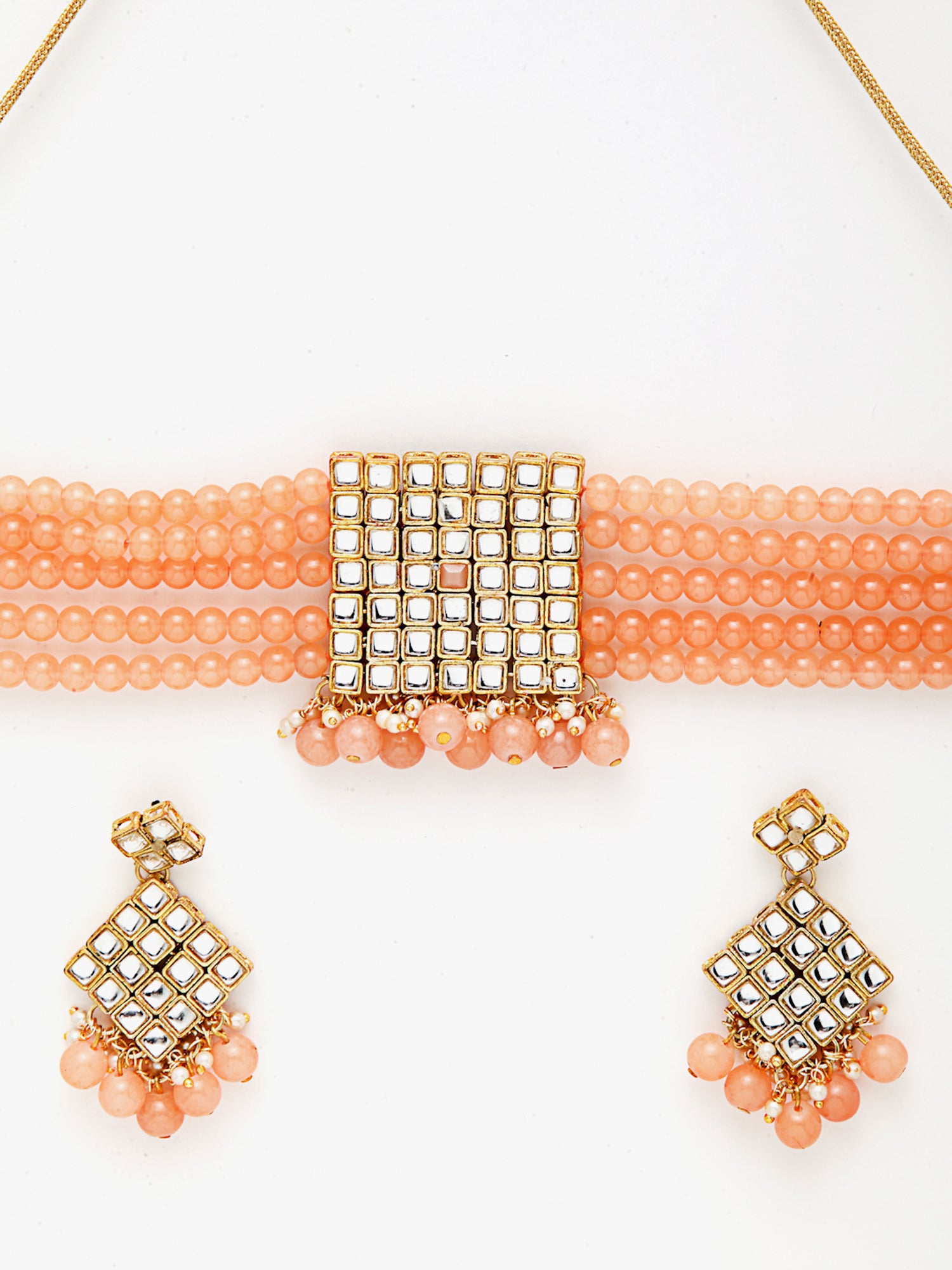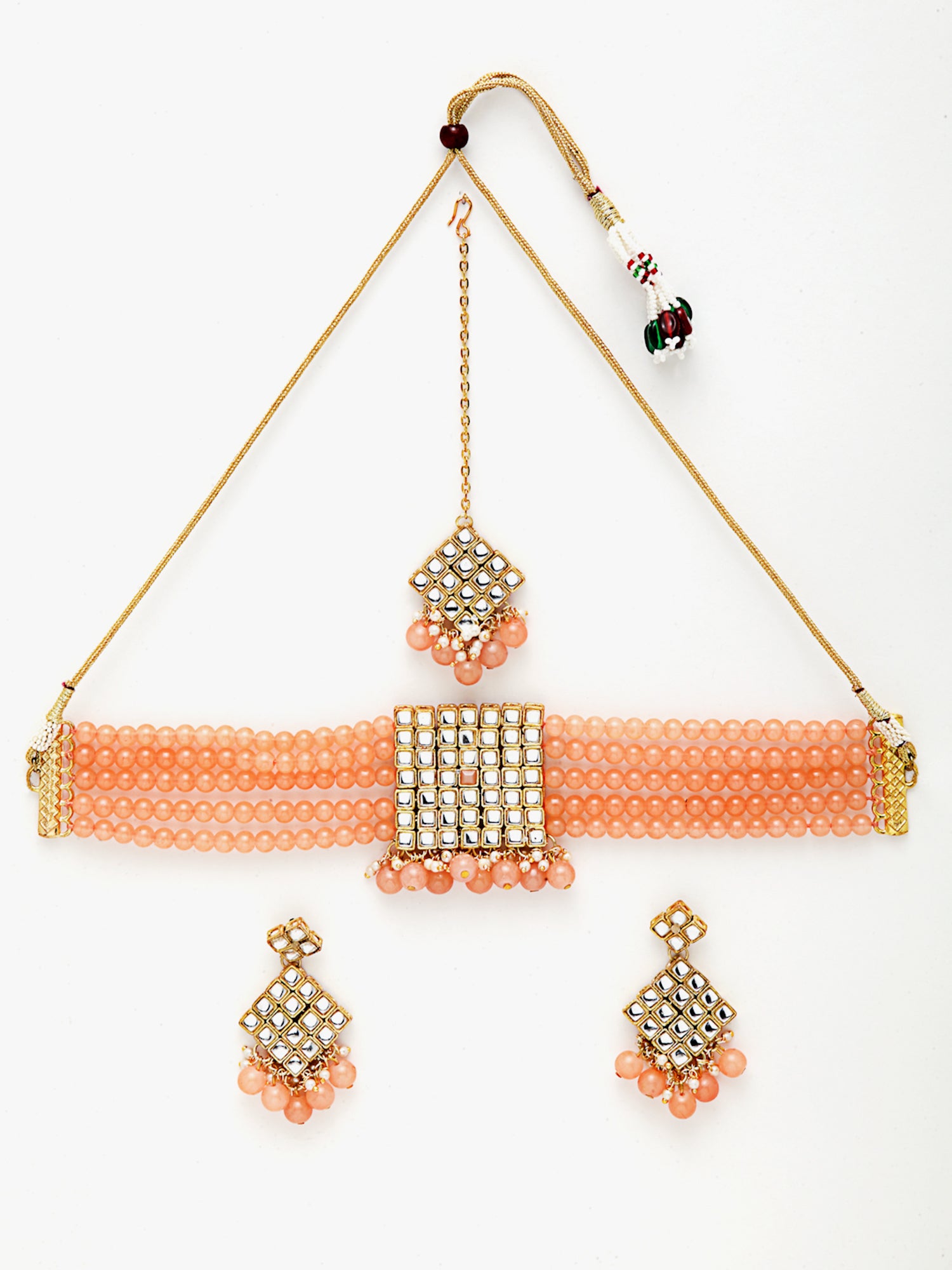 - Karatcart Gold-Plated Embellished Kundan and Peach Beads Handcrafted Choker Necklace with Earrings and Maangtikka. It's Five Layer Micro Gold Plated and Embellished with Kundan for High Durability. Intricate high polish creates glamorous reflections and adds a luxurious look. Perfect for Weddings, Festivals, Traditional Occasions. Best when paired with any Indian outfit.