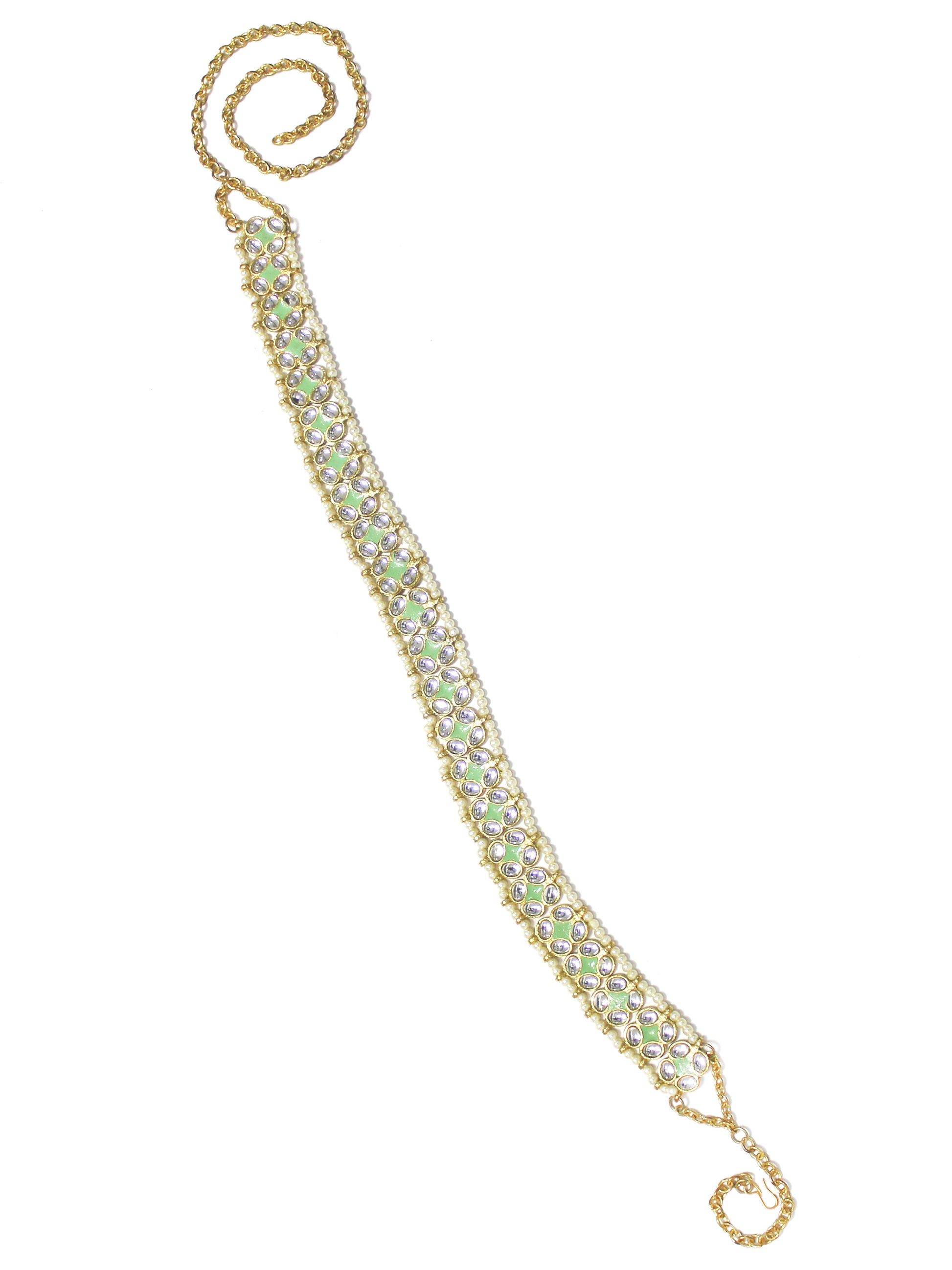 - Gold Plated Lime Green Meena Kundan Hairband. It's Five Layer Micro Gold Plated and Embellished with Kundan for High Durability. Intricate high polish creates glamorous reflections and adds a luxurious look. Perfect for Weddings, Festivals, Traditional Occasions. Best when paired with any Indian outfit.