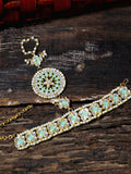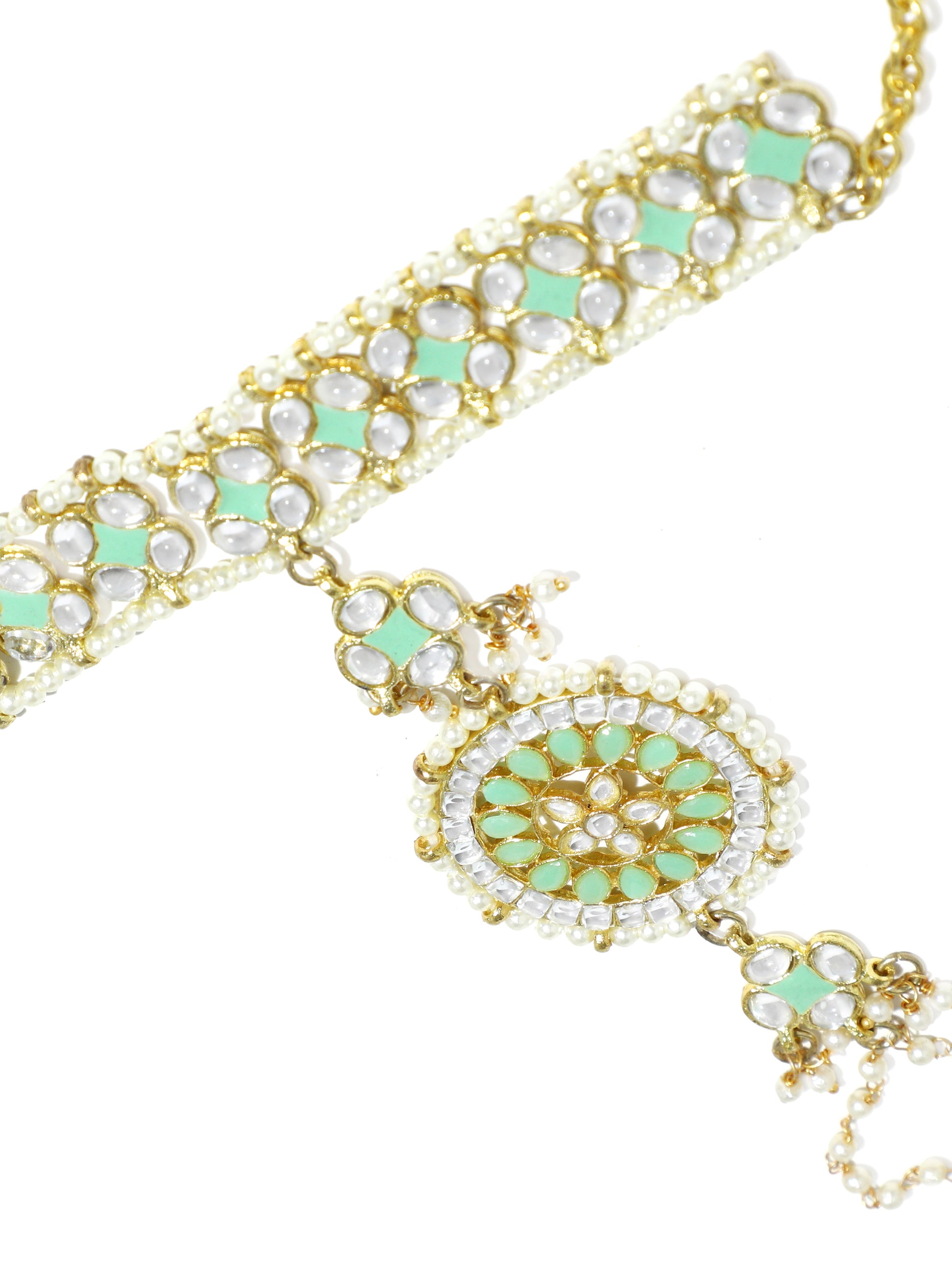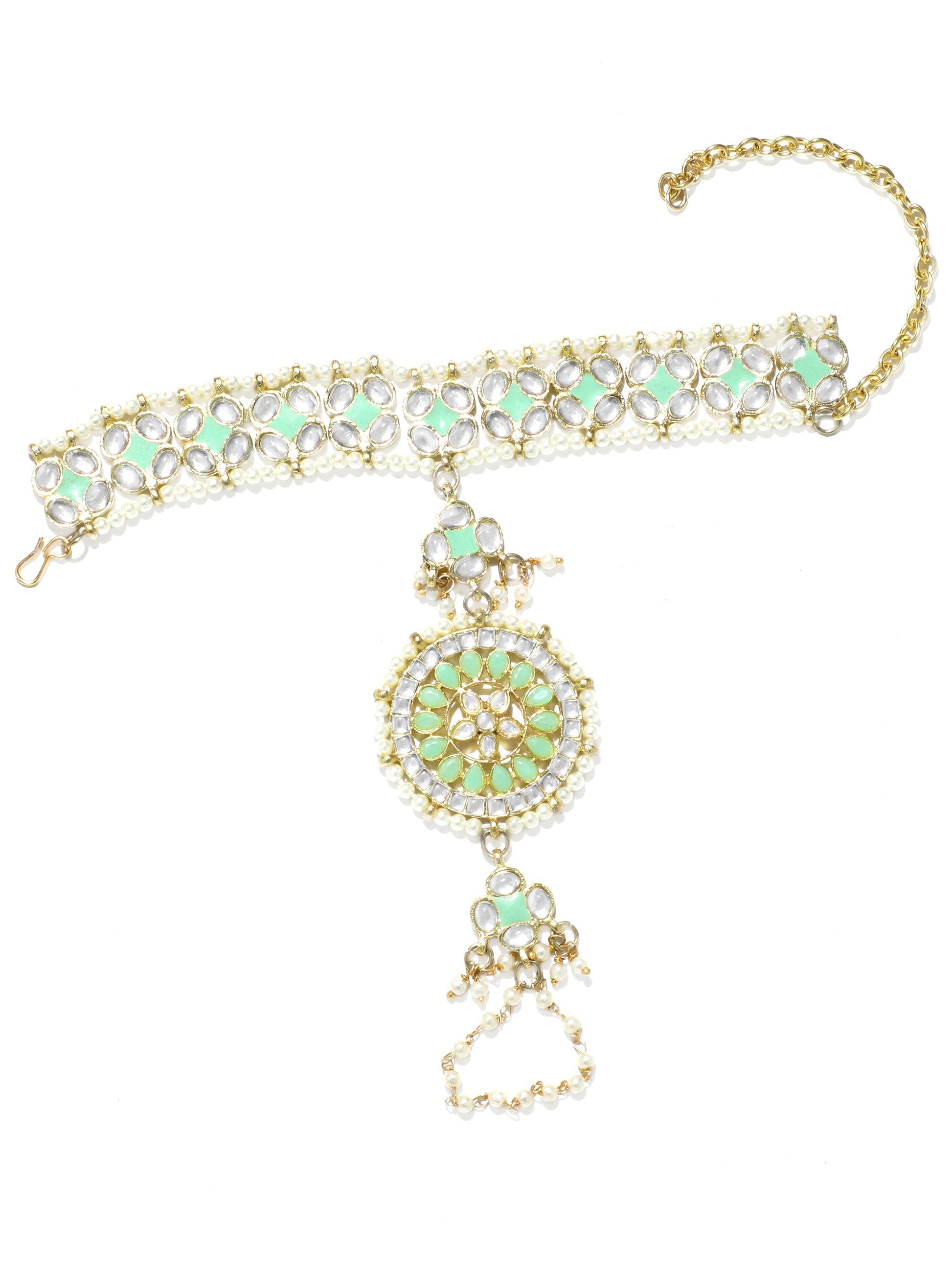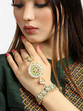 Gold Plated Lime Green Meena Work Kundan Hathphool