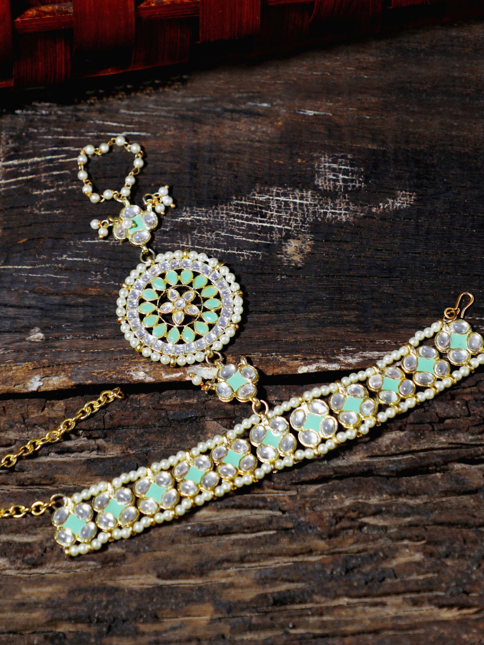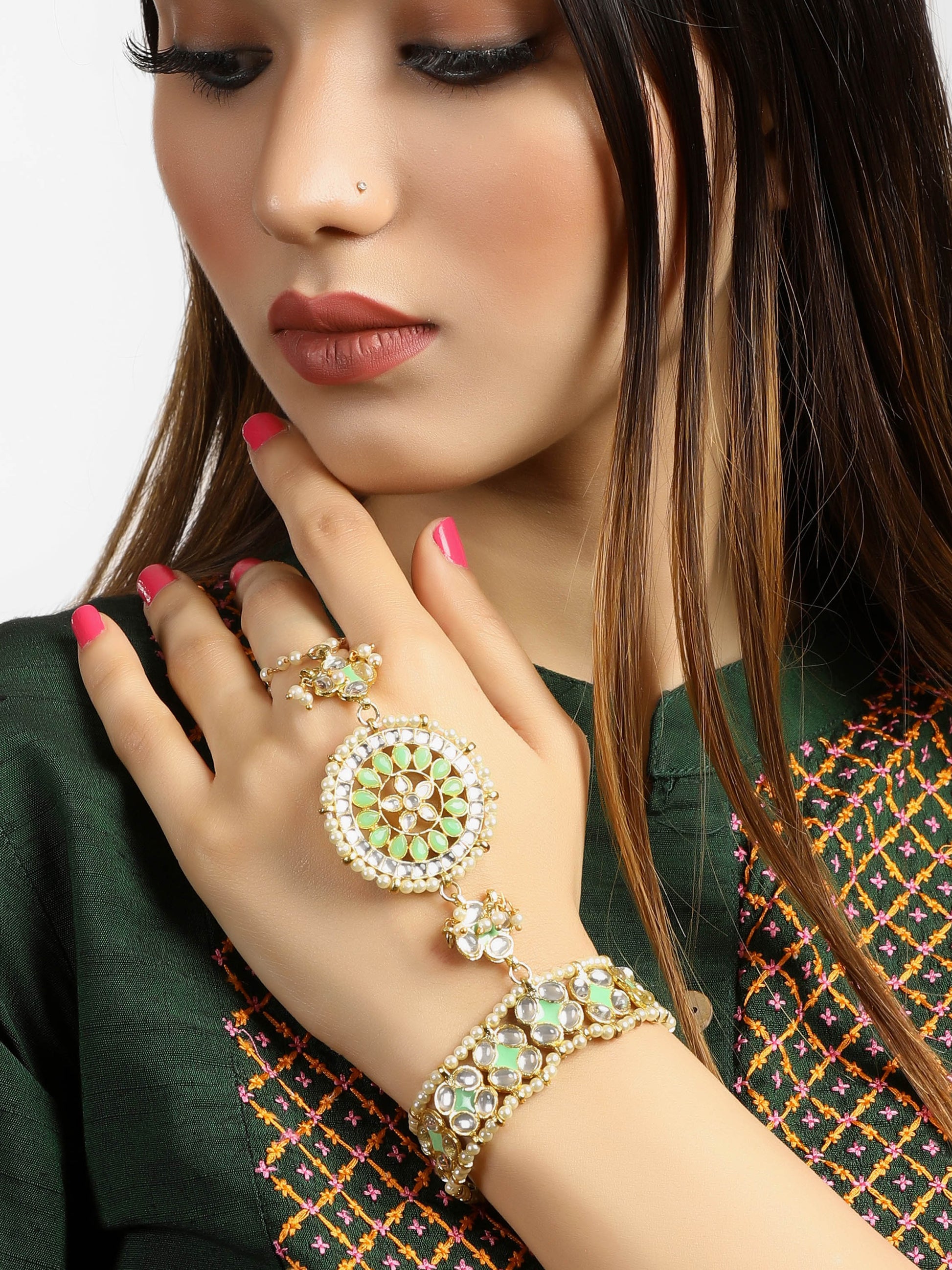 - Gold Plated Lime Green Meena Work Kundan Hathphool for Woman. It's Five Layer Micro Gold Plated and Embellished with Kundan for High Durability. Intricate high polish creates glamorous reflections and adds a luxurious look. Perfect for Weddings, Festivals, Traditional Occasions. Best when paired with any Indian outfit.