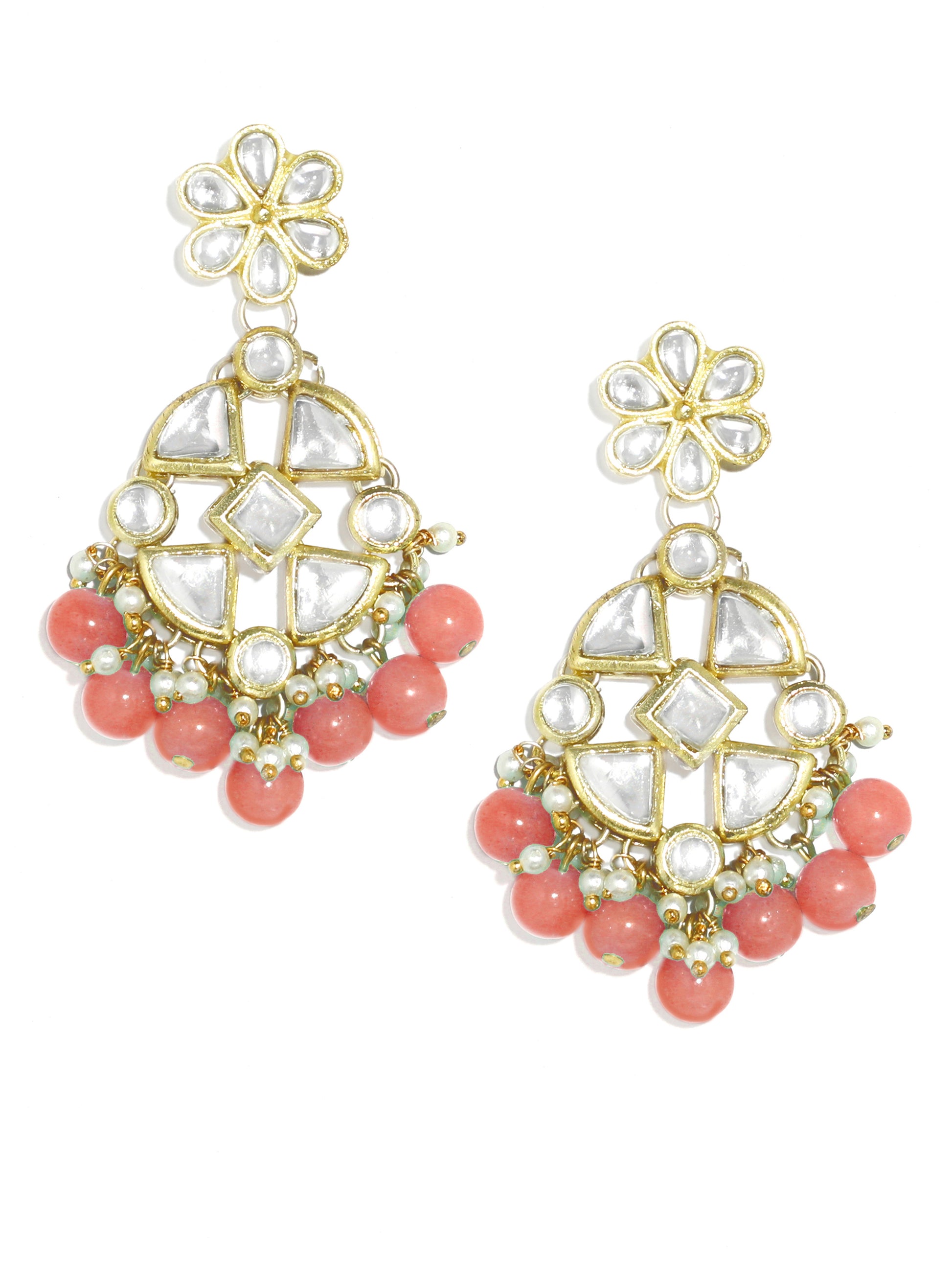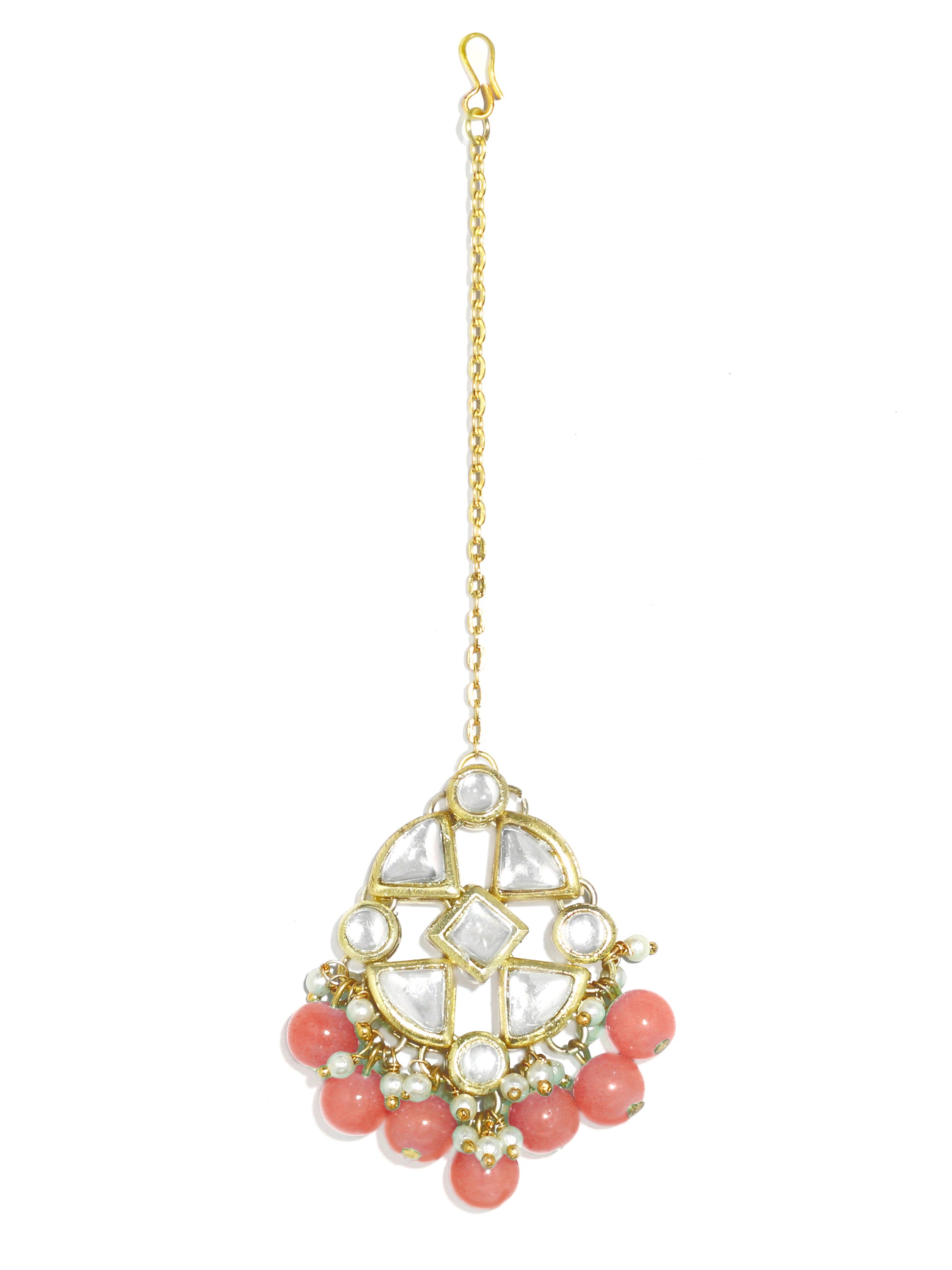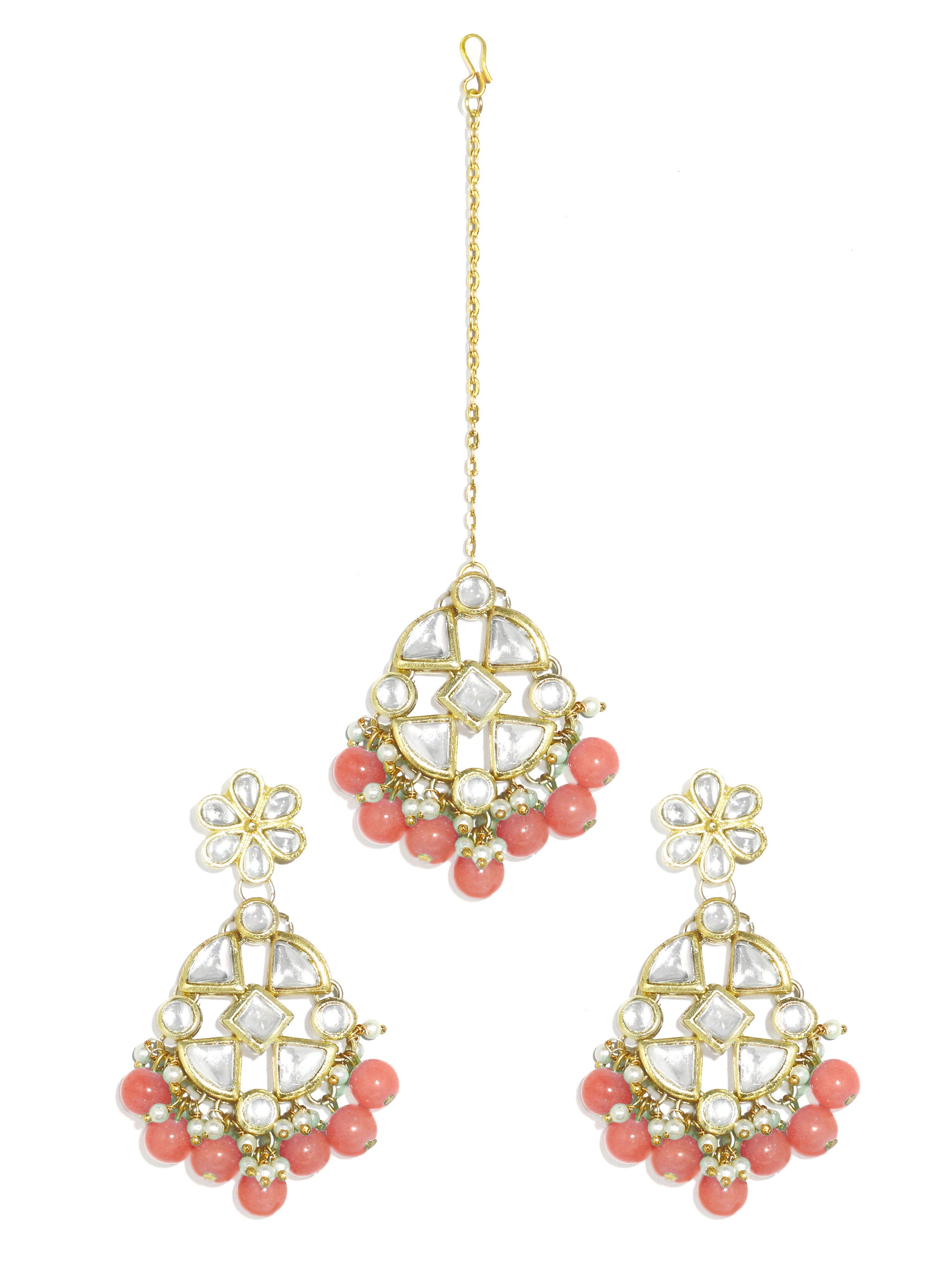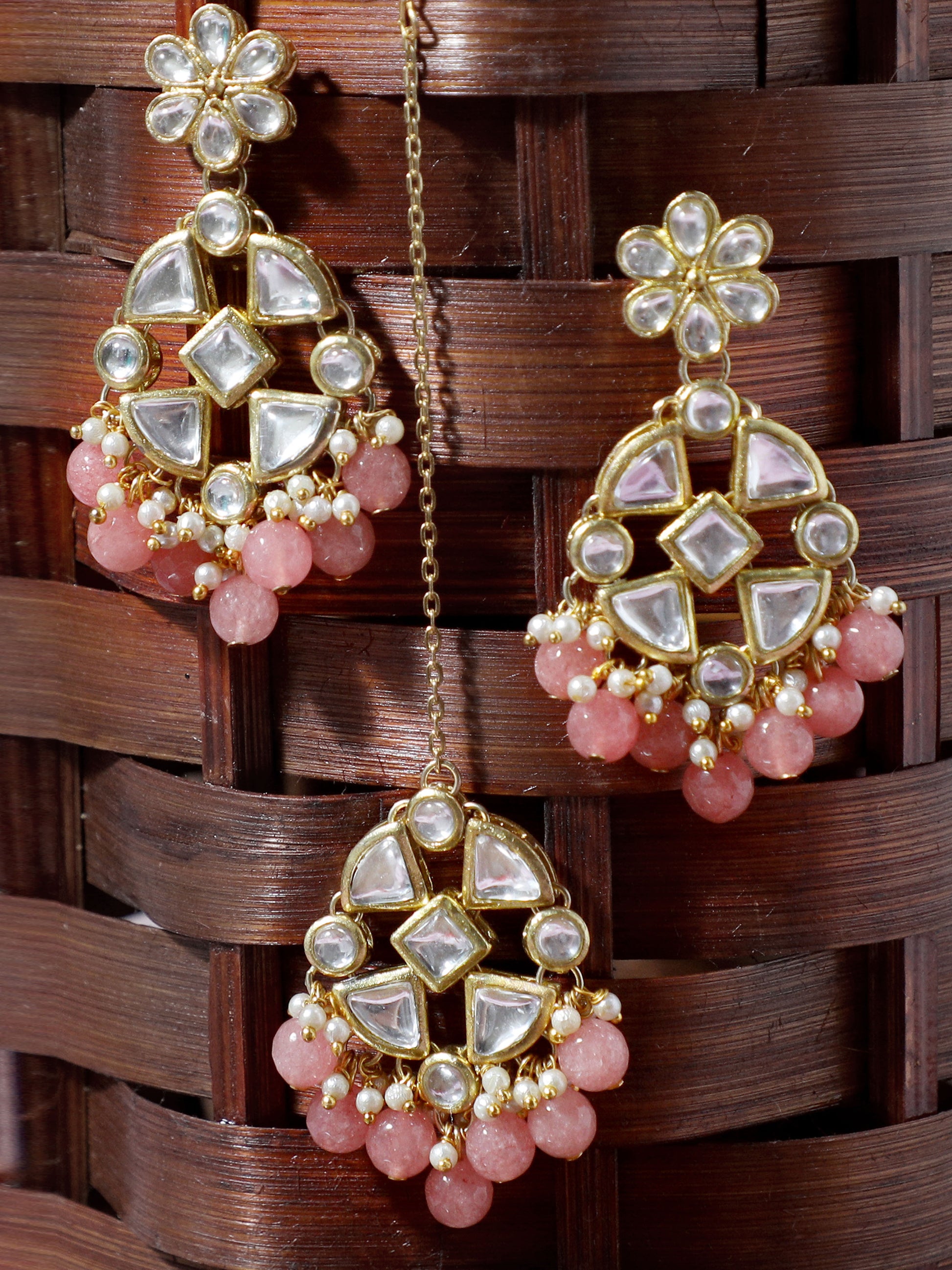 - Gold Plated Pink Beads Kundan Dangler Earrings with Maangtikka for Women. It's Five Layer Micro Gold Plated and Embellished with Kundan for High Durability. Intricate high polish creates glamorous reflections and adds a luxurious look. Perfect for Weddings, Festivals, Traditional Occasions. Best when paired with any Indian outfit.