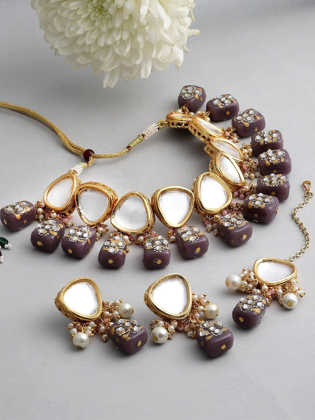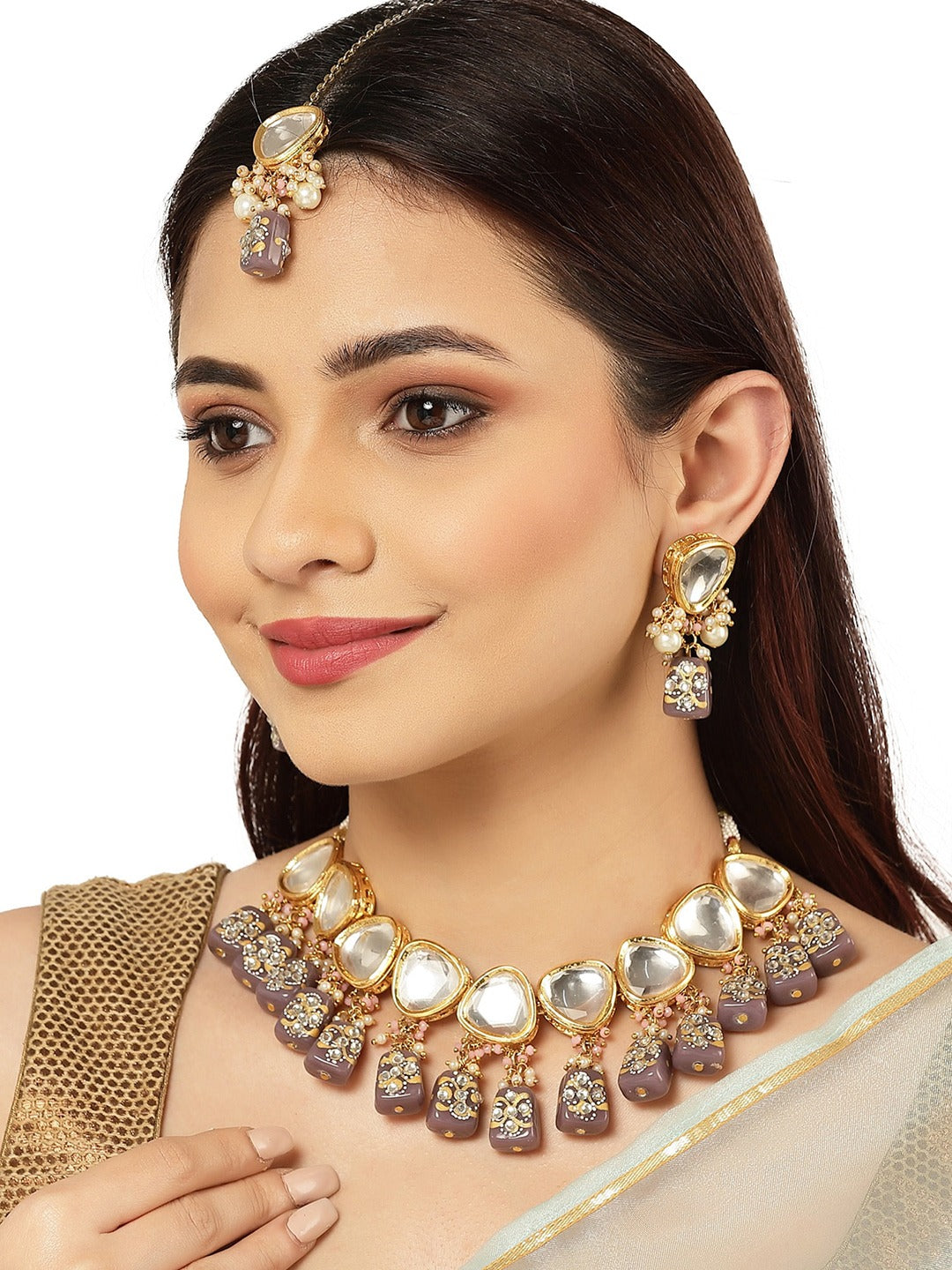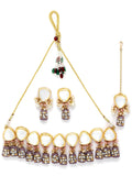 This jewelry set consists of a necklace, a pair of earrings and a maang tikka