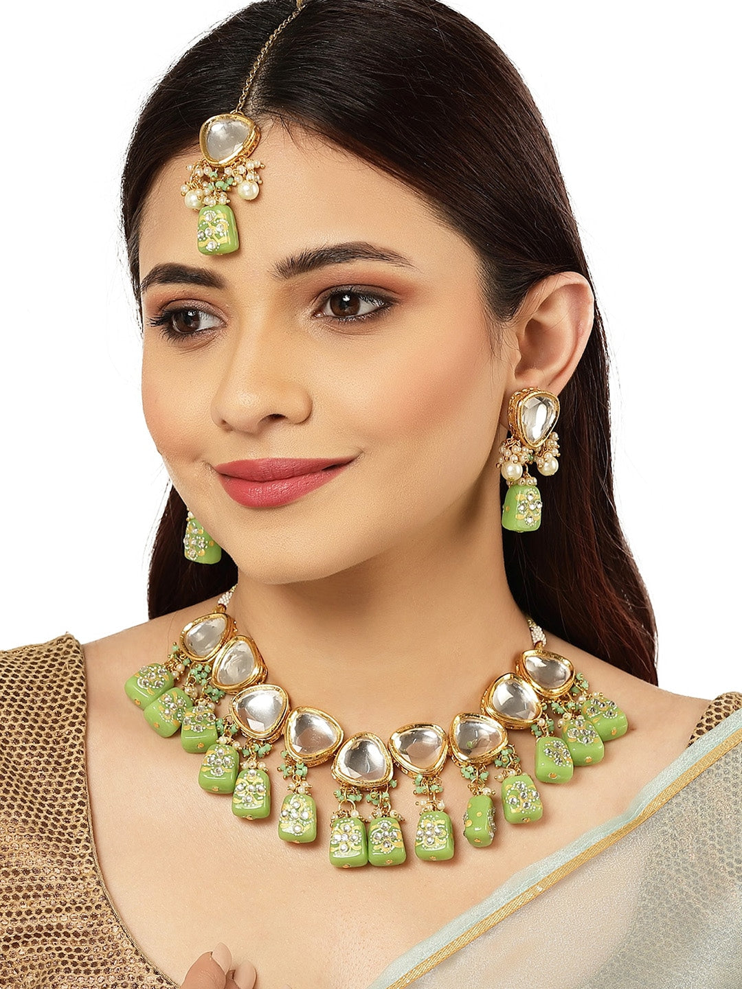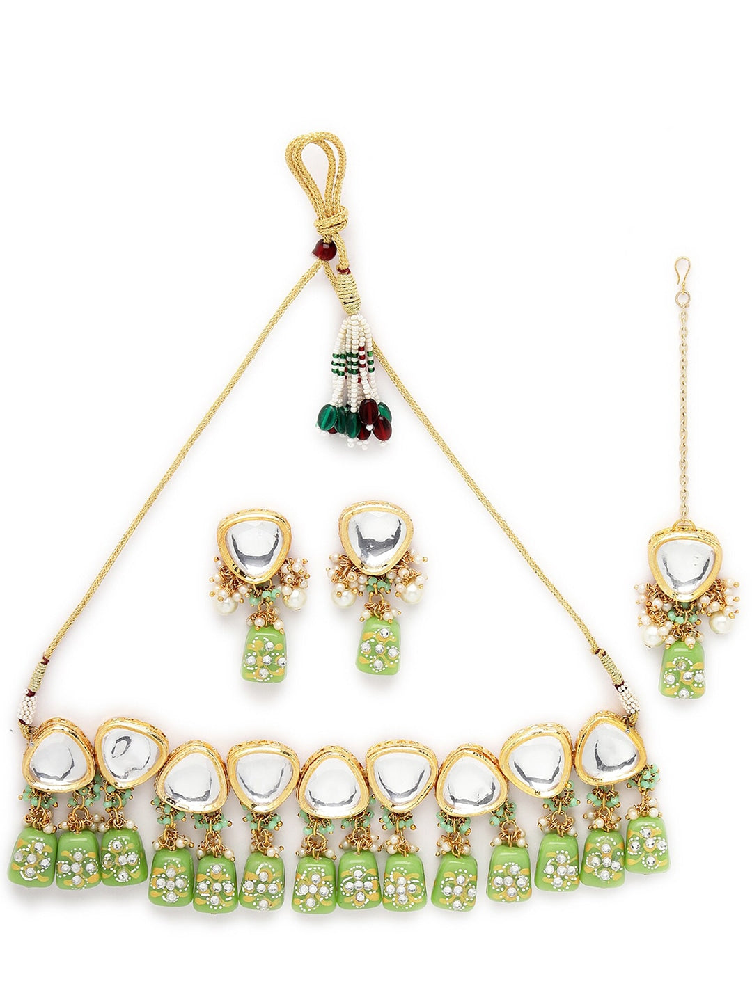 This jewelry set consists of a necklace, a pair of earrings and a maang tikka