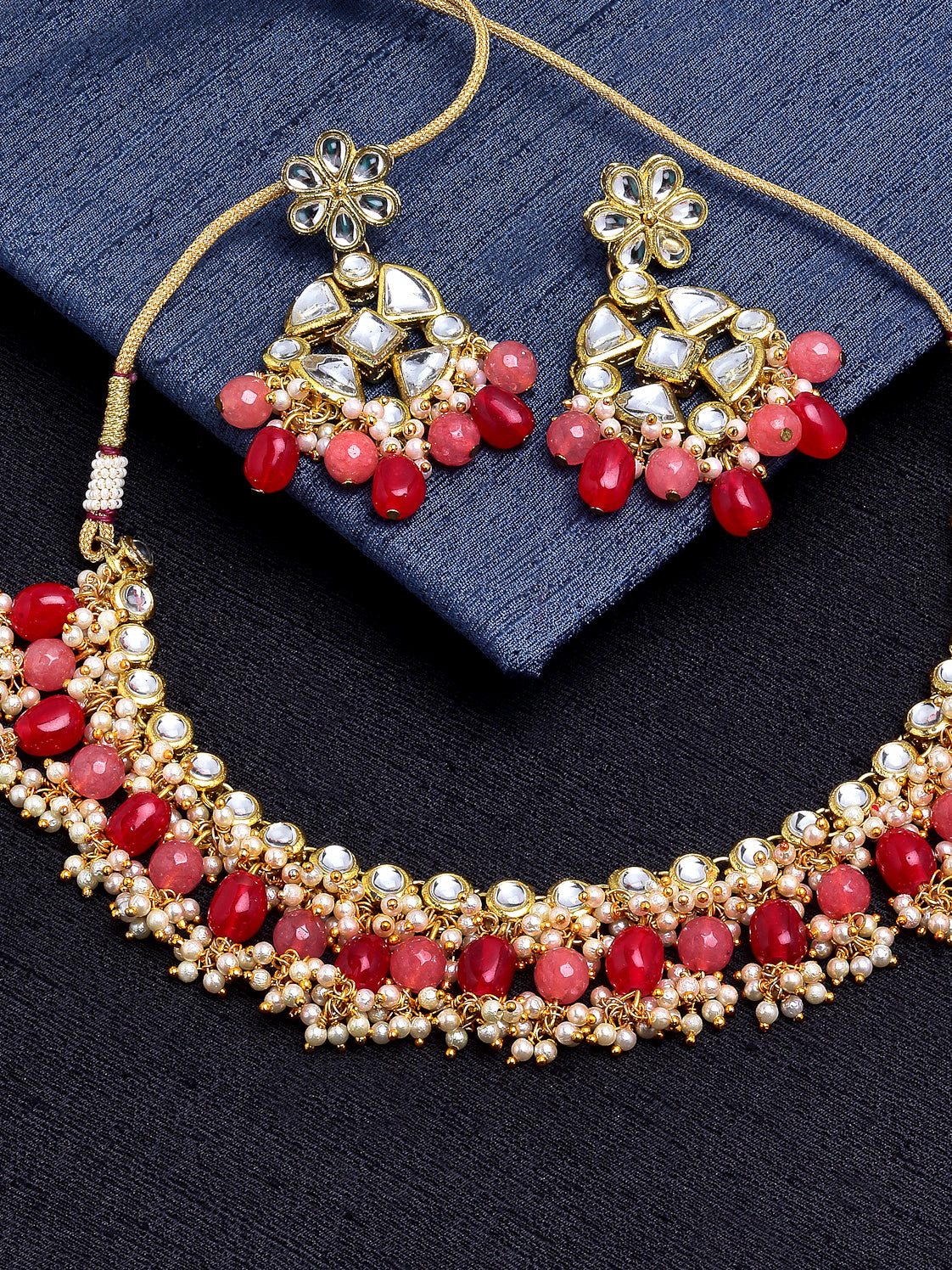 - Traditional Gold Plated Kundan & Red Tumble Stone Studded Necklace Set. It's Five Layer Micro Gold Plated and Embellished with Elegant Kundan for High Durability. Intricate high polish creates glamorous reflections and adds a luxurious look. Perfect for Weddings, Festivals, Traditional Occasions. Best when paired with any Indian outfit.