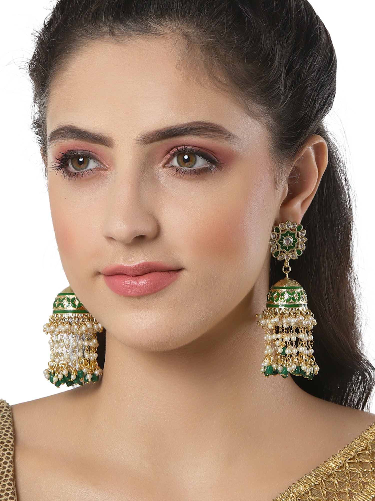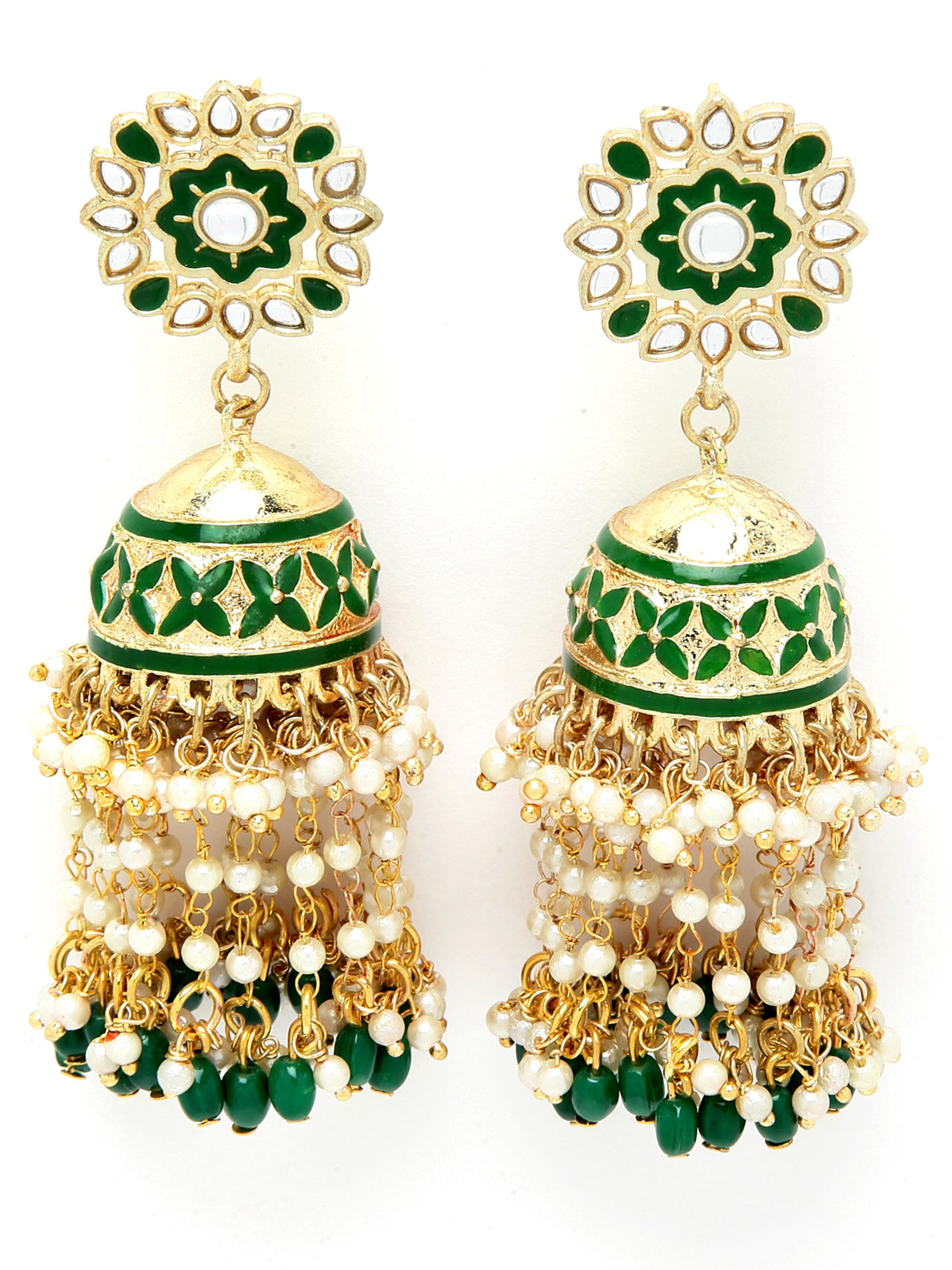 - Green Tumble Stone and Pearl Jhumki Earrings for Women. It is a High-Quality Oxidised Silver Jewellery Embellished with Kundan. Perfect for Weddings, Party, Festivals, Traditional Occasions.