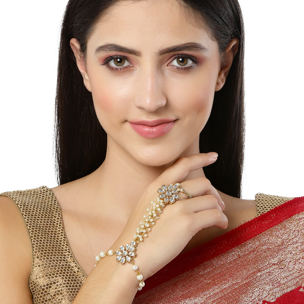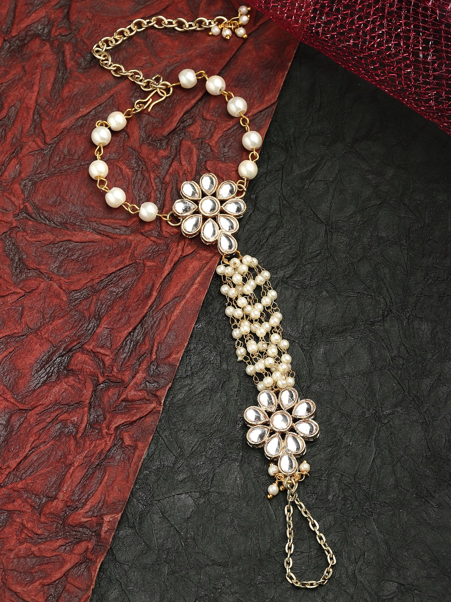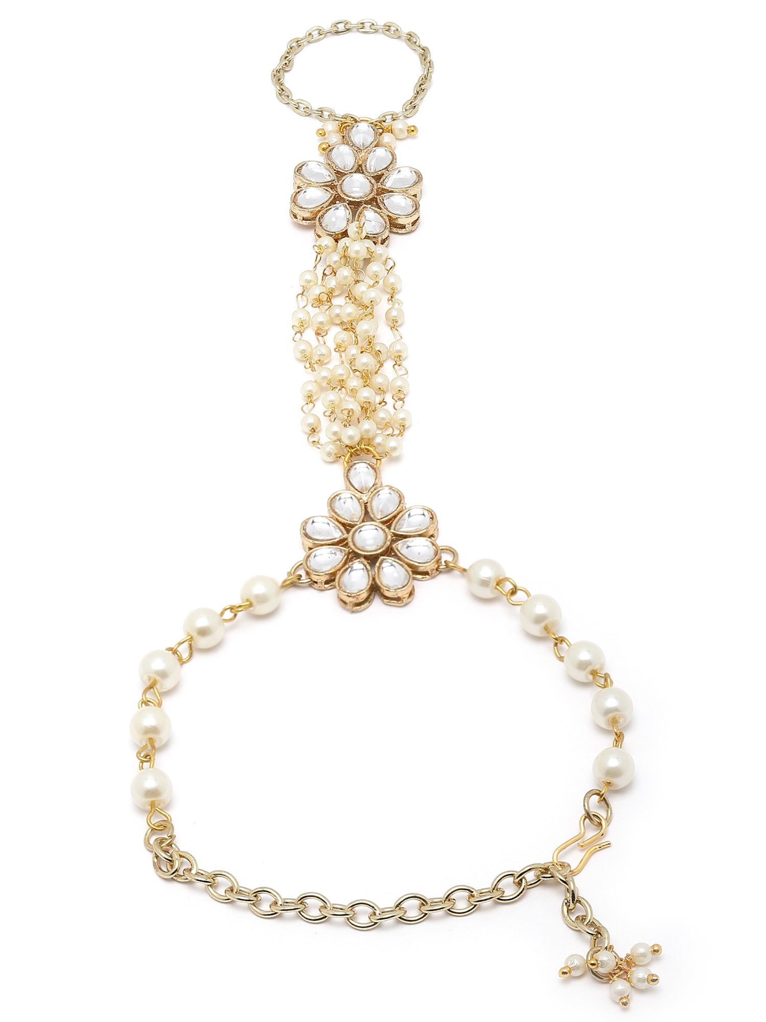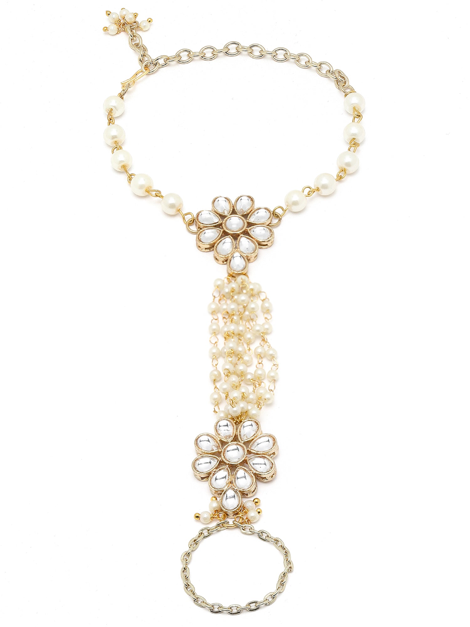 - Karacart Gold Plated Pearl and Floral Kundan Hathphool for Women. It's Five Layer Micro Gold Plated and Embellished with Kundan for High Durability. Intricate high polish creates glamorous reflections and adds a luxurious look. Perfect for Weddings, Festivals, Traditional Occasions. Best when paired with any Indian outfit.