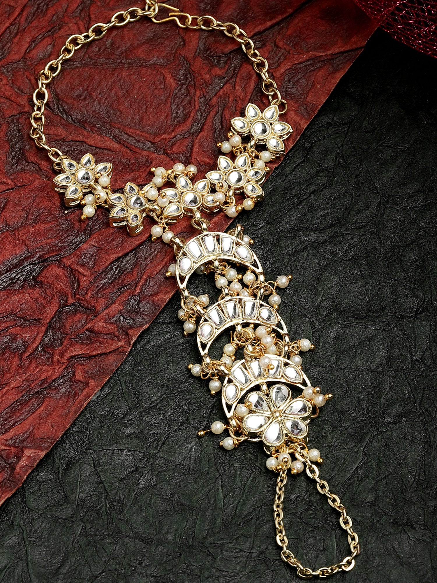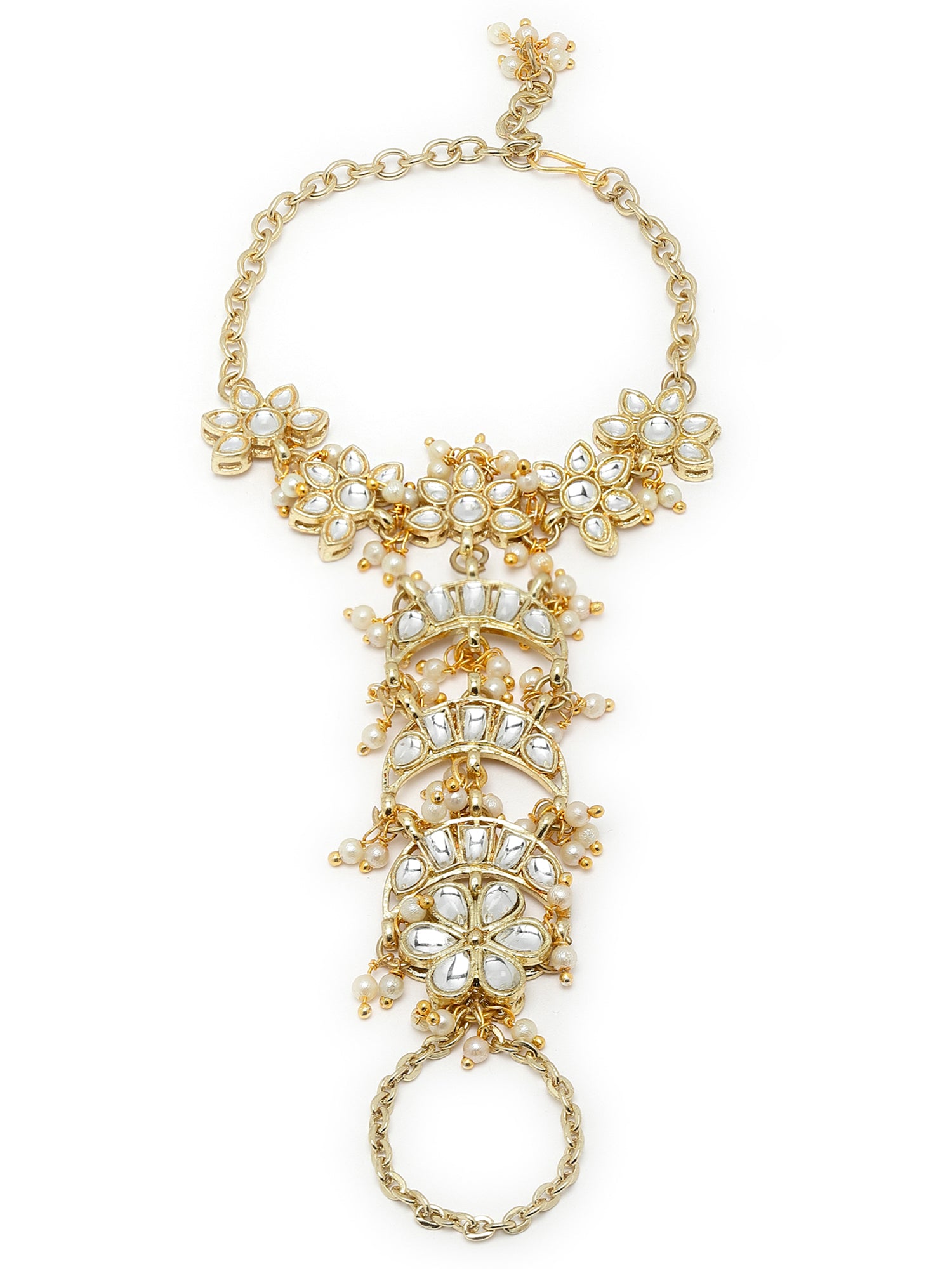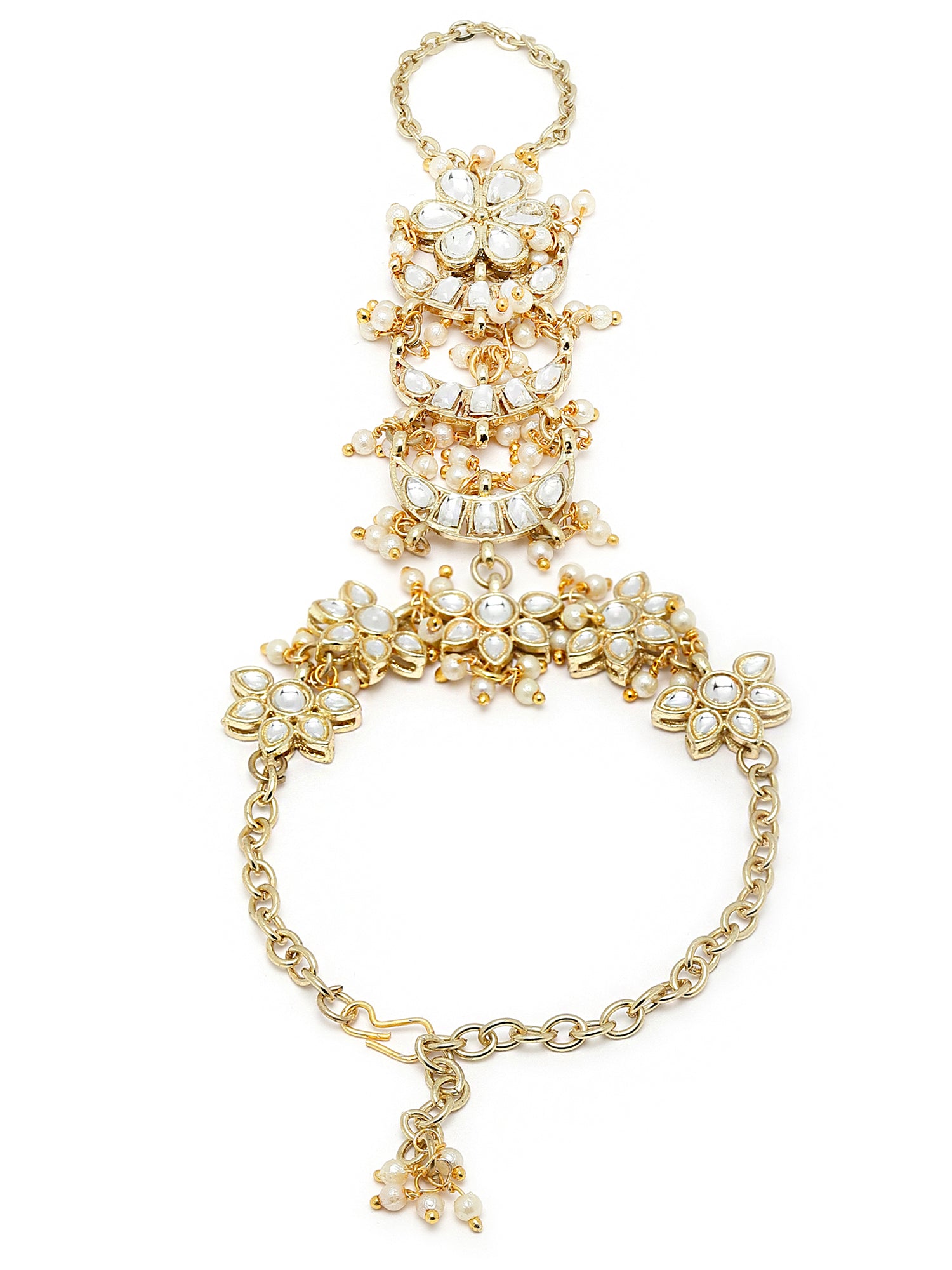 - Karacart Gold Plated Pearl and Moon Shape Kundan Hathphool for Women. It's Five Layer Micro Gold Plated and Embellished with Kundan for High Durability. Intricate high polish creates glamorous reflections and adds a luxurious look. Perfect for Weddings, Festivals, Traditional Occasions. Best when paired with any Indian outfit.
