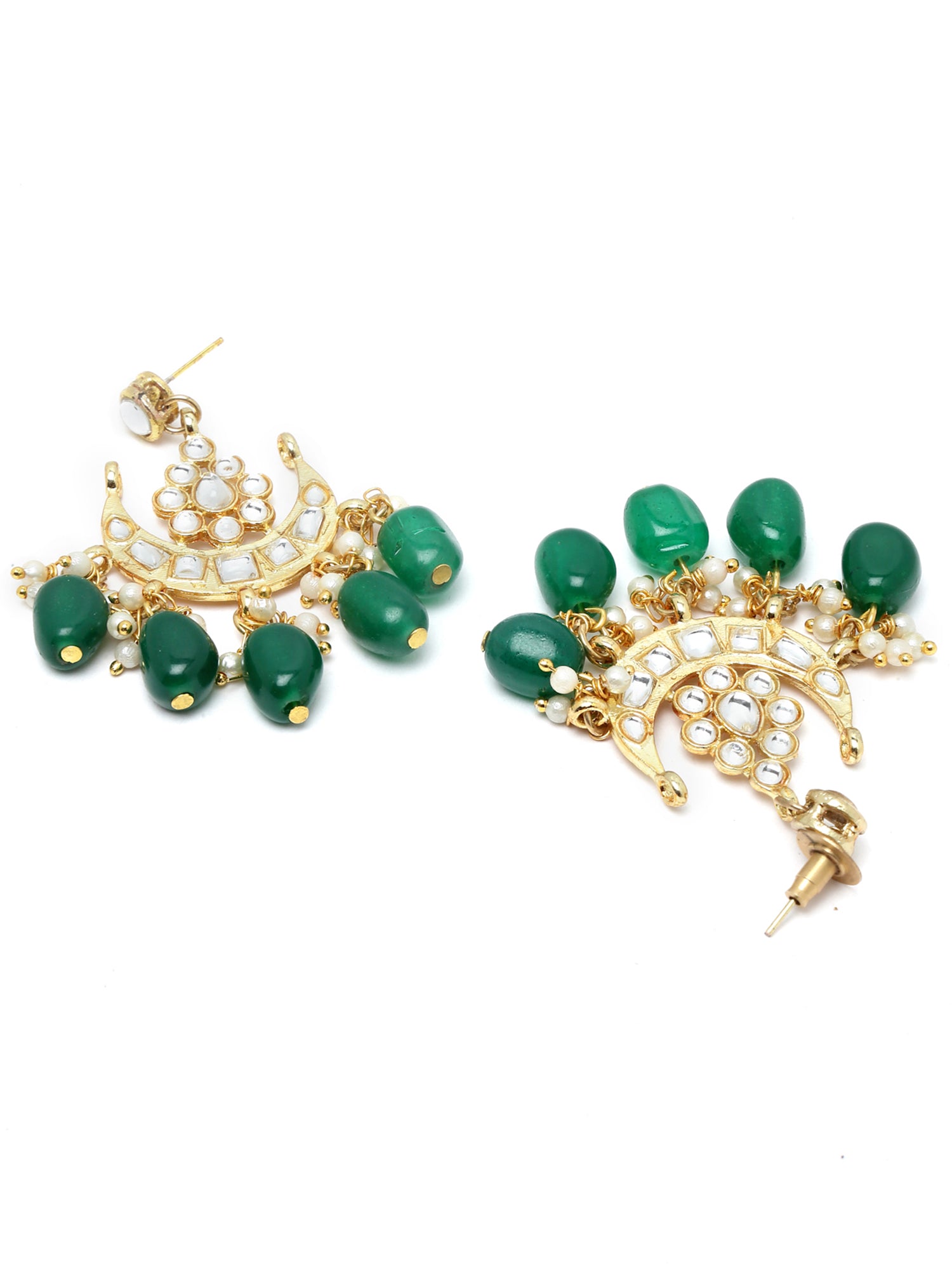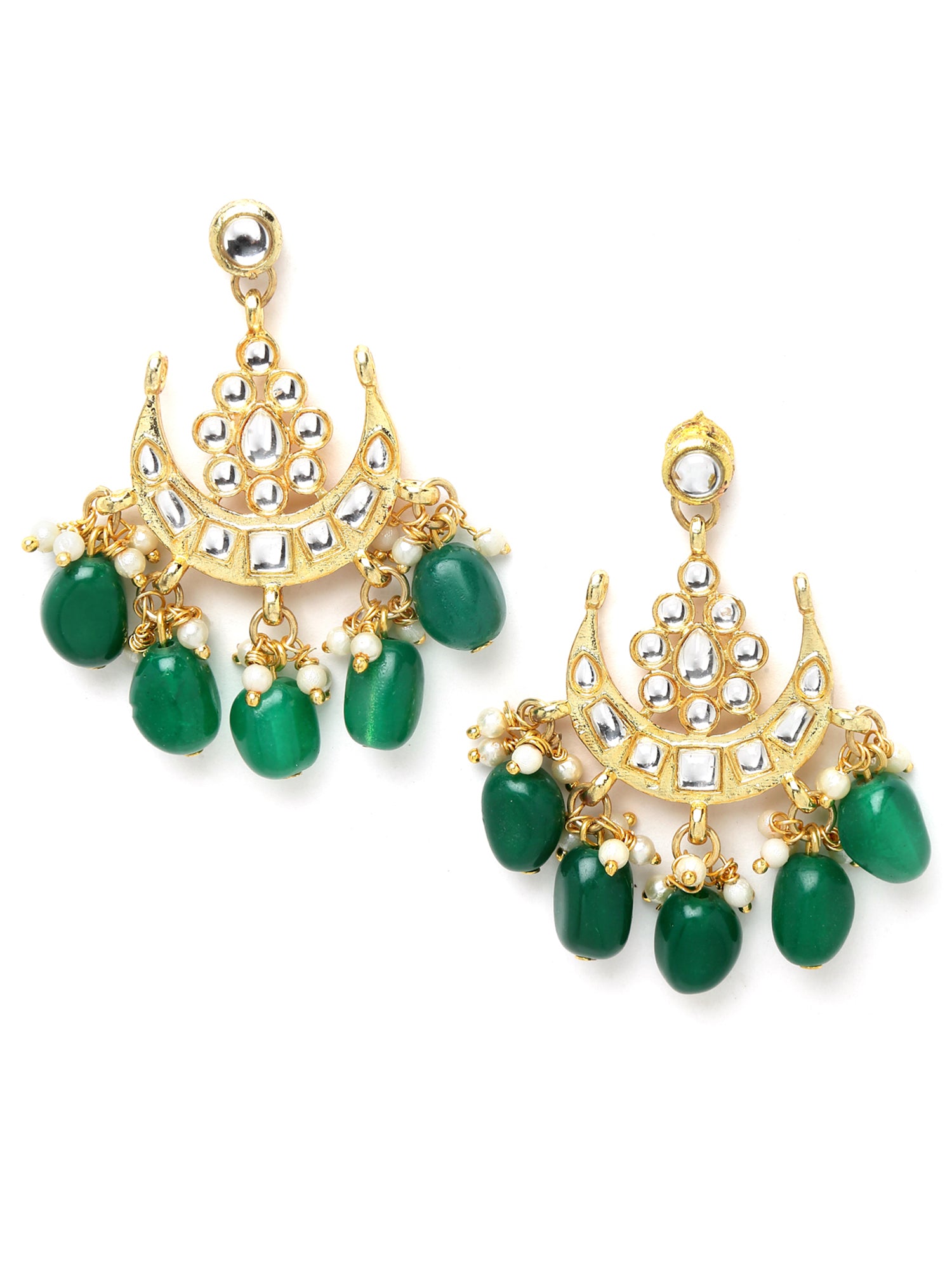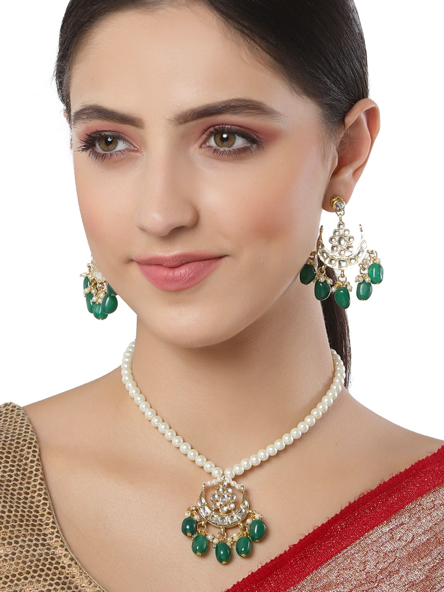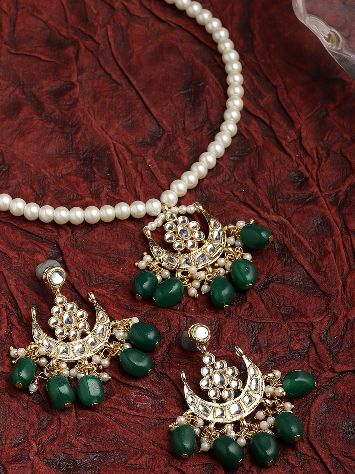 - Karatcart Gold Plated Green Tumble Moon Shape Kundan Neckalce Set. It is made with high-quality Kundan Stones which makes them very skin-friendly. Perfect for Weddings, Parties, Festivals, and Traditional Occasions. Gracefully pair Saree, Kurti, or any Indo-western outfit to enhance your look. These are made from toxic-free materials which are Anti-Allergic and Safe for the skin.
