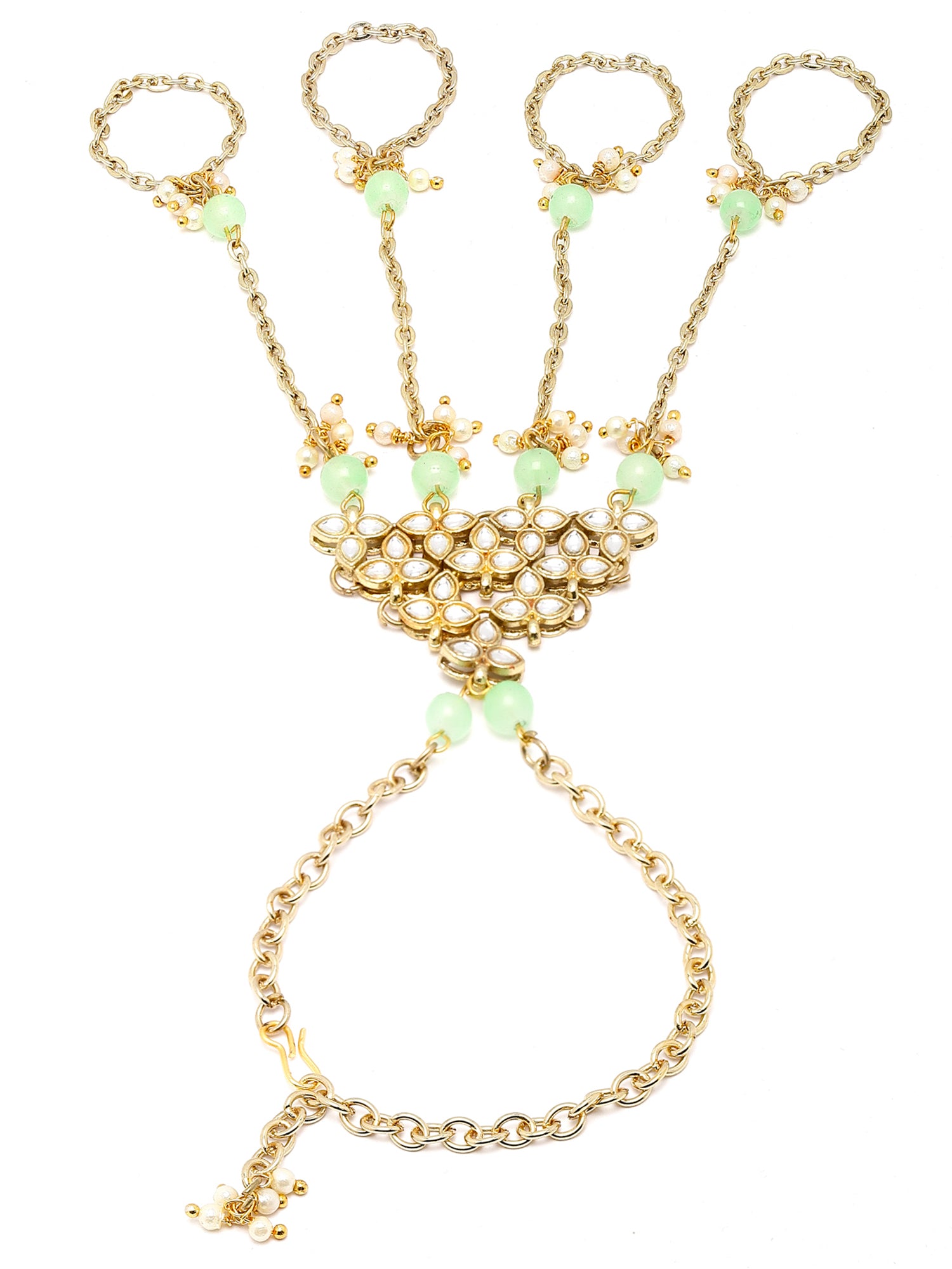 - Karatcart Gold Plated Light Green Beads Kundan Hathphool for Women. It's Five Layer Micro Gold Plated and Embellished with Kundan for High Durability. Intricate high polish creates glamorous reflections and adds a luxurious look. Perfect for Weddings, Festivals, Traditional Occasions. Best when paired with any Indian outfit.