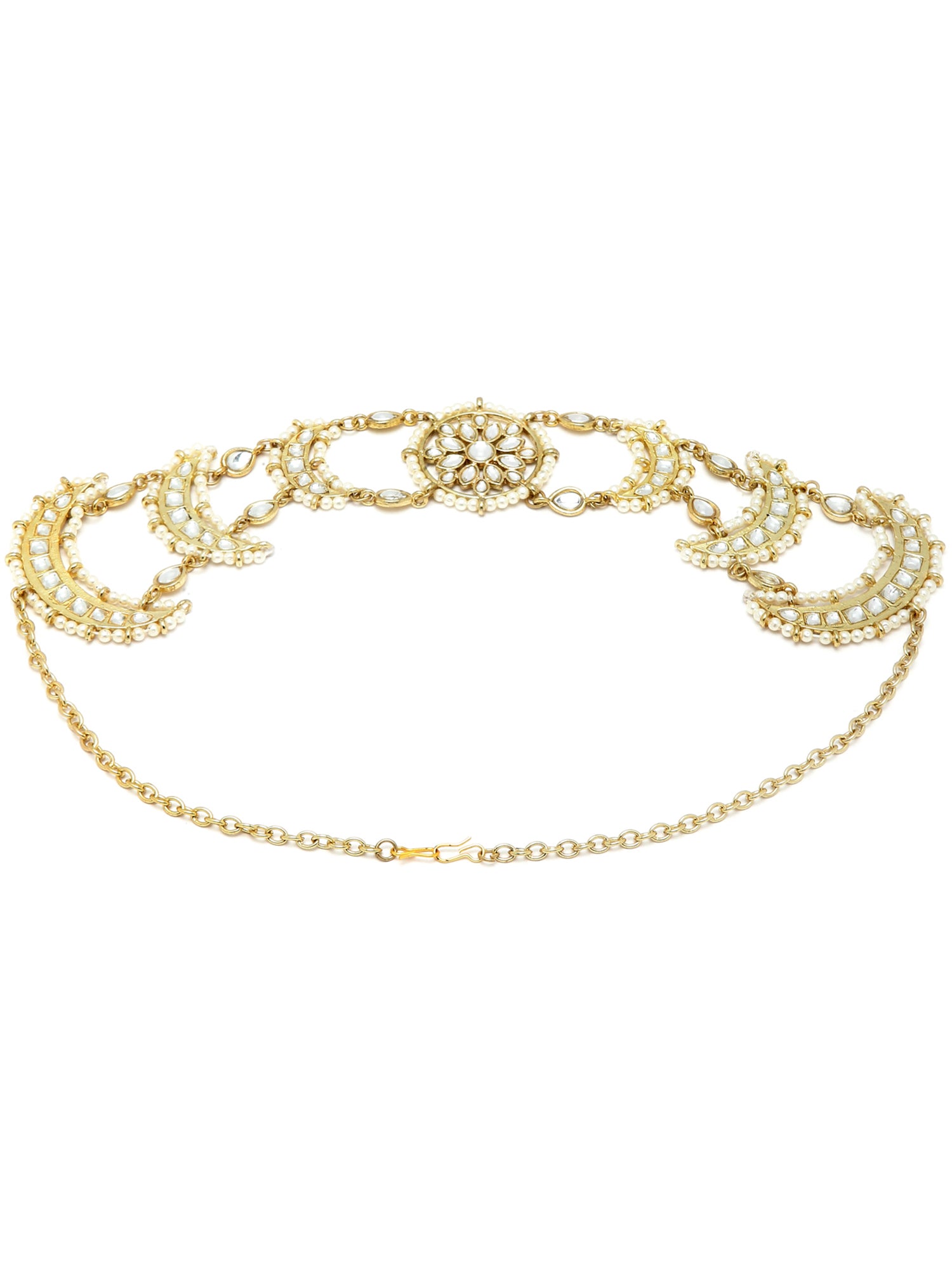 - Karatcart Gold Plated Moon Shape Kundan Studded Handcrafted Hairband for Women. It's Five Layer Embellished with Kundan for High Durability. Intricate high polish creates glamorous reflections and adds a luxurious look. Perfect for Weddings, Festivals, Traditional Occasions. Best when paired with any Indian outfit.
