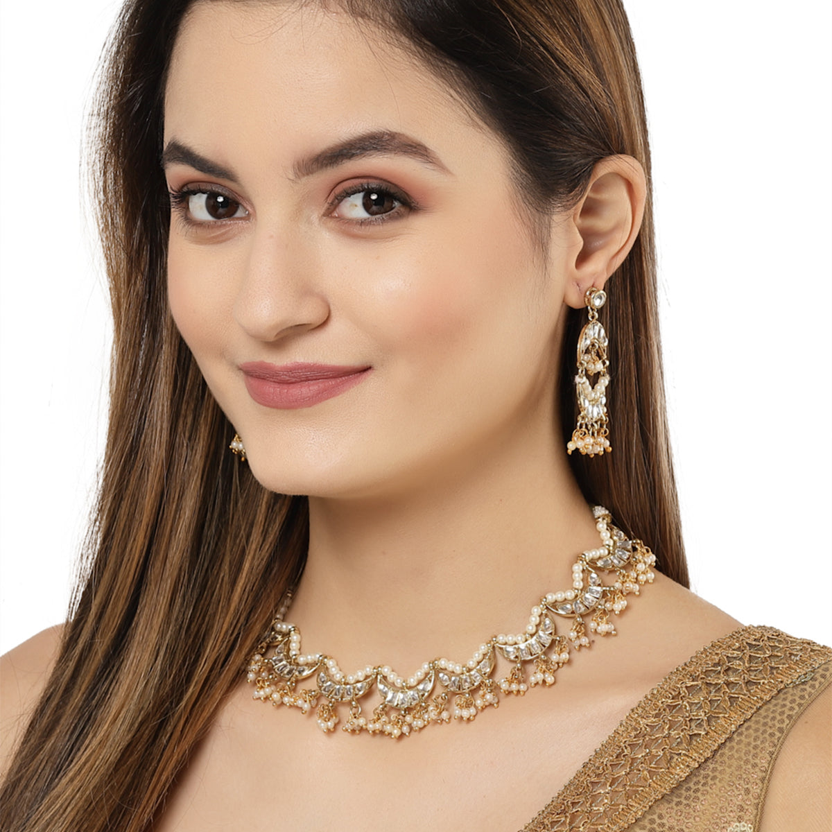 - Karatcart Gold Plated Moon Shaped white Kundan Neckalce Set. It is made with high-quality Kundan Stones which makes them very skin-friendly. Perfect for Weddings, Parties, Festivals, and Traditional Occasions. Gracefully pair Saree, Kurti, or any Indo-western outfit to enhance your look. These are made from toxic-free materials which are Anti-Allergic and Safe for the skin.