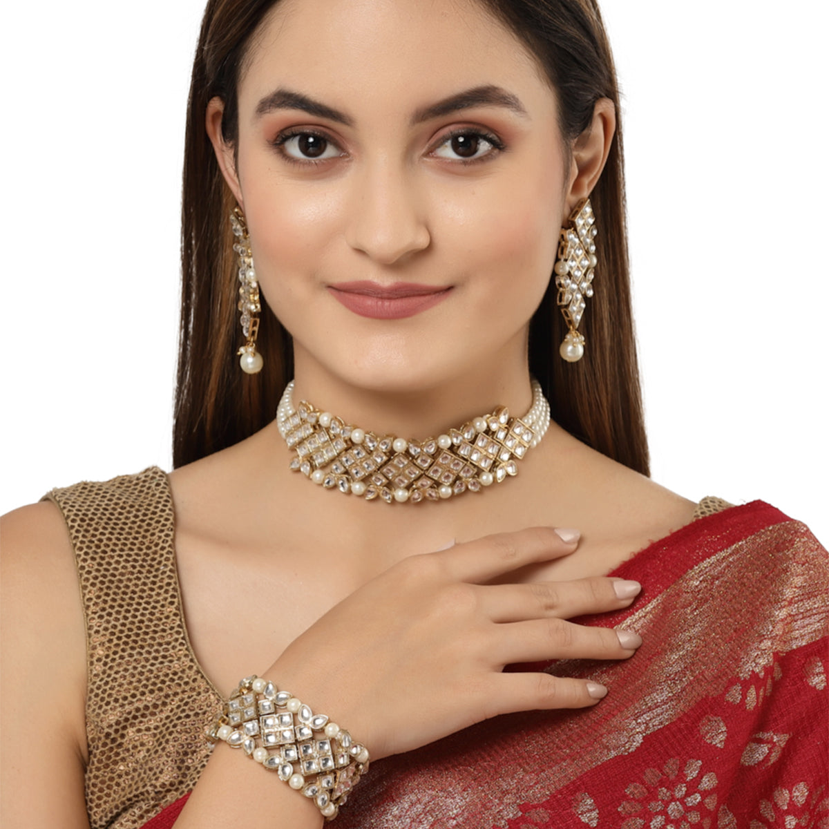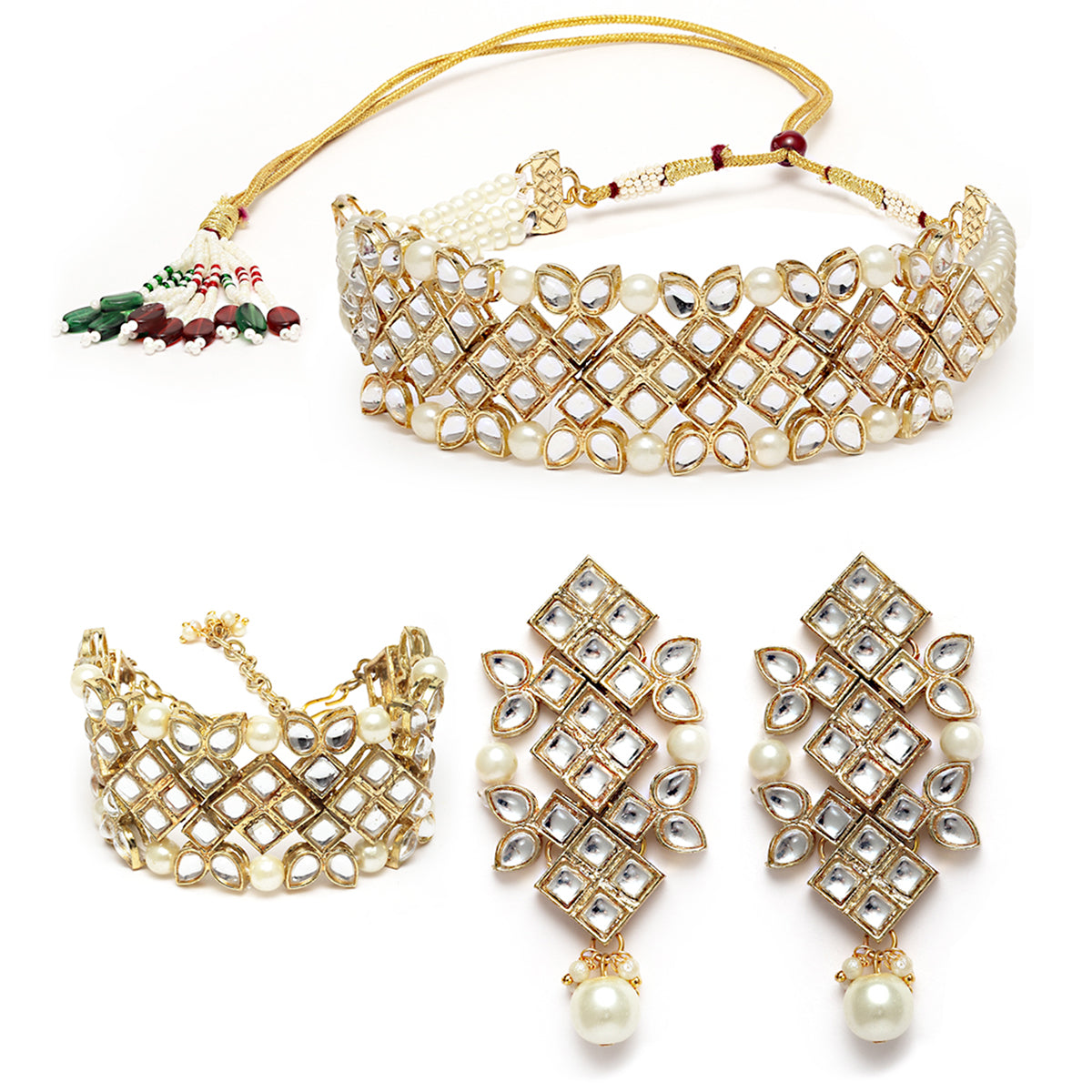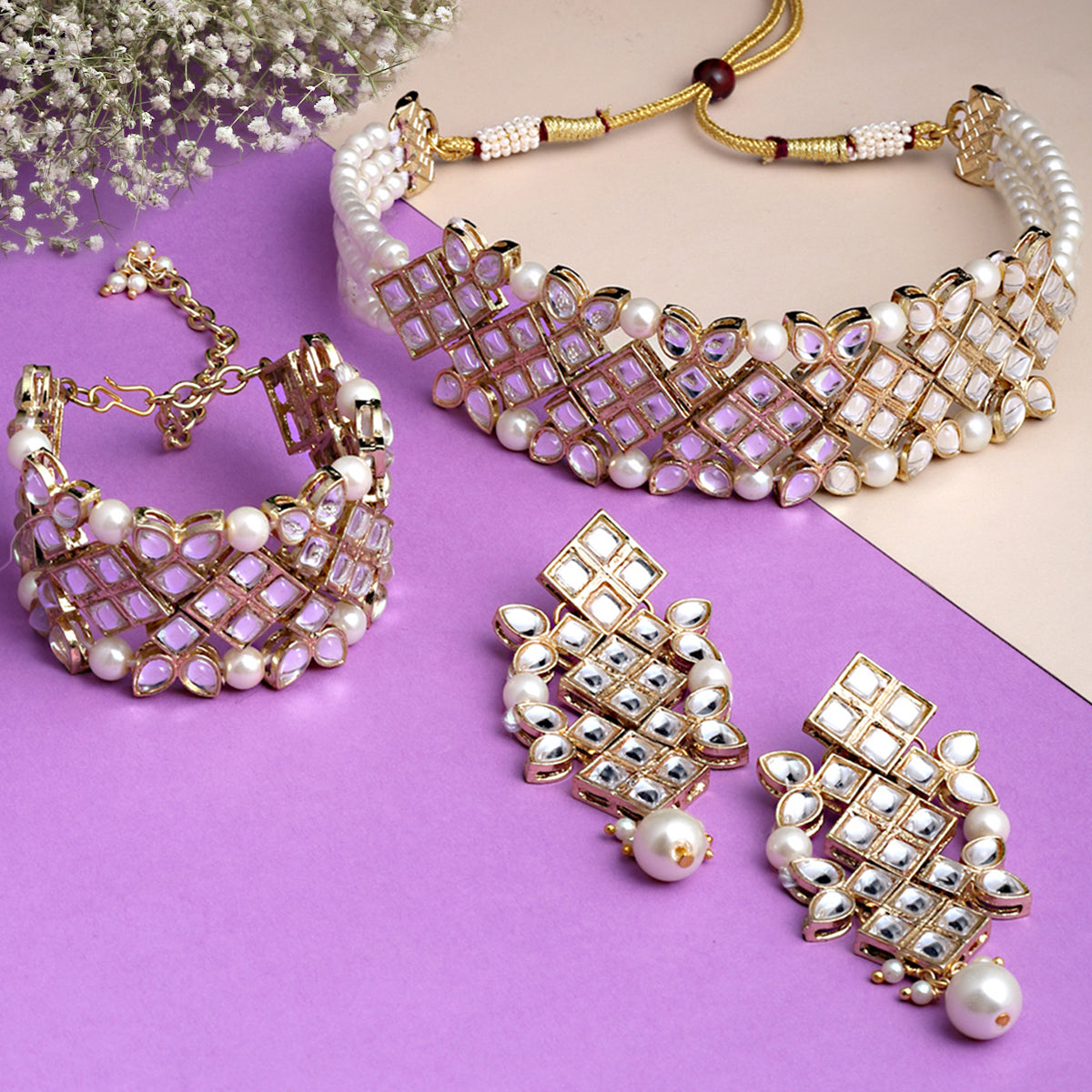 - Karatcart Gold Plated Pearl Beaded Choker Necklace Set with Bracelet. It is made with high-quality Kundan Stones which makes them very skin-friendly. Perfect for Weddings, Parties, Festivals, and Traditional Occasions. Gracefully pair Saree, Kurti, or any Indo-western outfit to enhance your look. These are made from toxic-free materials which are Anti-Allergic and Safe for the skin.