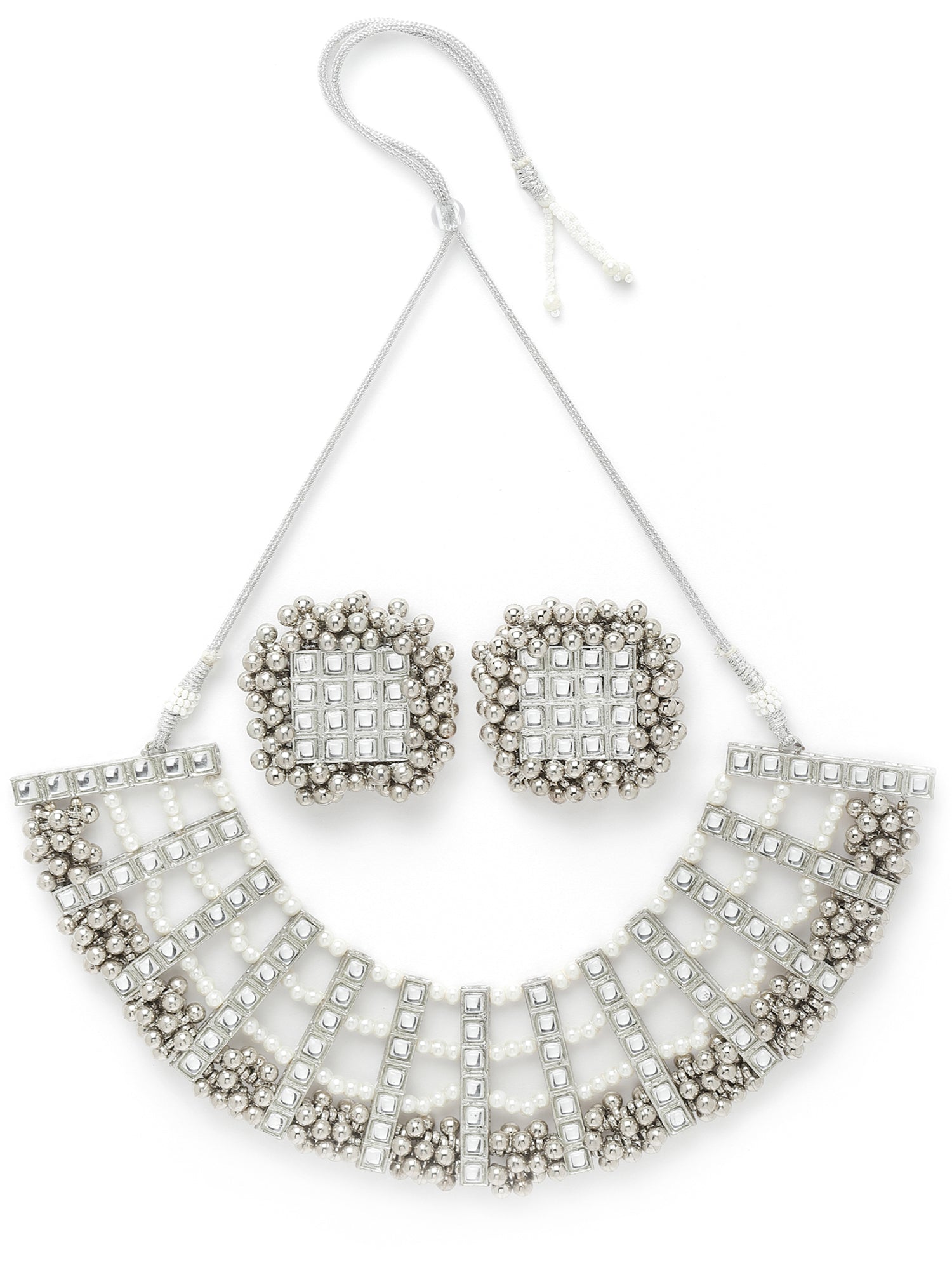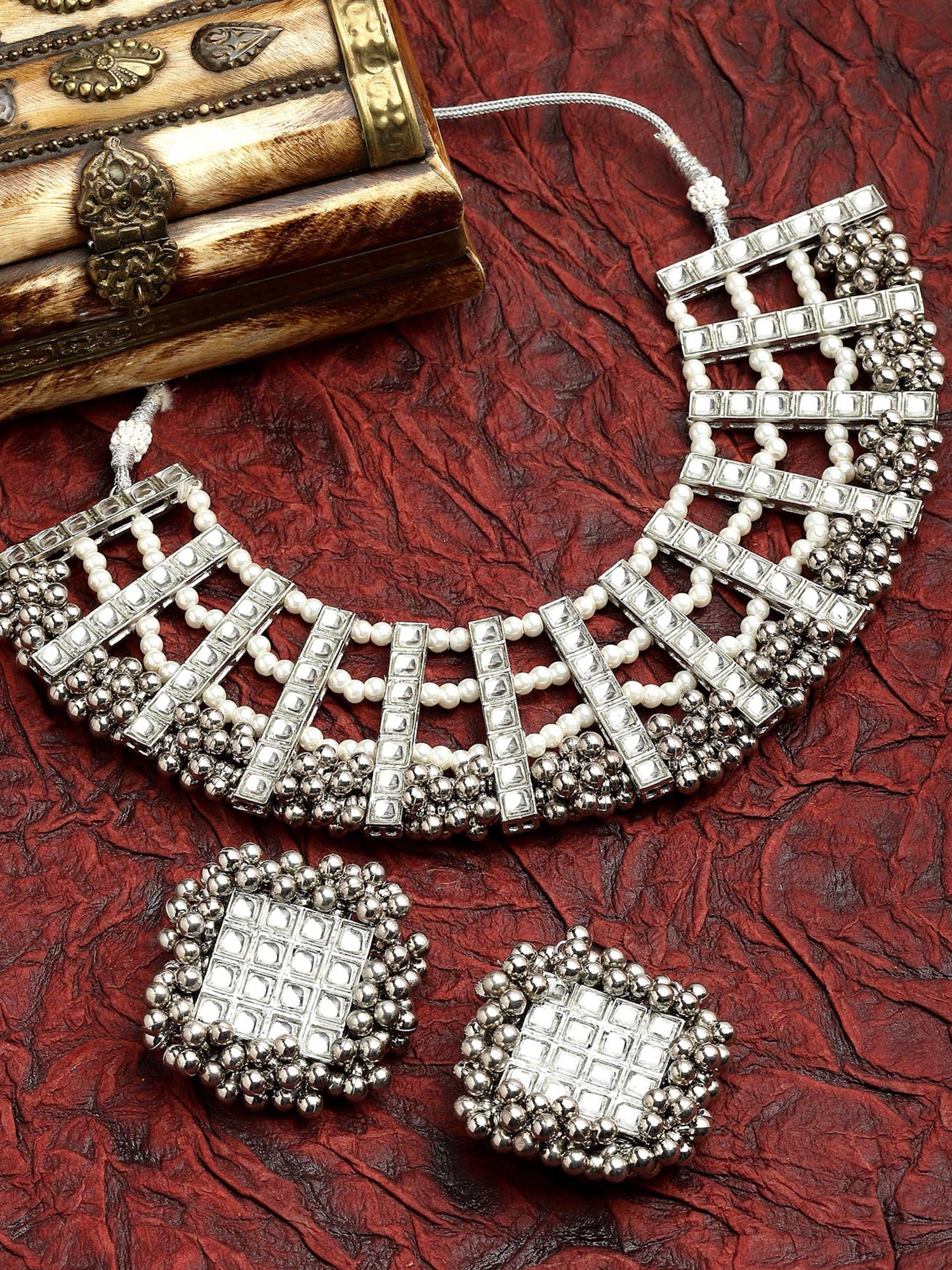 - Karatcart Handcrafted Oxidised Silver Kundan Choker Necklace Set . It is made with high-quality Kundan Stones which makes them very skin-friendly. Perfect for Weddings, Parties, Festivals, and Traditional Occasions. Gracefully pair Saree, Kurti, or any Indo-western outfit to enhance your look. These are made from toxic-free materials which are Anti-Allergic and Safe for the skin.