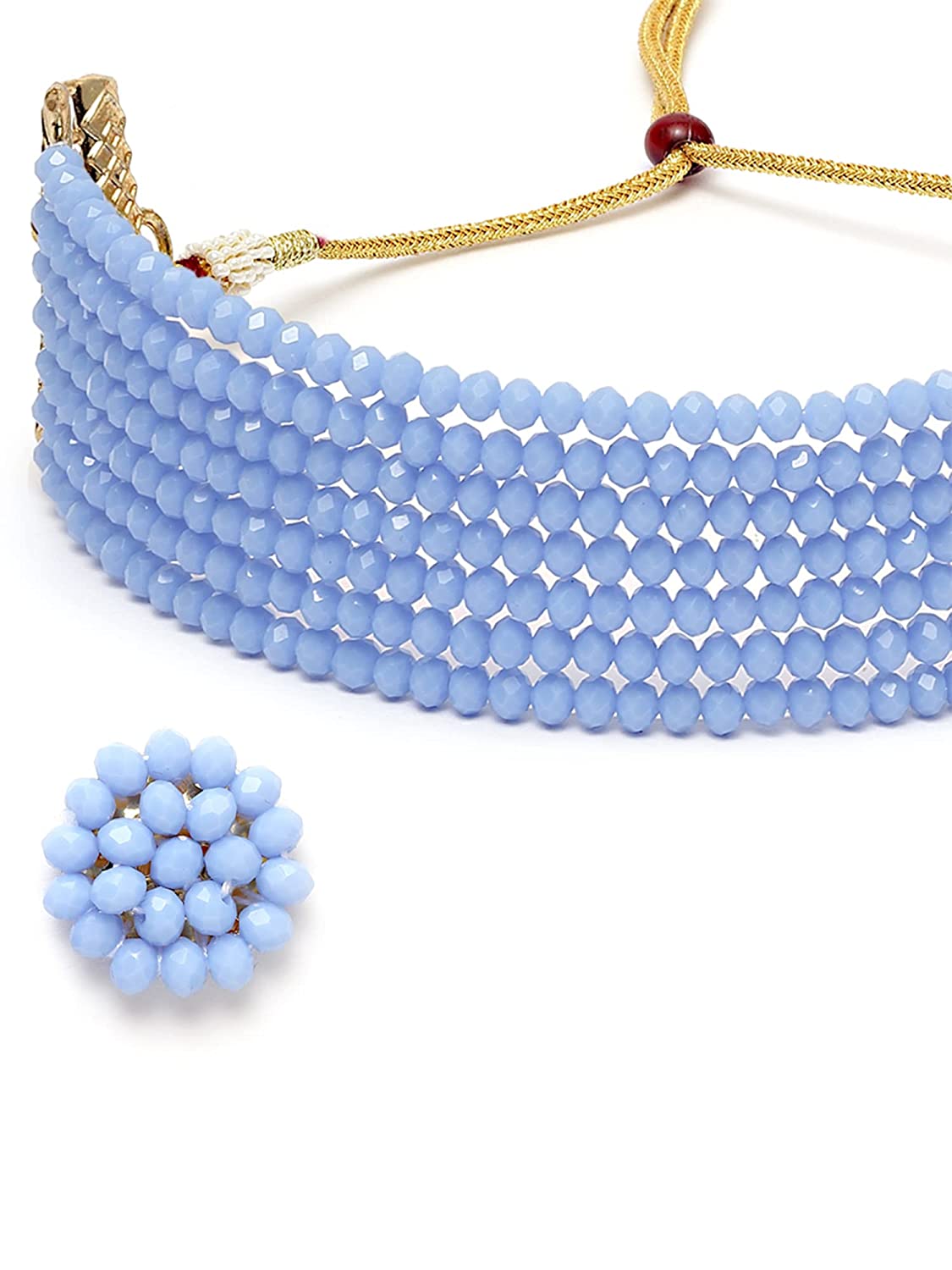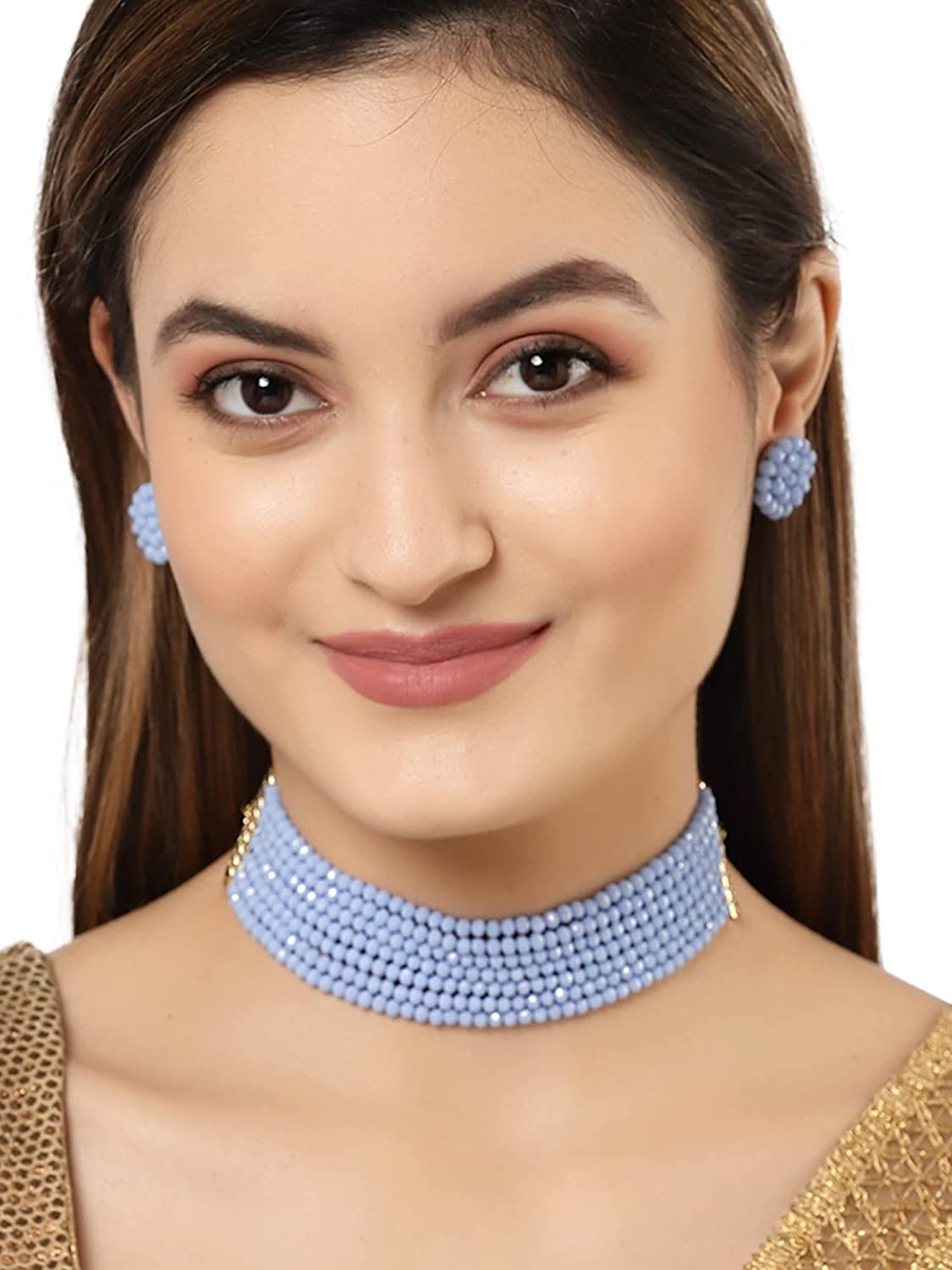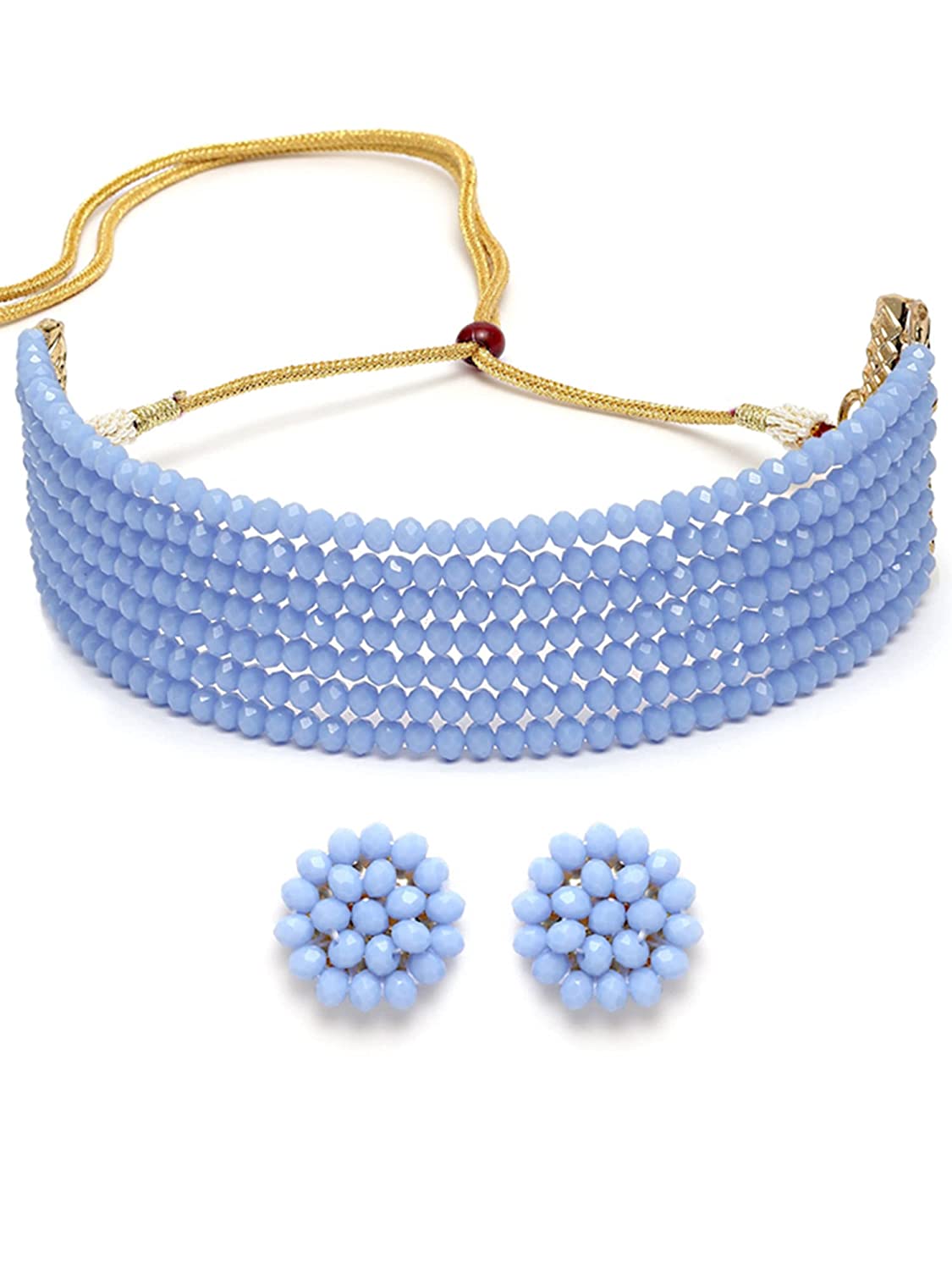 - Karatcart Light Blue Crystal Beaded Choker Necklace Set. It is made with high-quality Kundan Stones which makes them very skin-friendly. Perfect for Weddings, Parties, Festivals, and Traditional Occasions. Gracefully pair Saree, Kurti, or any Indo-western outfit to enhance your look. These are made from toxic-free materials which are Anti-Allergic and Safe for the skin.