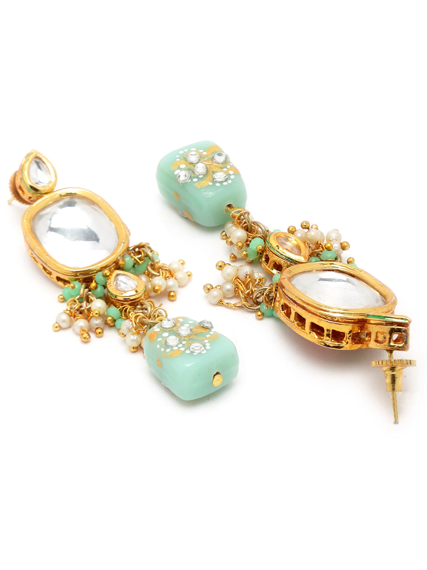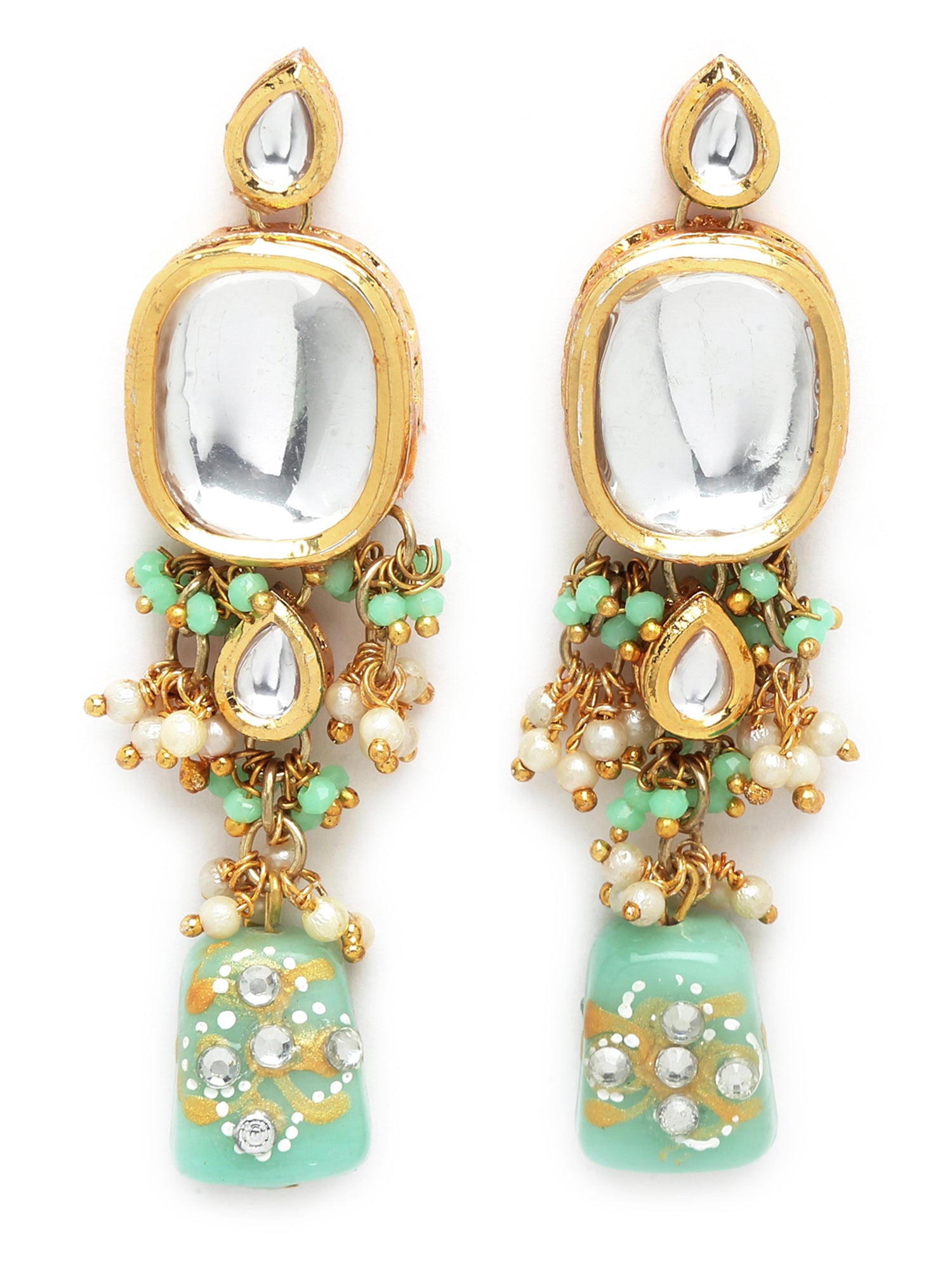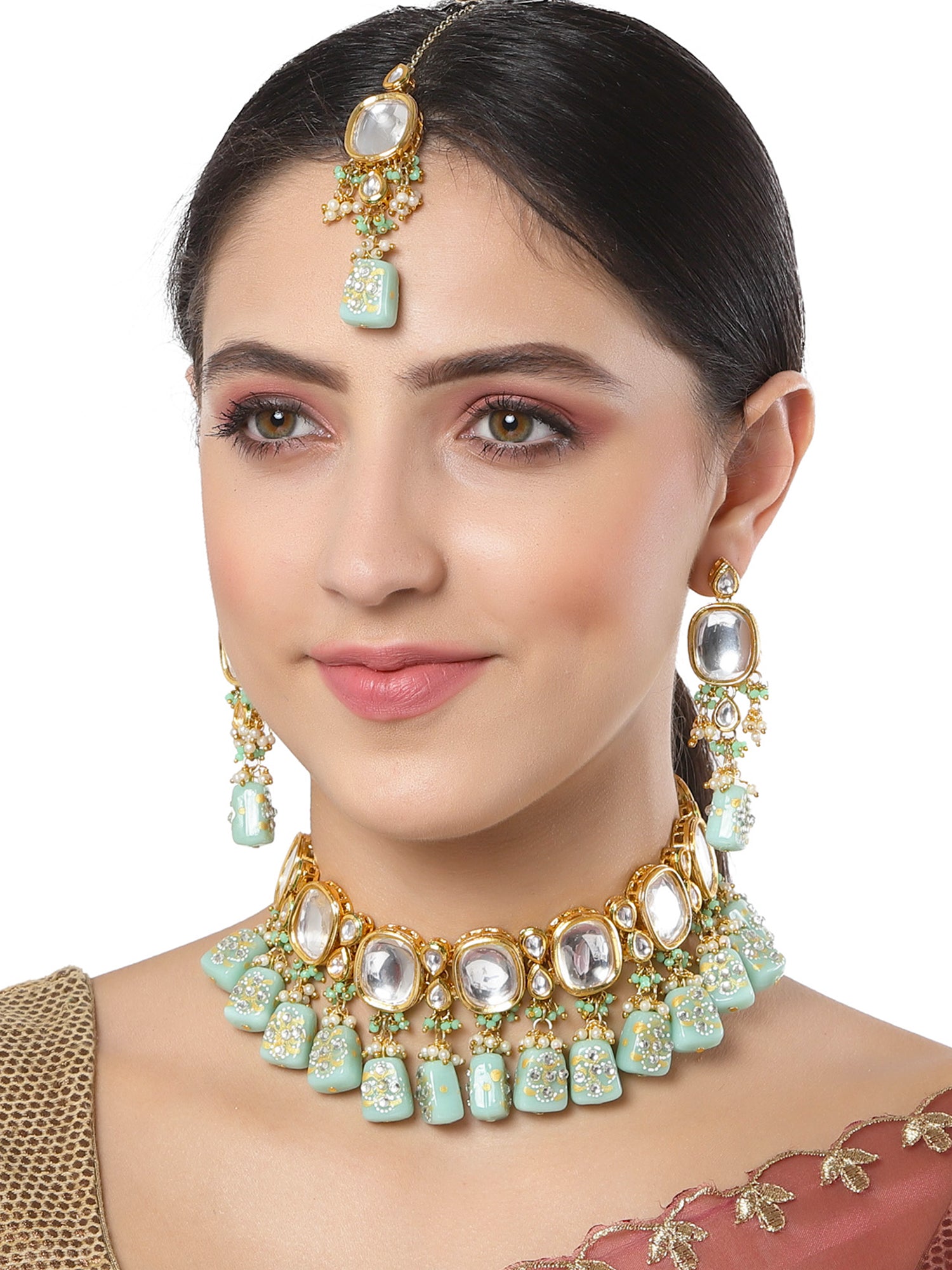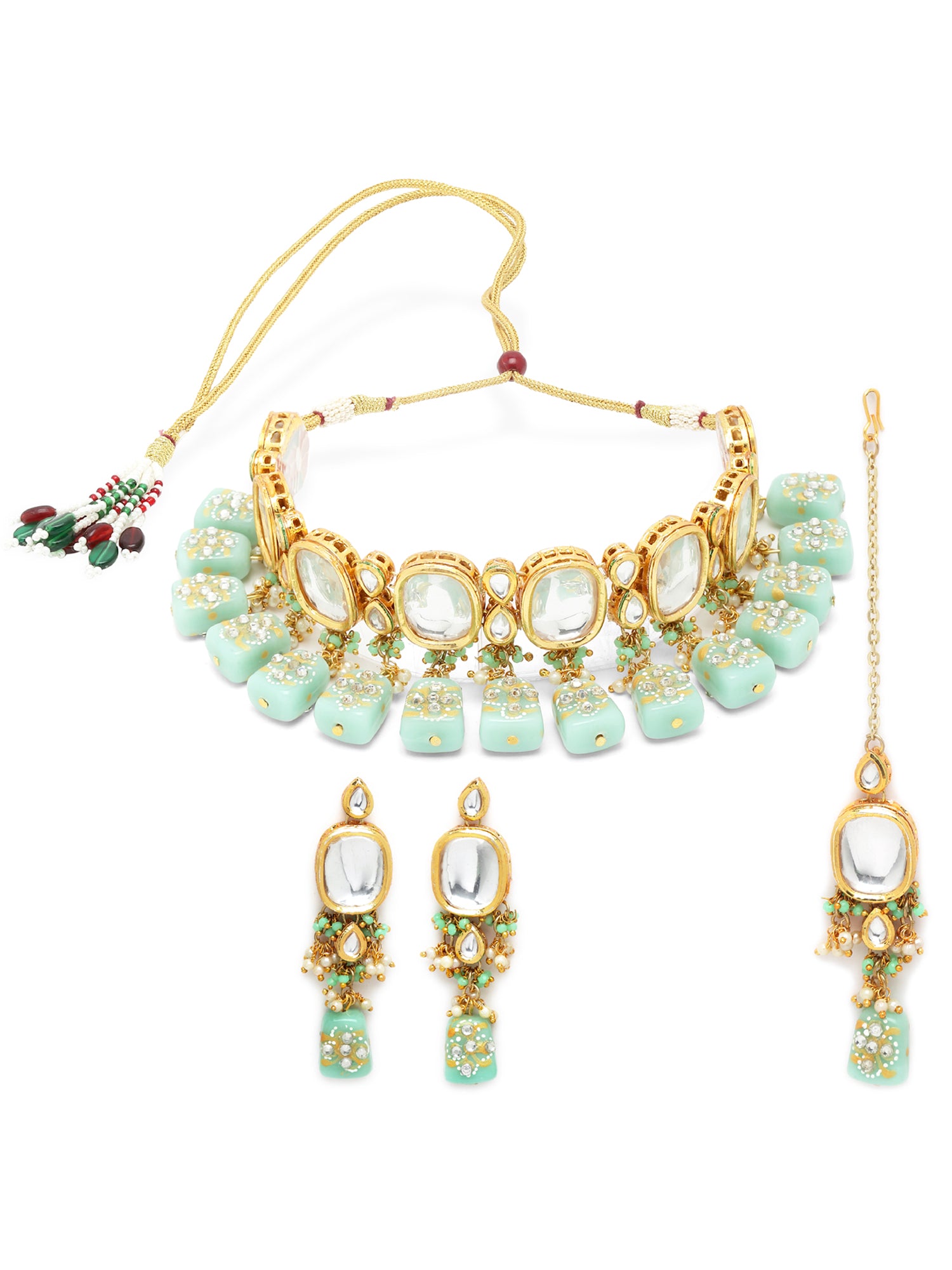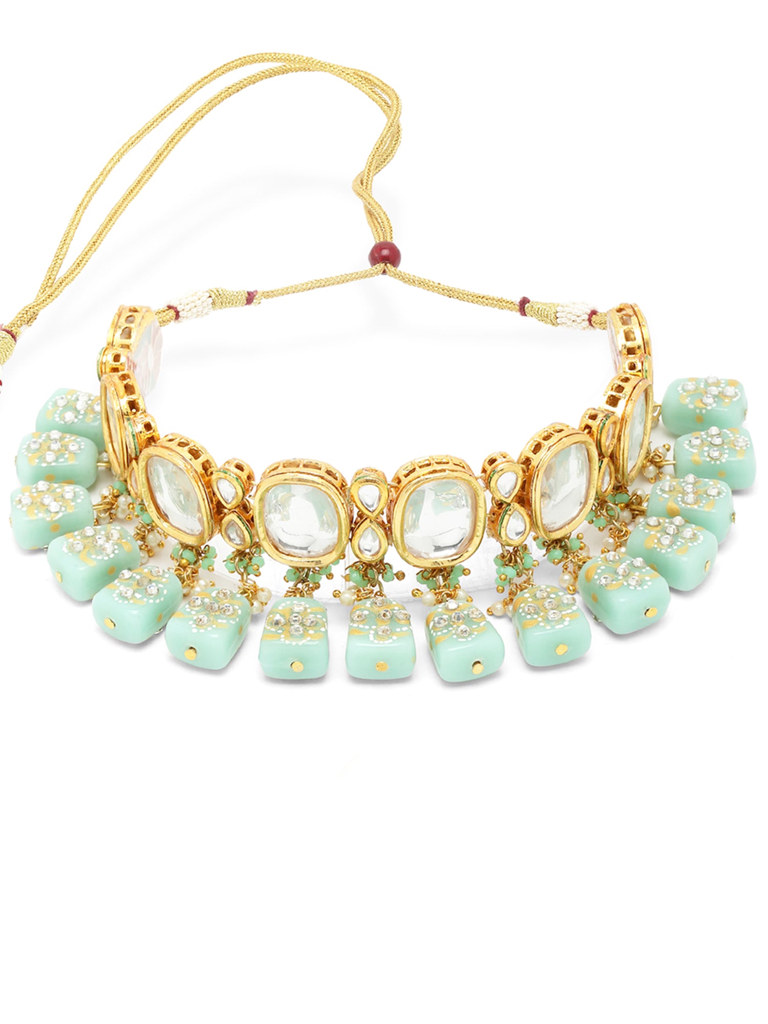 - Karatcart Mint Green Designer Tumble Sqare Polki Kundan Necklace Set. It is made with high-quality Kundan Stones which makes them very skin-friendly. Perfect for Weddings, Parties, Festivals, and Traditional Occasions. Gracefully pair Saree, Kurti, or any Indo-western outfit to enhance your look. These are made from toxic-free materials which are Anti-Allergic and Safe for the skin.