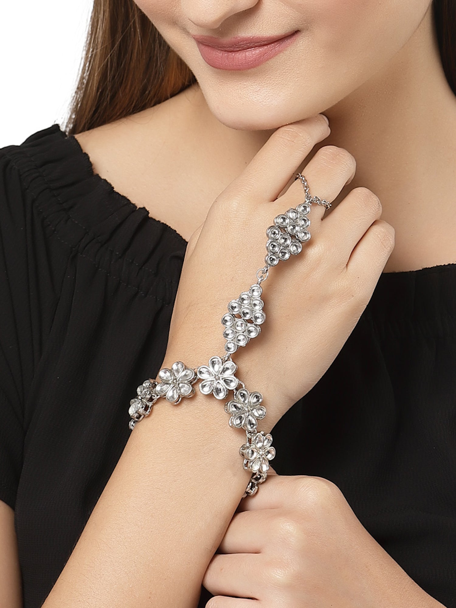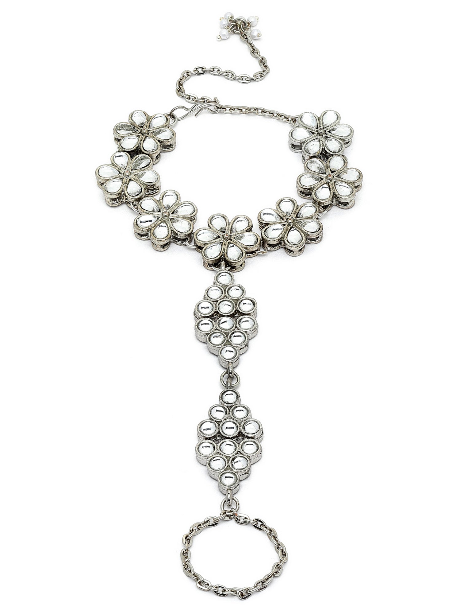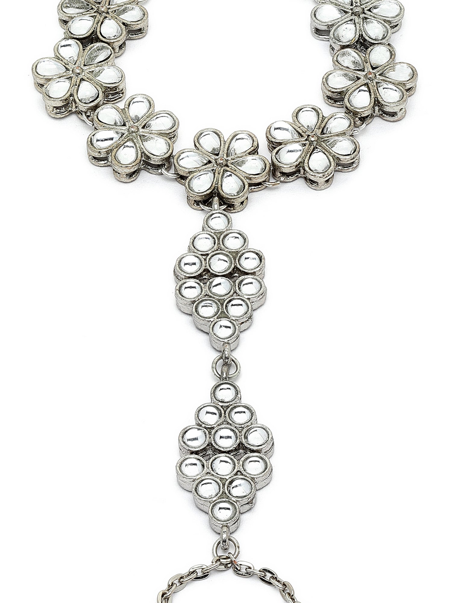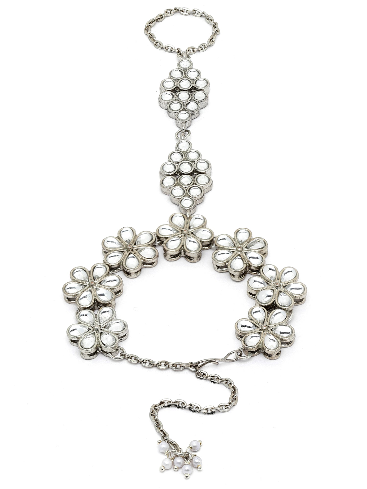 - Karatcart Oxidised Silver Floral Kundan Chain Hathphool for Women. It is made with high-quality Kundan Stones which makes them very skin-friendly. Perfect for Weddings, Parties, Festivals, and Traditional Occasions.