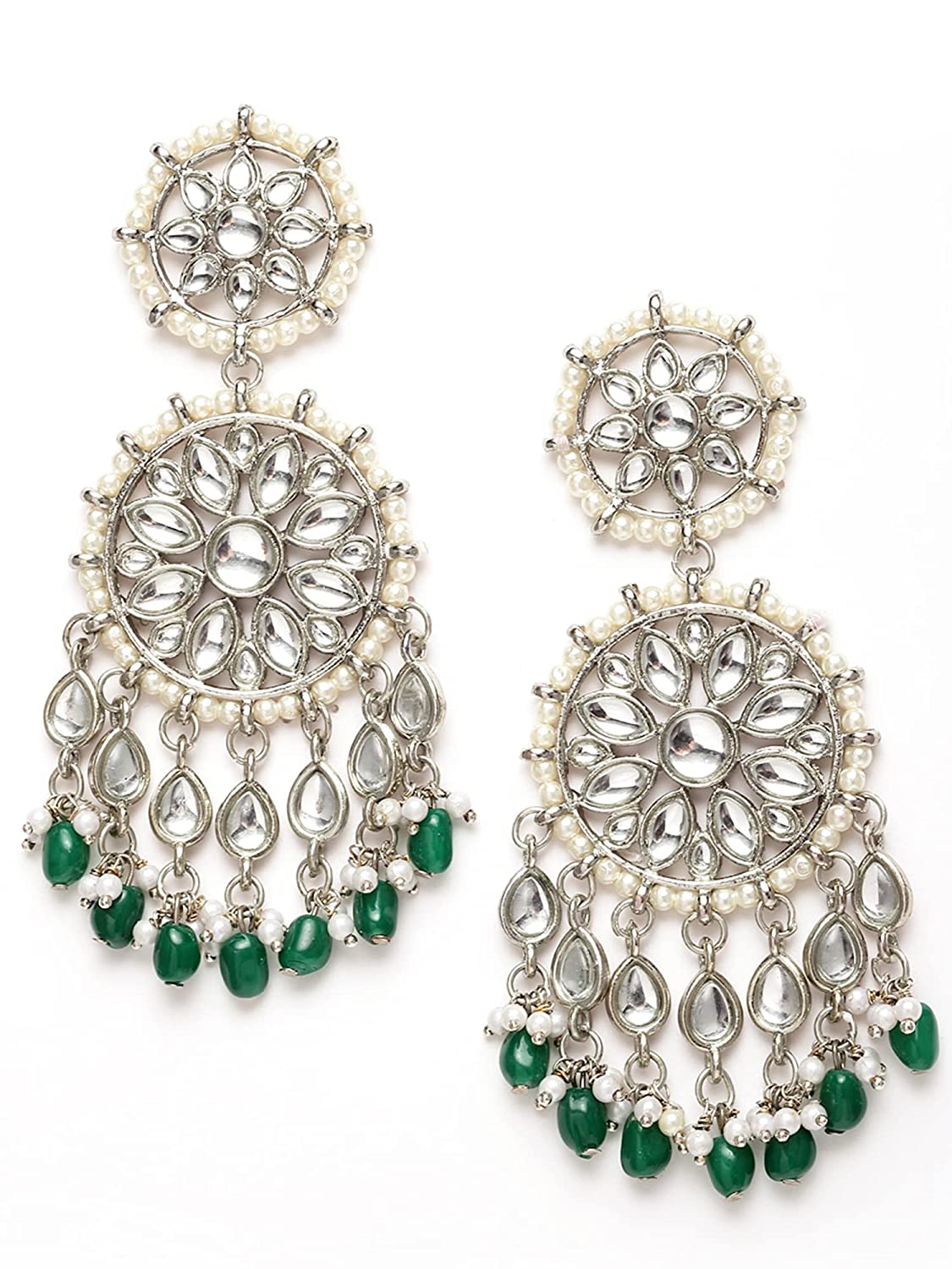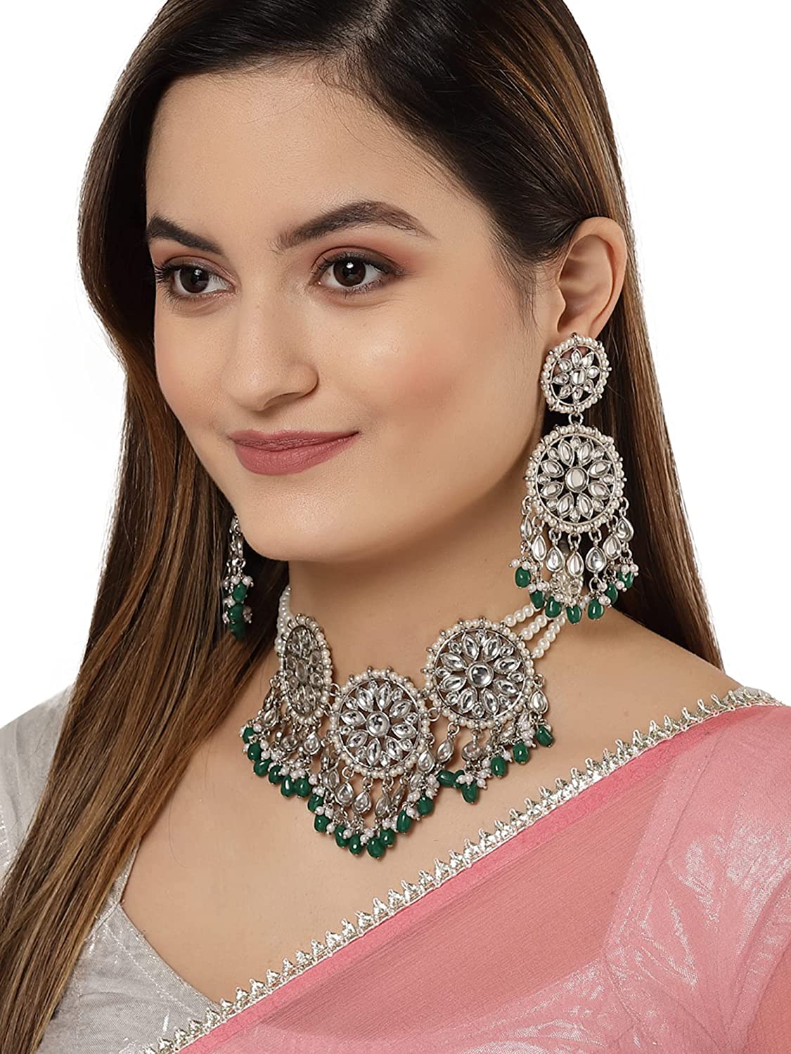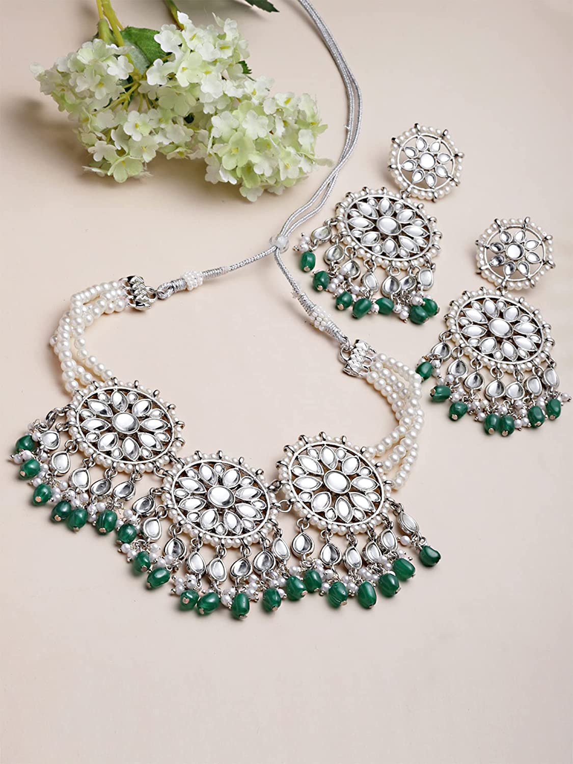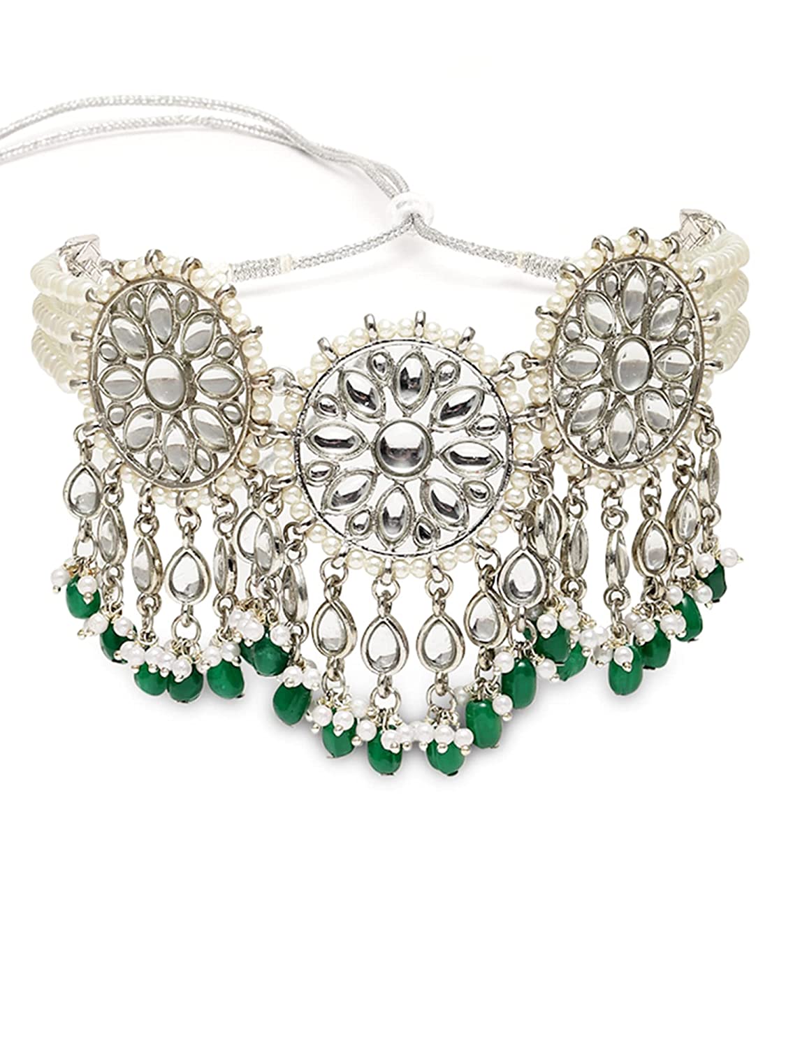 - Karatcart Oxidised Silver Green Tumble Floral Shape Necklace Set. It is made with high-quality Kundan Stones which makes them very skin-friendly. Perfect for Weddings, Parties, Festivals, and Traditional Occasions. Gracefully pair Saree, Kurti, or any Indo-western outfit to enhance your look. These are made from toxic-free materials which are Anti-Allergic and Safe for the skin.