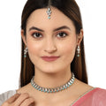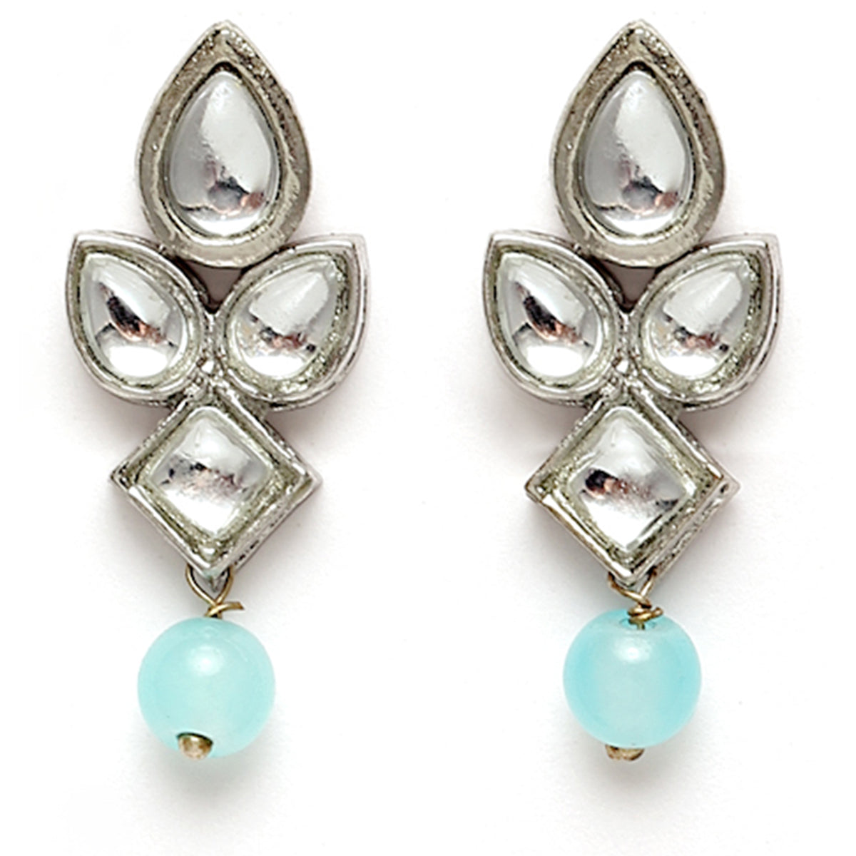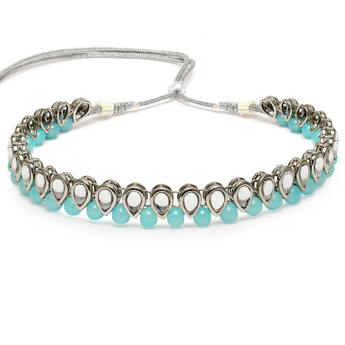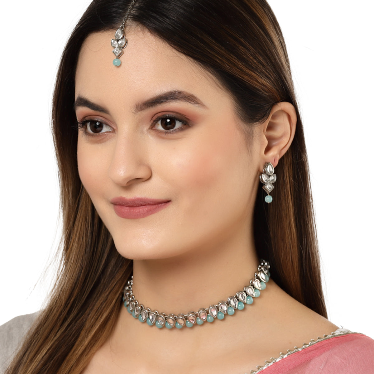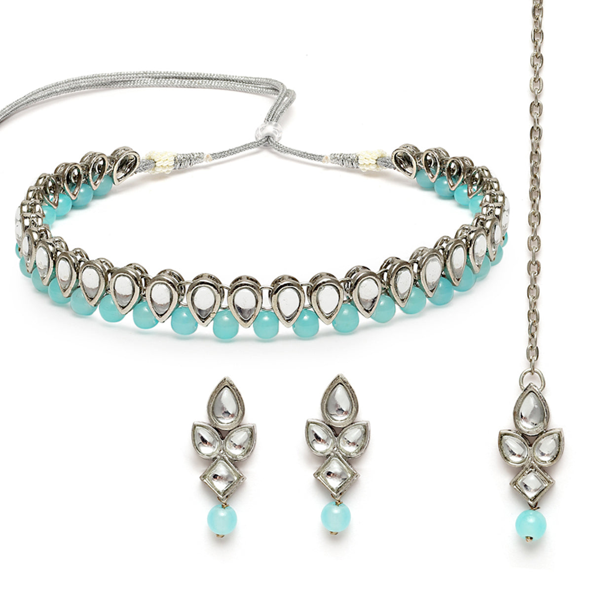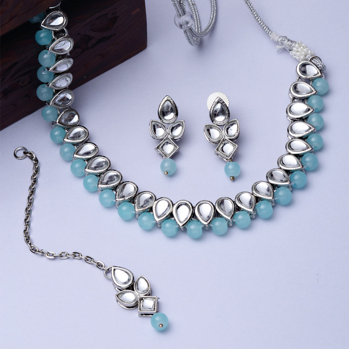 - Karatcart Oxidised Silver Handcrafted Kundan & Light Blue Beads Studded Necklace Set. It is made with high-quality Kundan Stones which makes them very skin-friendly. Perfect for Weddings, Parties, Festivals, and Traditional Occasions. Gracefully pair Saree, Kurti, or any Indo-western outfit to enhance your look. These are made from toxic-free materials which are Anti-Allergic and Safe for the skin.