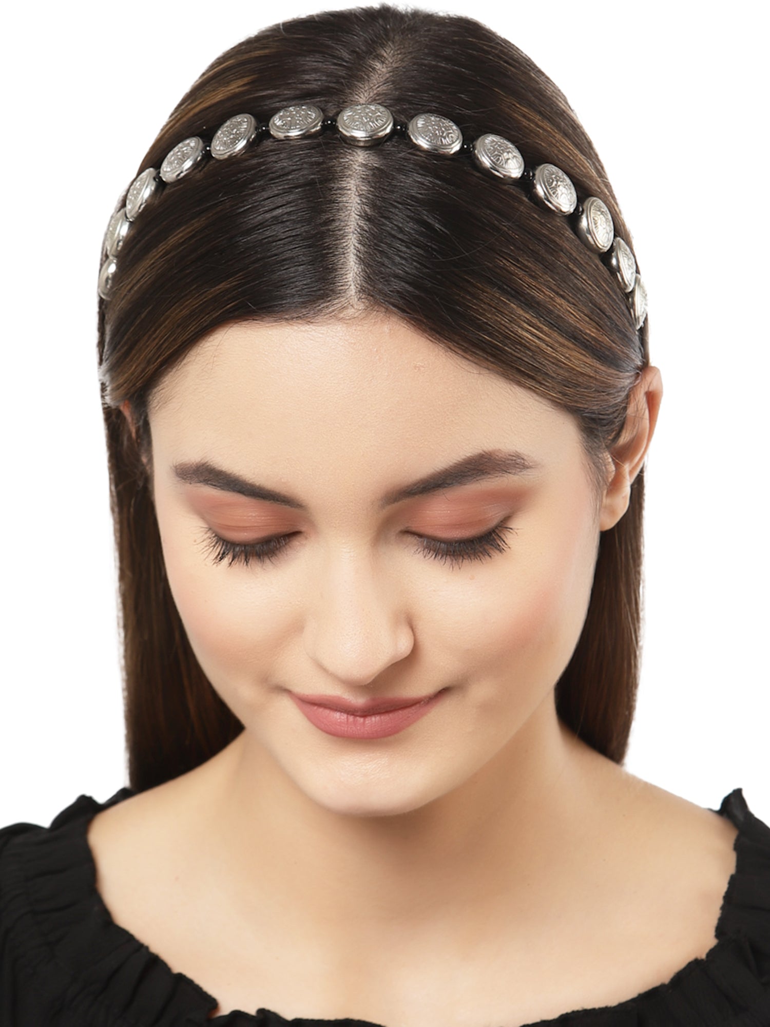 - Karatcart Oxidised Silver Kundan and Balck Beads Hairband for Women. It is made with high-quality Kundan Stones which makes them very skin-friendly. Perfect for Weddings, Parties, Festivals, and Traditional Occasions.