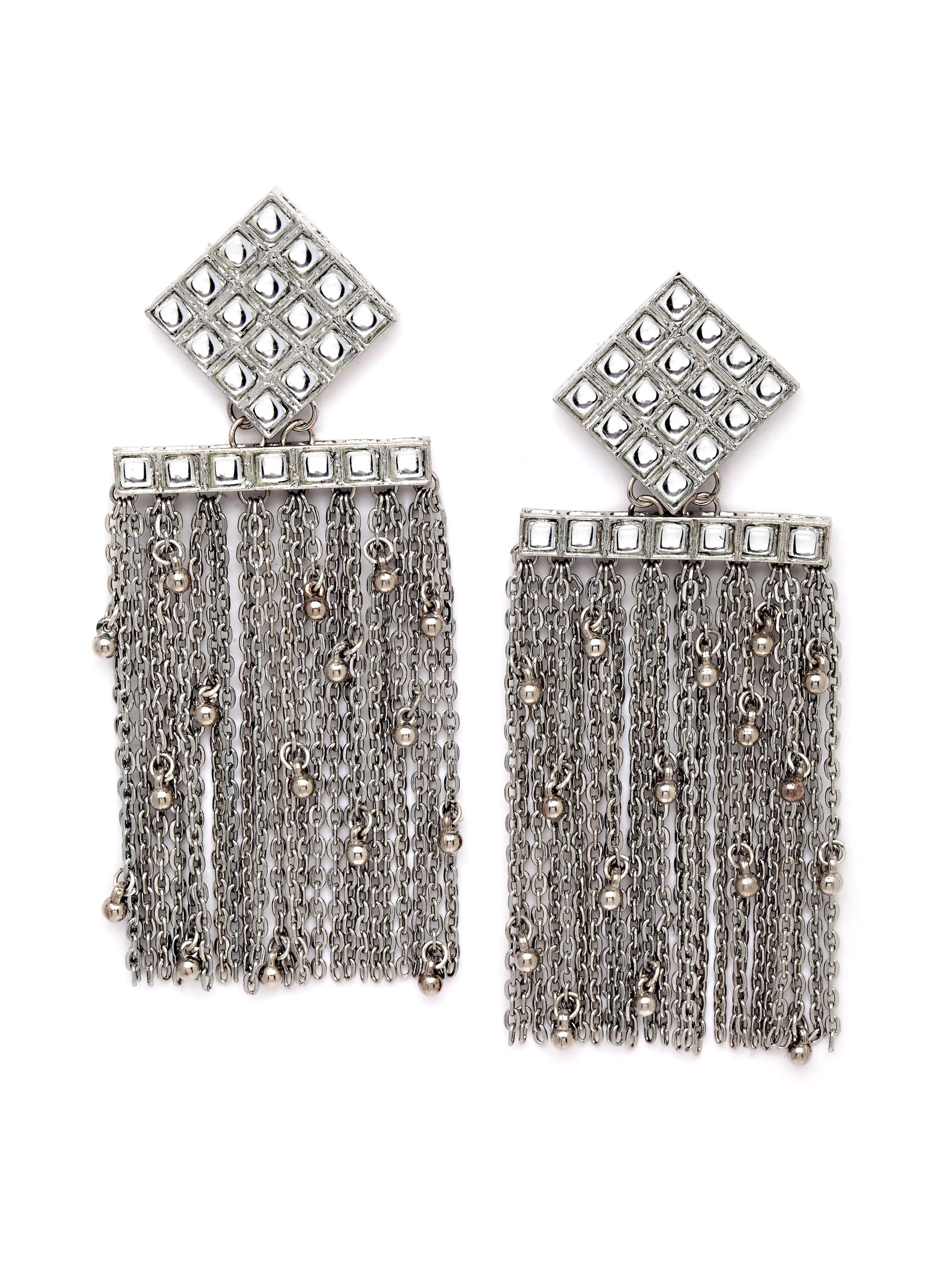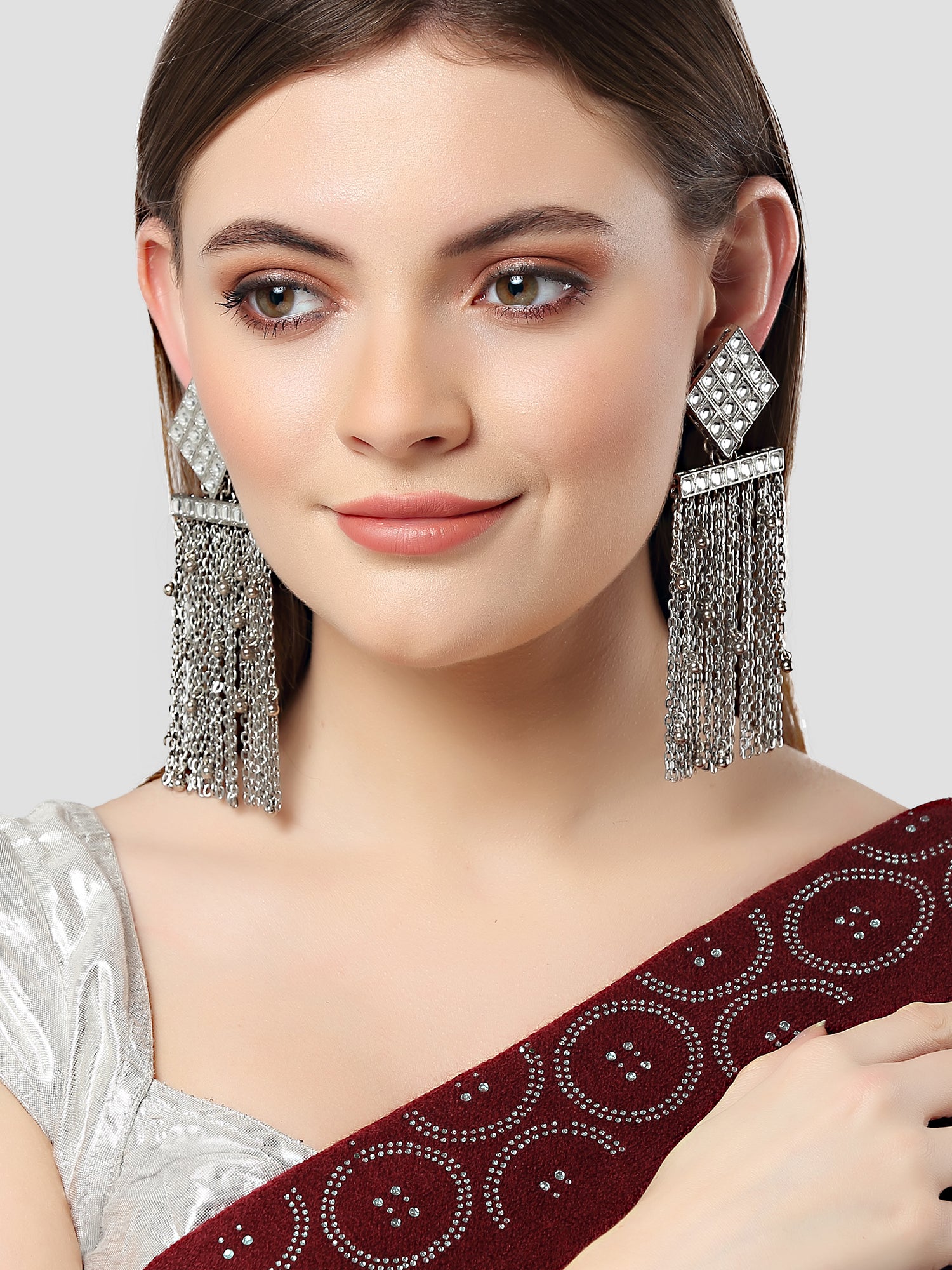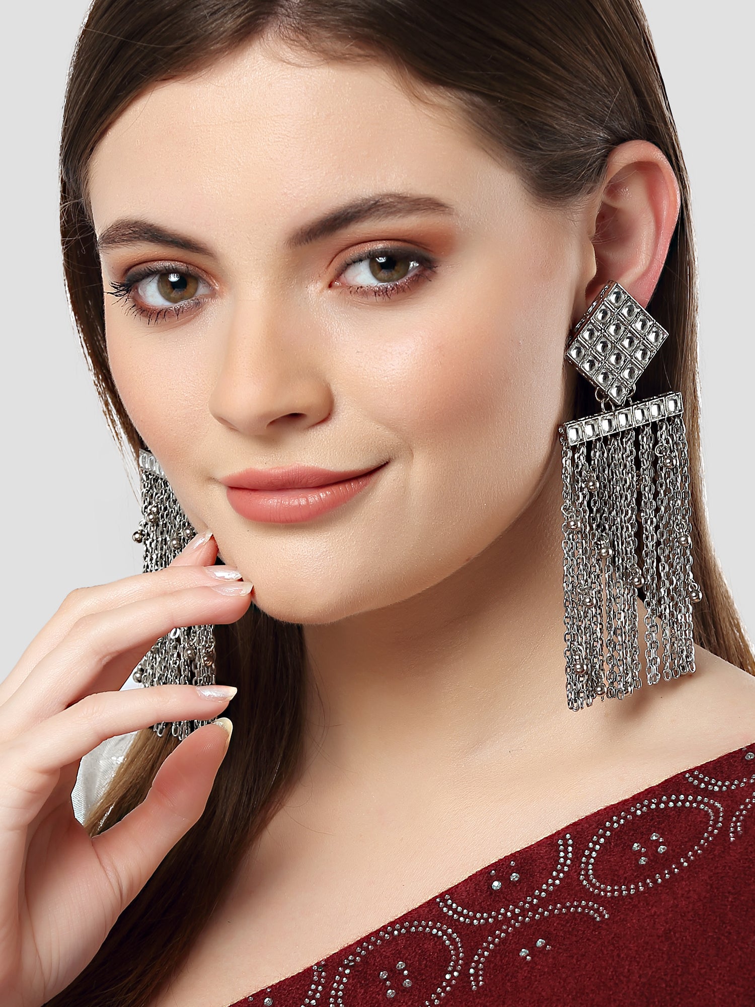 - Karatcart Oxidised Silver Kundan Chain Tassel Earrings for Women .It is made with high-quality Kundan Stones which makes them very skin-friendly. Perfect for Weddings, Parties, Festivals, and Traditional Occasions. Gracefully pair Saree, Kurti, or any Indo-western outfit to enhance your look. These are made from toxic-free materials which are Anti-Allergic and Safe for the skin.