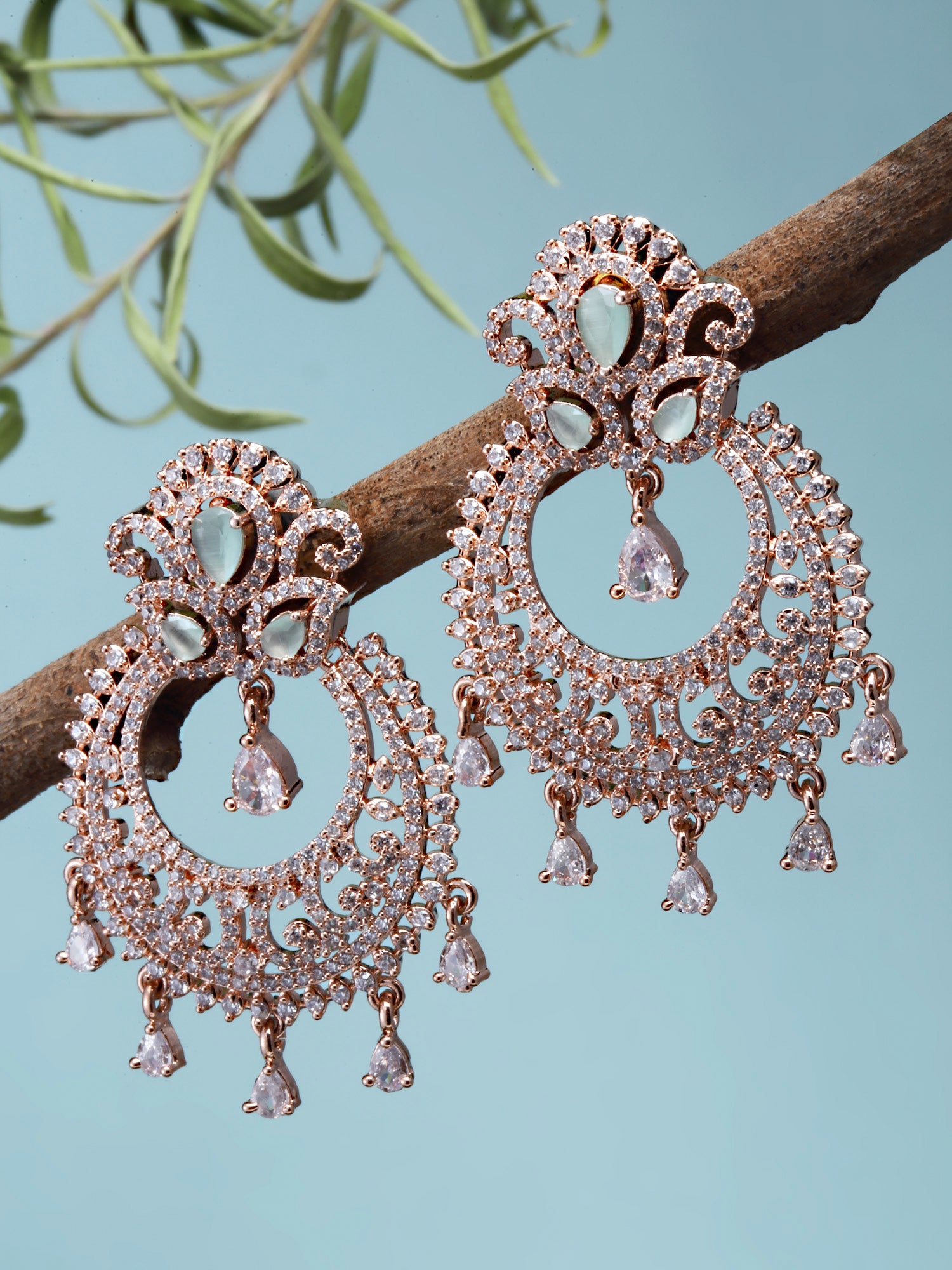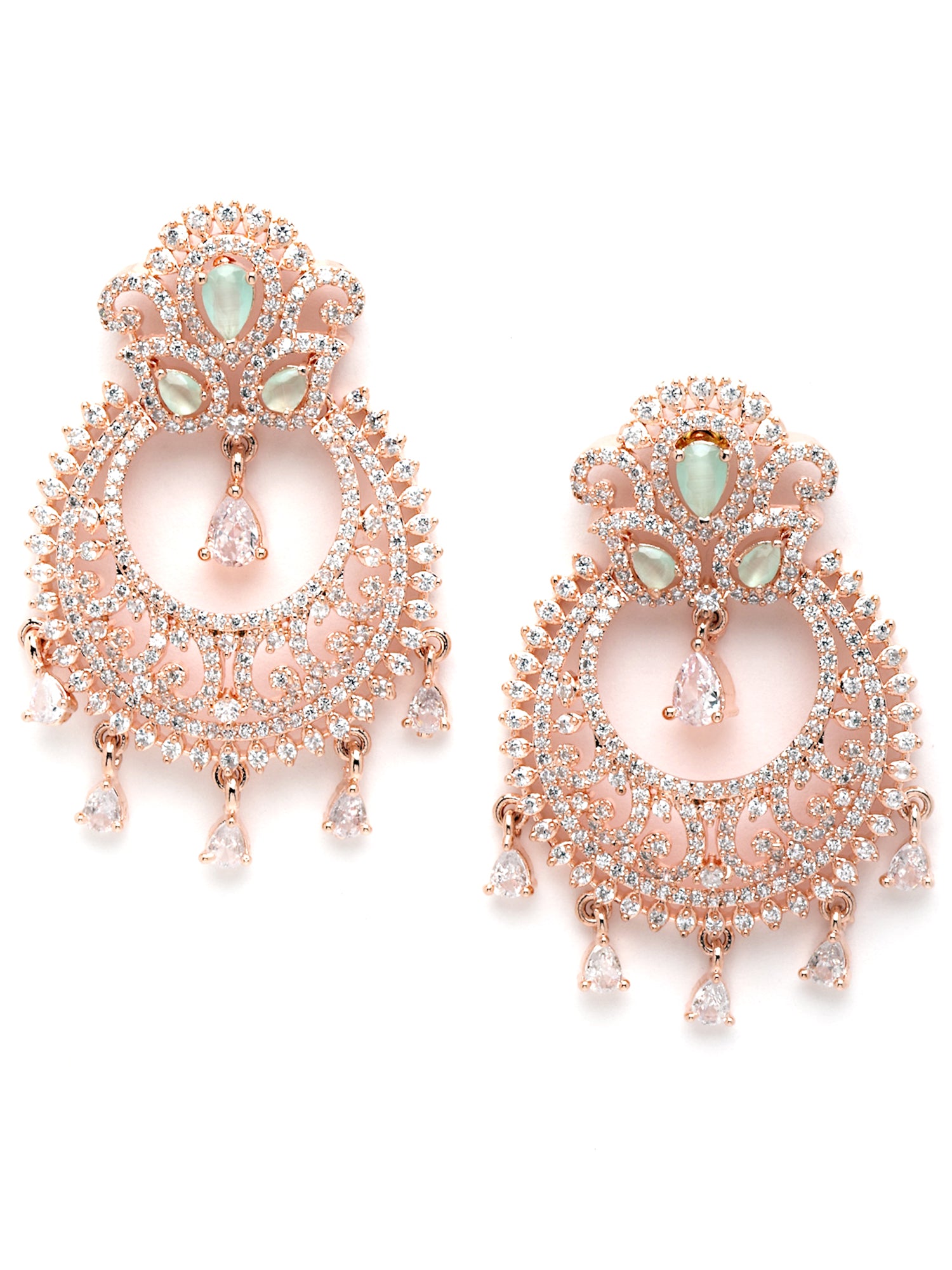- Rose Gold Plated American Diamond Studded Chandbali Earrings for Women. It is made with high-quality Kundan Stones which makes them very skin-friendly. Perfect for Weddings, Parties, Festivals, and Traditional Occasions. Gracefully pair Saree, Kurti, or any Indo-western outfit to enhance your look. These are made from toxic-free materials which are Anti-Allergic and Safe for the skin.