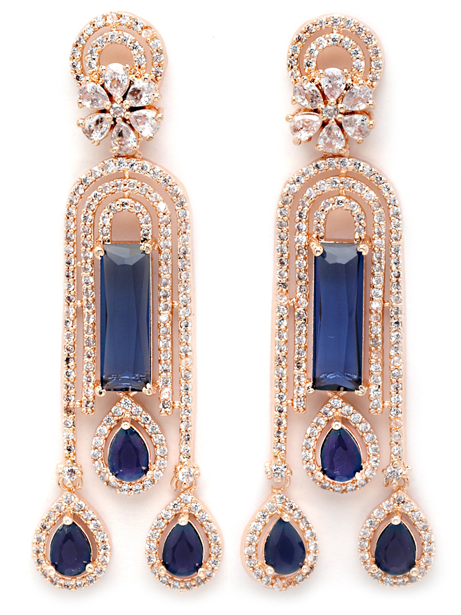 - Rose Gold Plated Blue AD Drop Earrings for Women. It is made with high-quality Kundan Stones which makes them very skin-friendly. Perfect for Weddings, Parties, Festivals, and Traditional Occasions. Gracefully pair Saree, Kurti, or any Indo-western outfit to enhance your look. These are made from toxic-free materials which are Anti-Allergic and Safe for the skin.