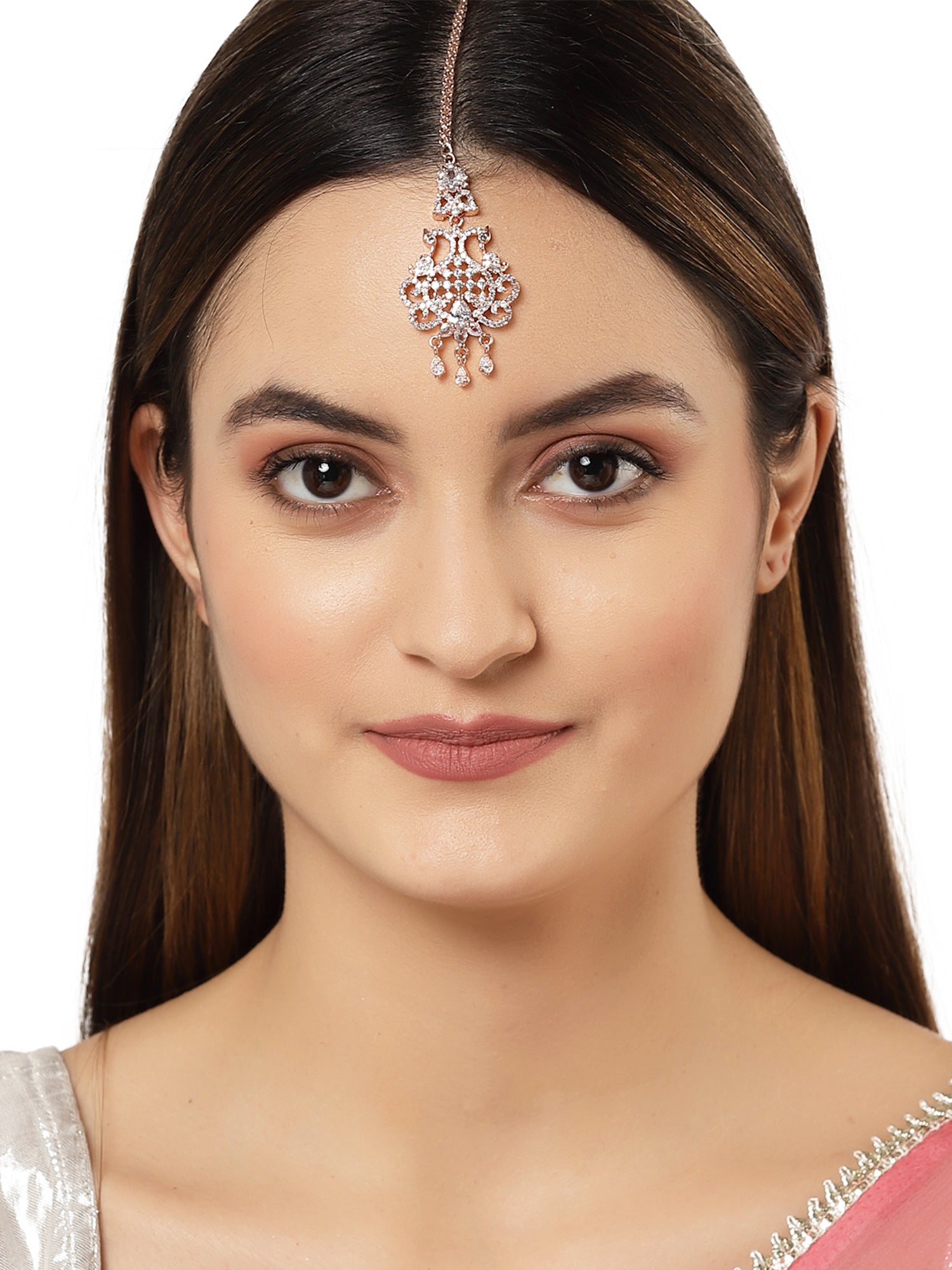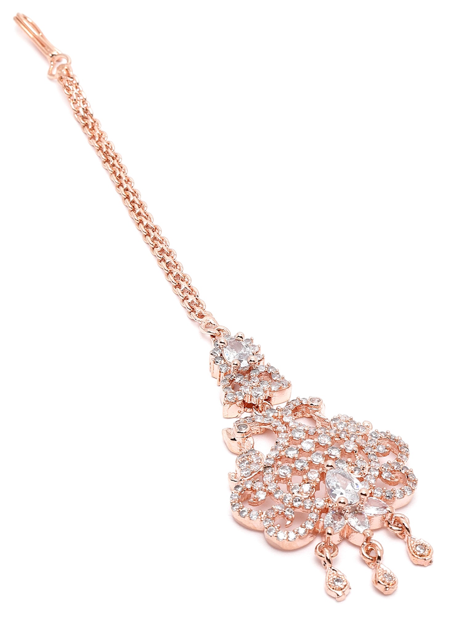 - Karatcart Rose Gold-Plated Peacock Shape Cubic Zirconia Studded Maangtikka for Women. It is made with high-quality Kundan Stones which makes them very skin-friendly. Perfect for Weddings, Parties, Festivals, and Traditional Occasions.