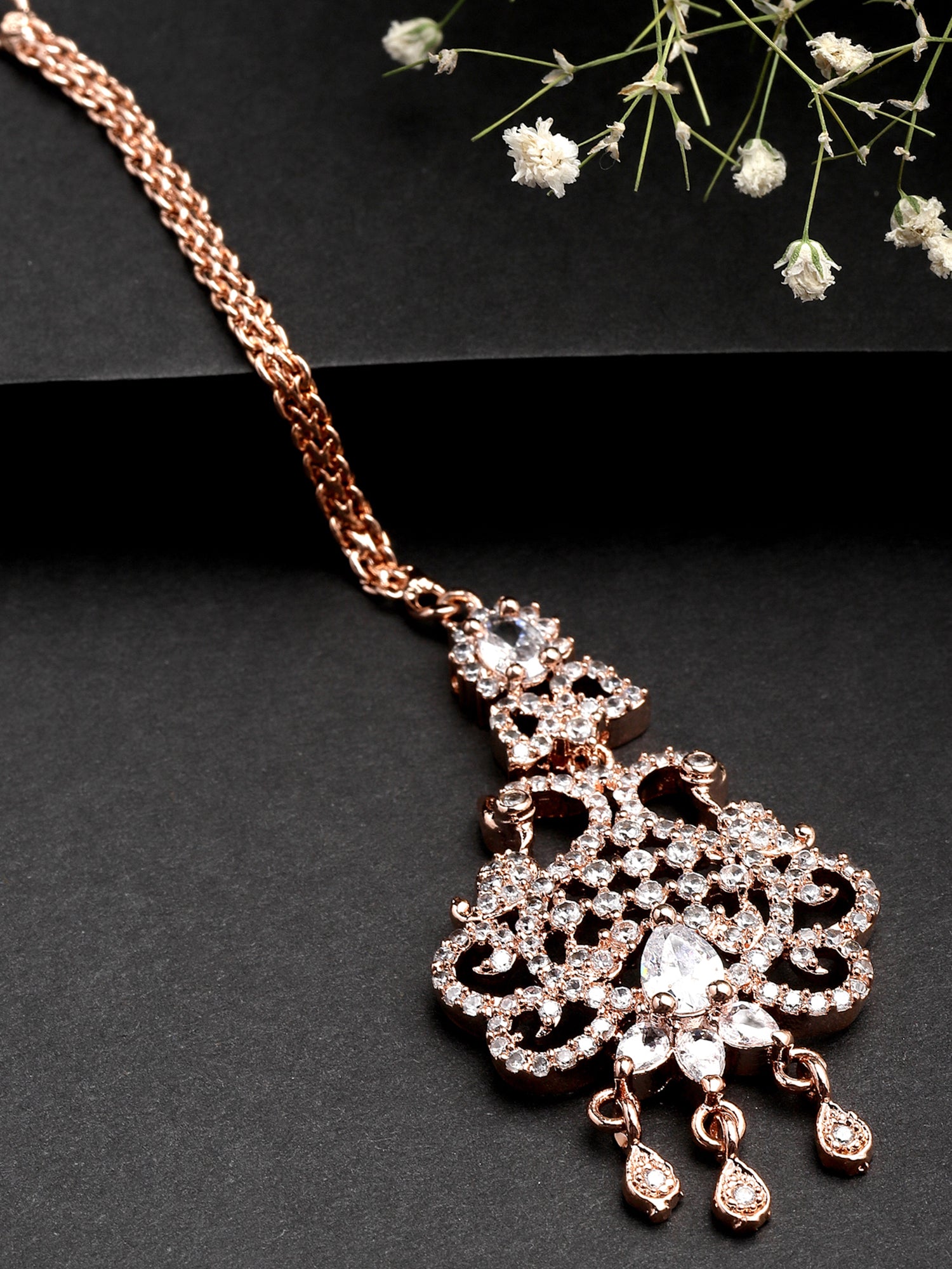 Karatcart Rose Gold-Plated Peacock Shape Cubic Zirconia Studded Maangtikka for Women