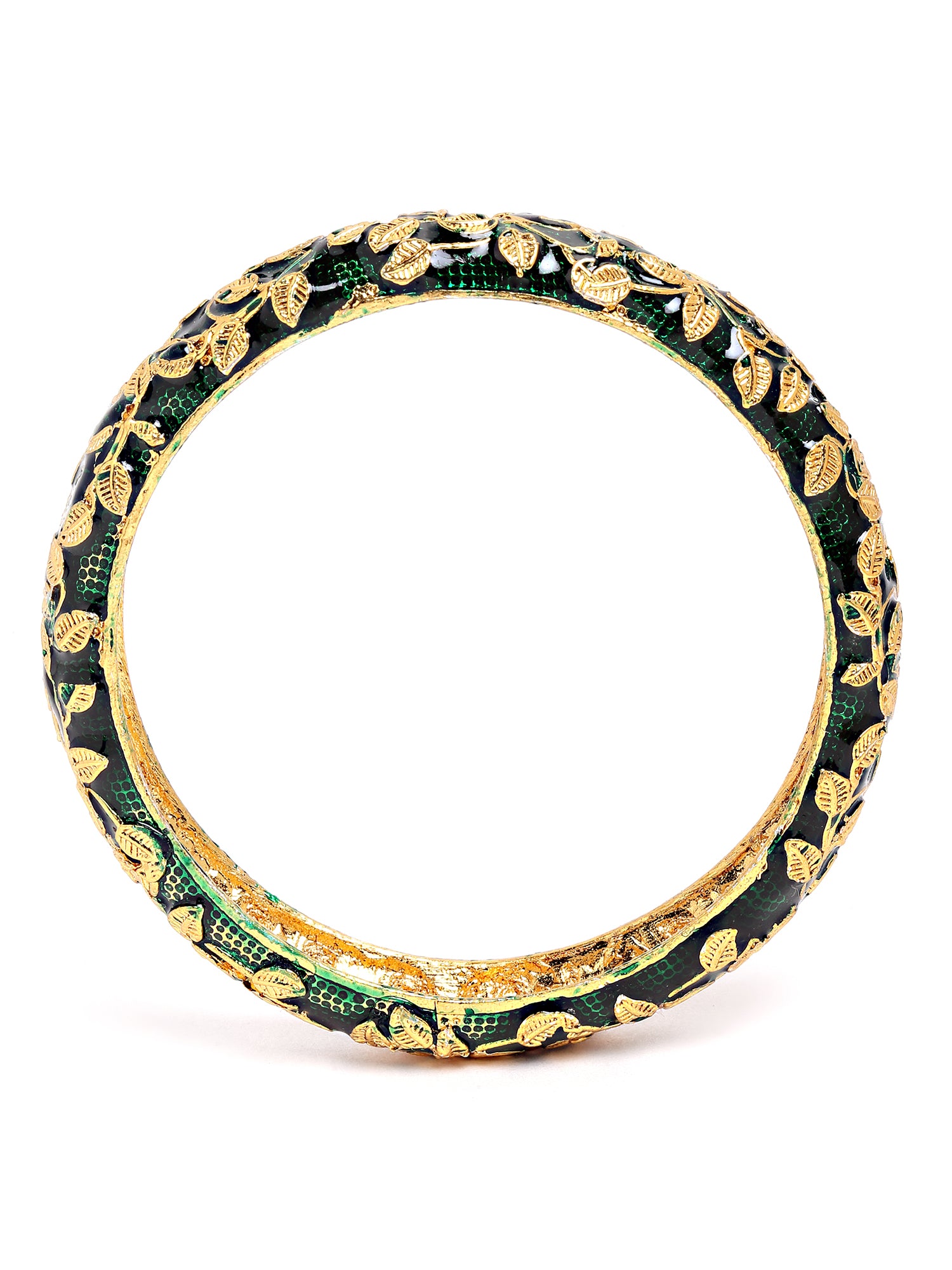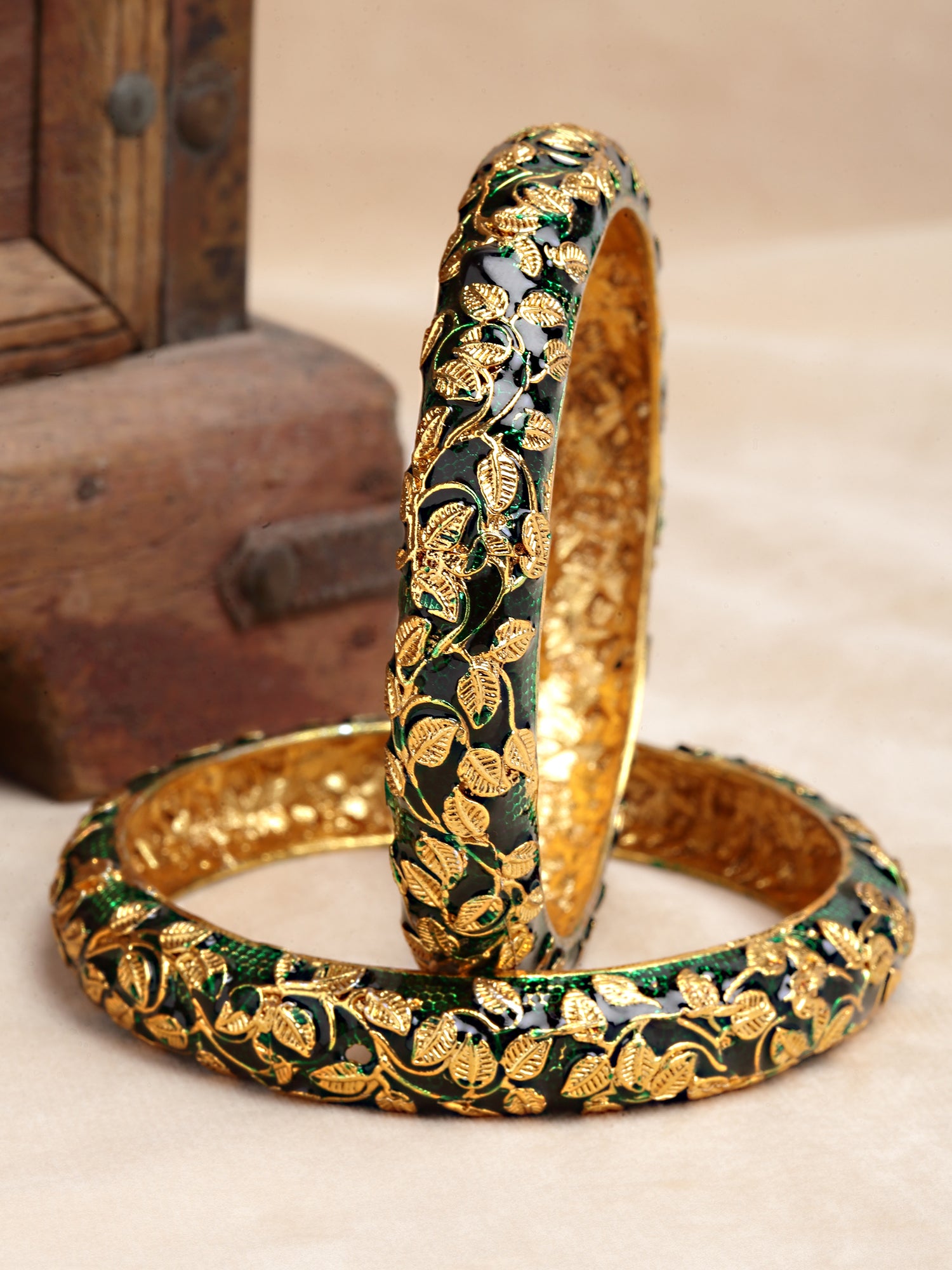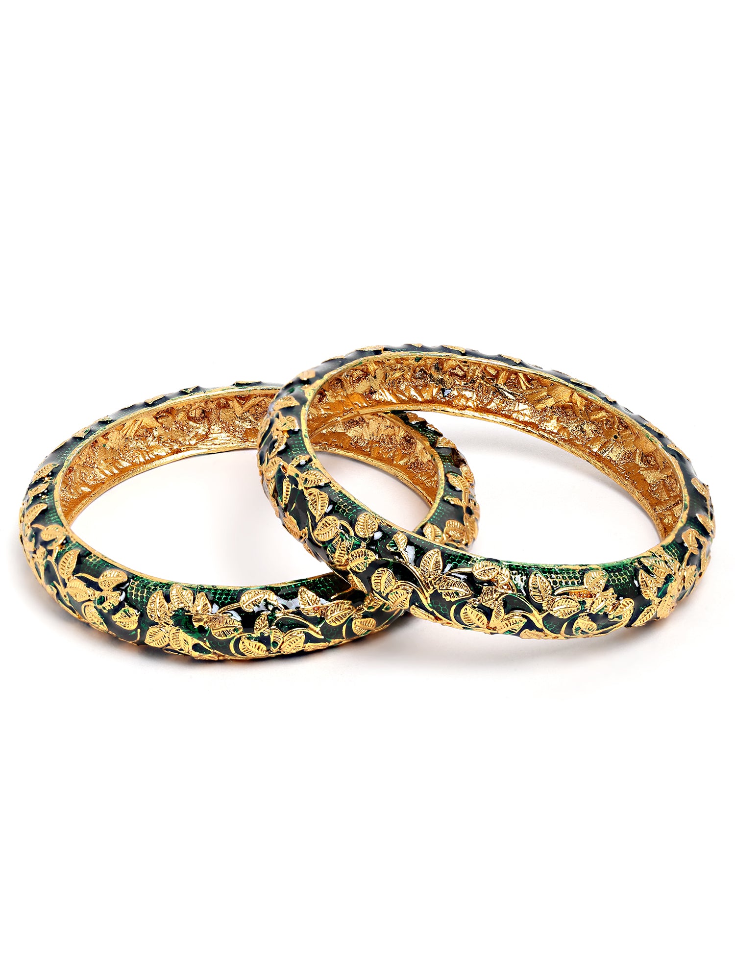 - Karatcart Set of 2 Antique Green and Gold Plated Rajwadi Bangles for Women .It's Five Layer Micro Gold Plated and Embellished with Kundan for High Durability. Intricate high polish creates glamorous reflections and adds a luxurious look. Perfect for Weddings, Festivals, Traditional Occasions. Best when paired with any Indian or Indo-Western Attire.