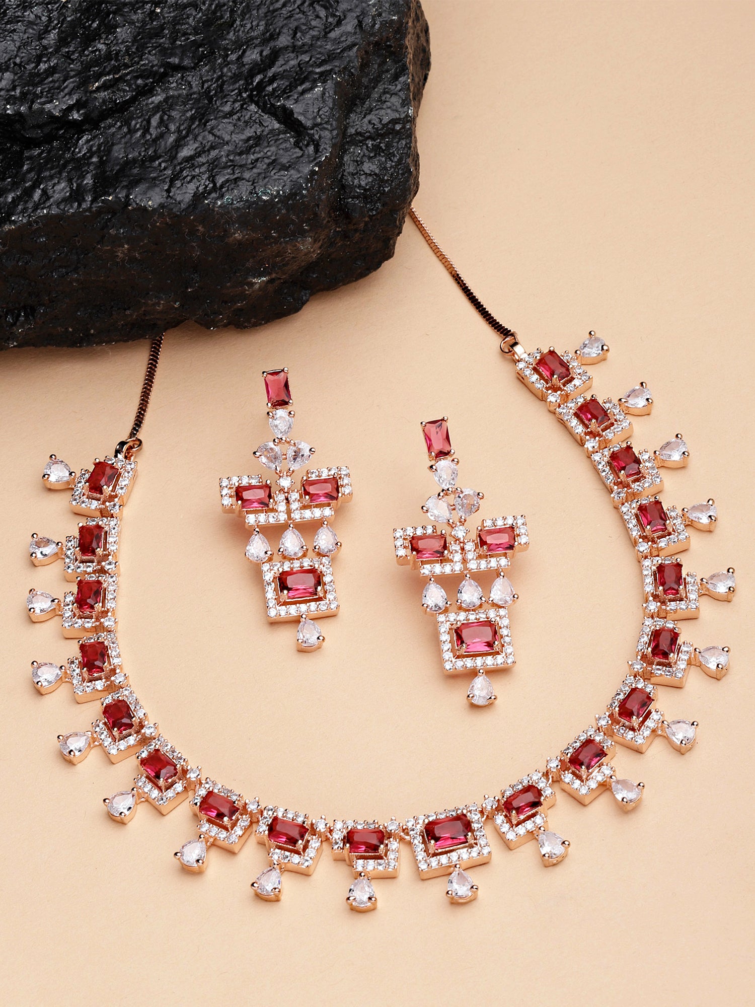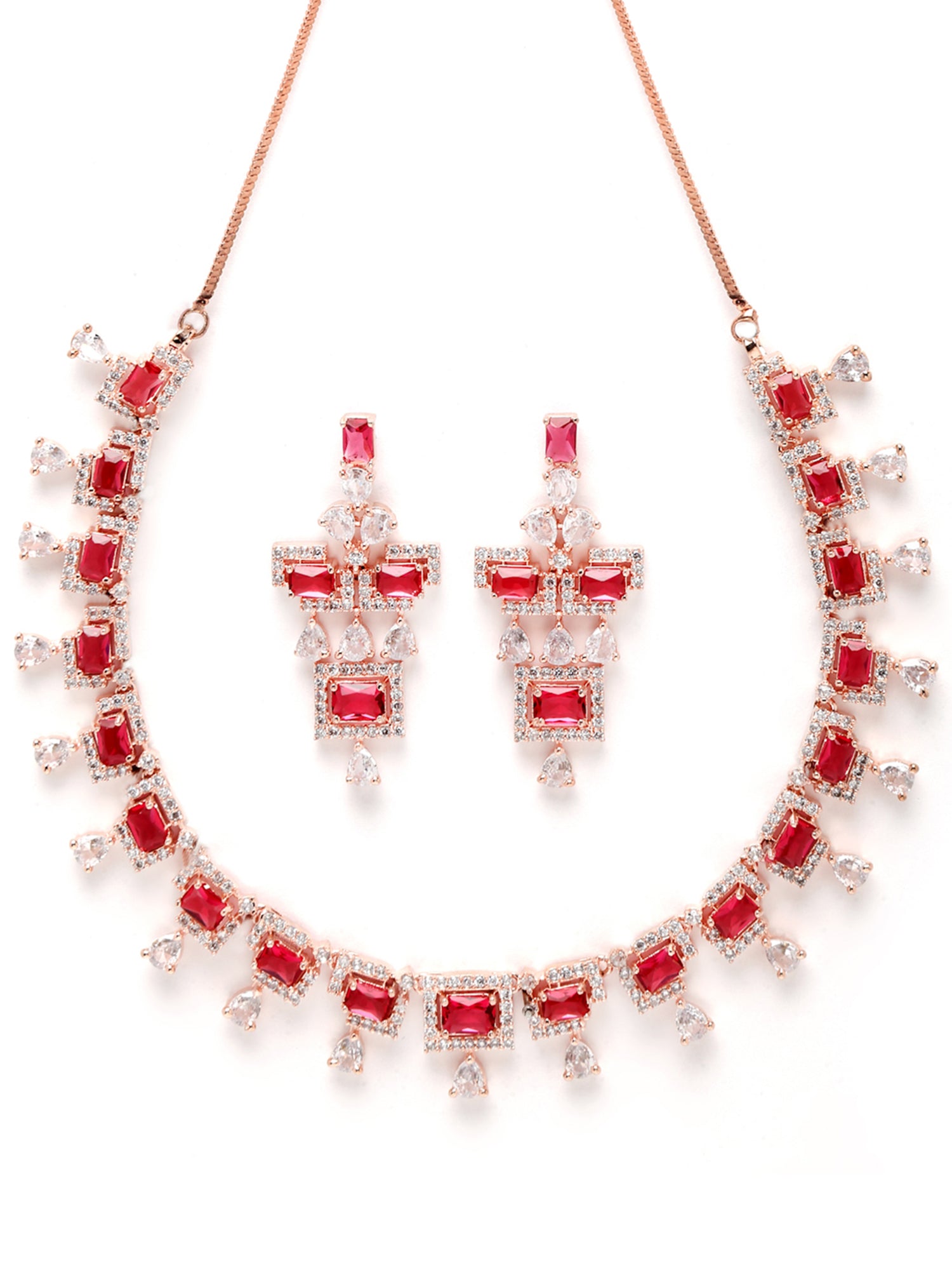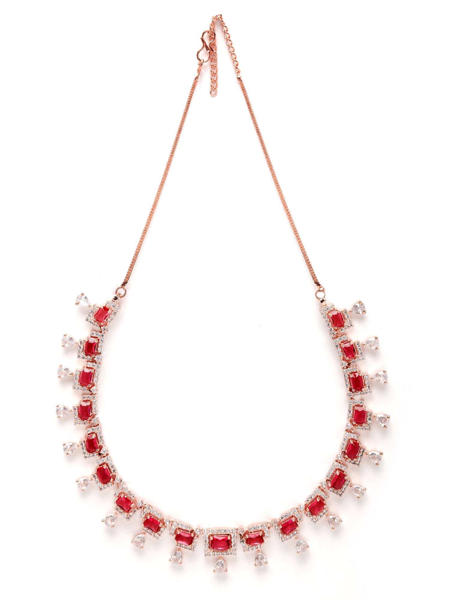 - Rose Gold Plated Red Cubic Zirconia Studded Necklace Set For Women . It is made with High-Quality AAA Cubic zirconia. Perfect for Weddings, Parties, Festivals, and Traditional Occasions.