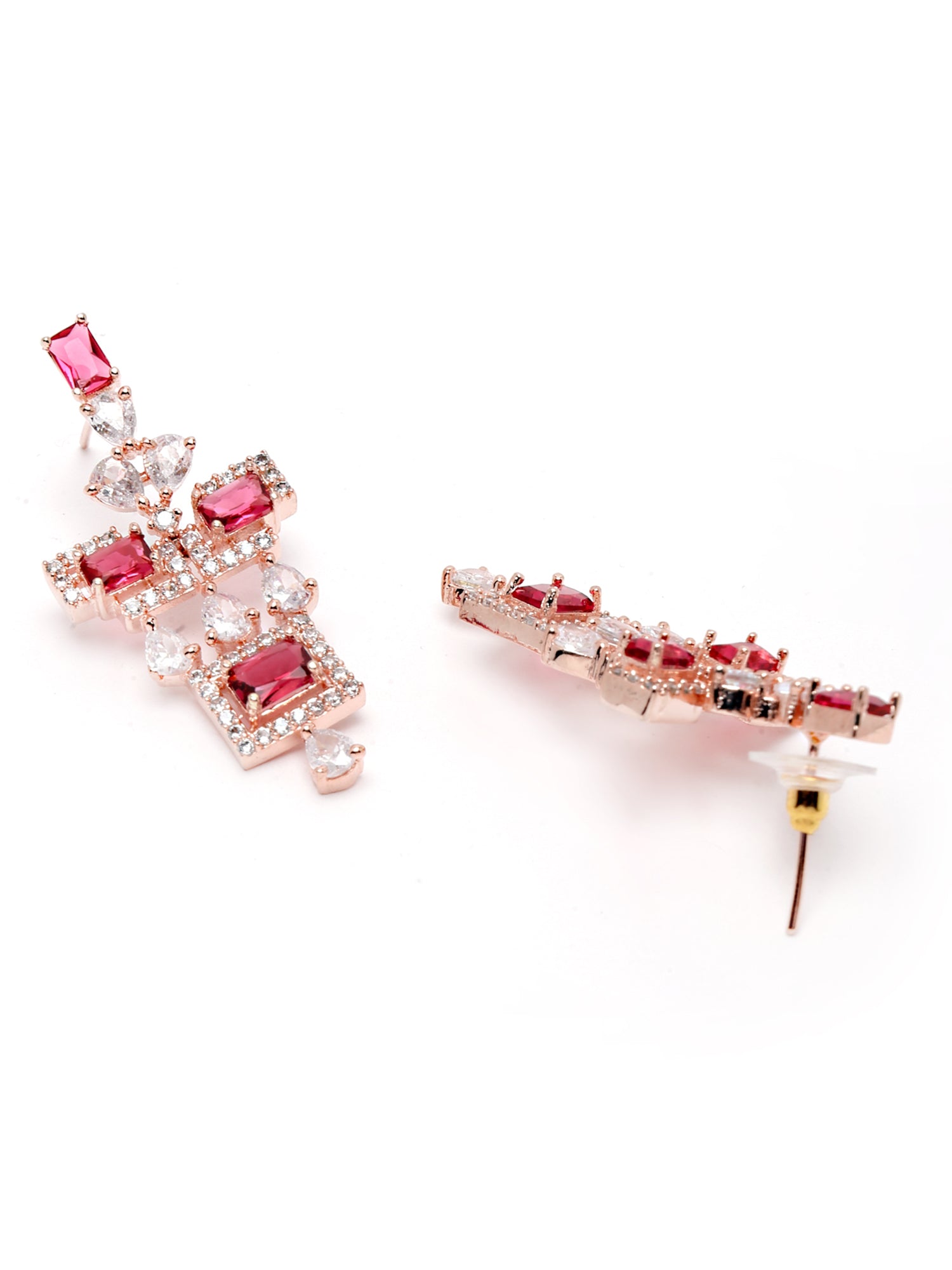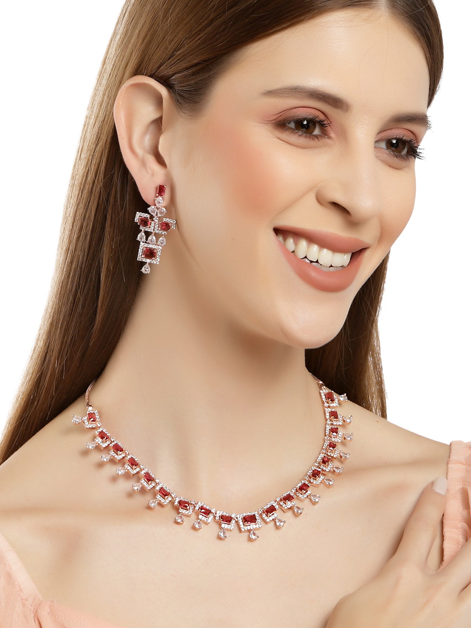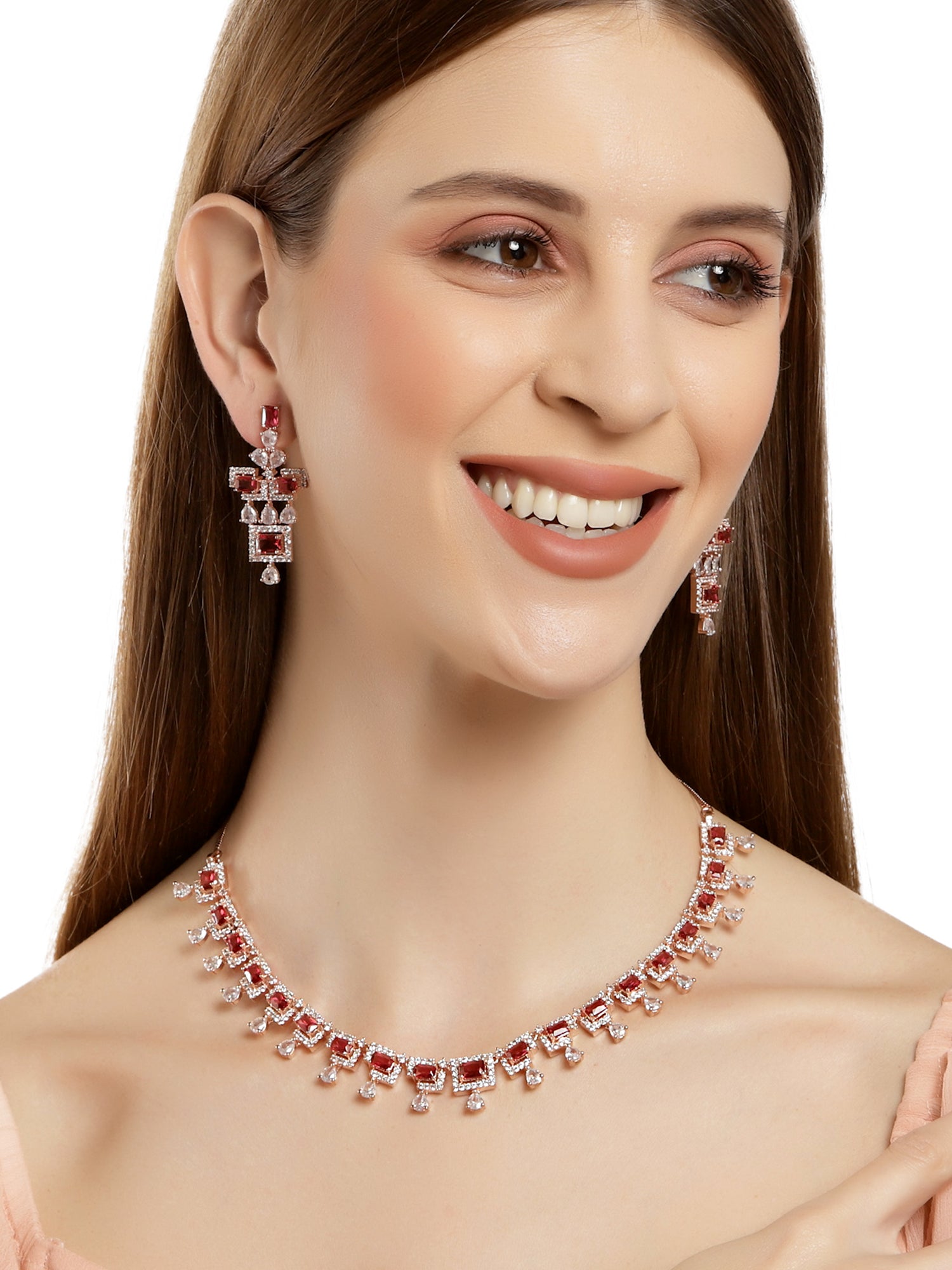 - Rose Gold Plated Red Cubic Zirconia Studded Necklace Set For Women . It is made with High-Quality AAA Cubic zirconia. Perfect for Weddings, Parties, Festivals, and Traditional Occasions.