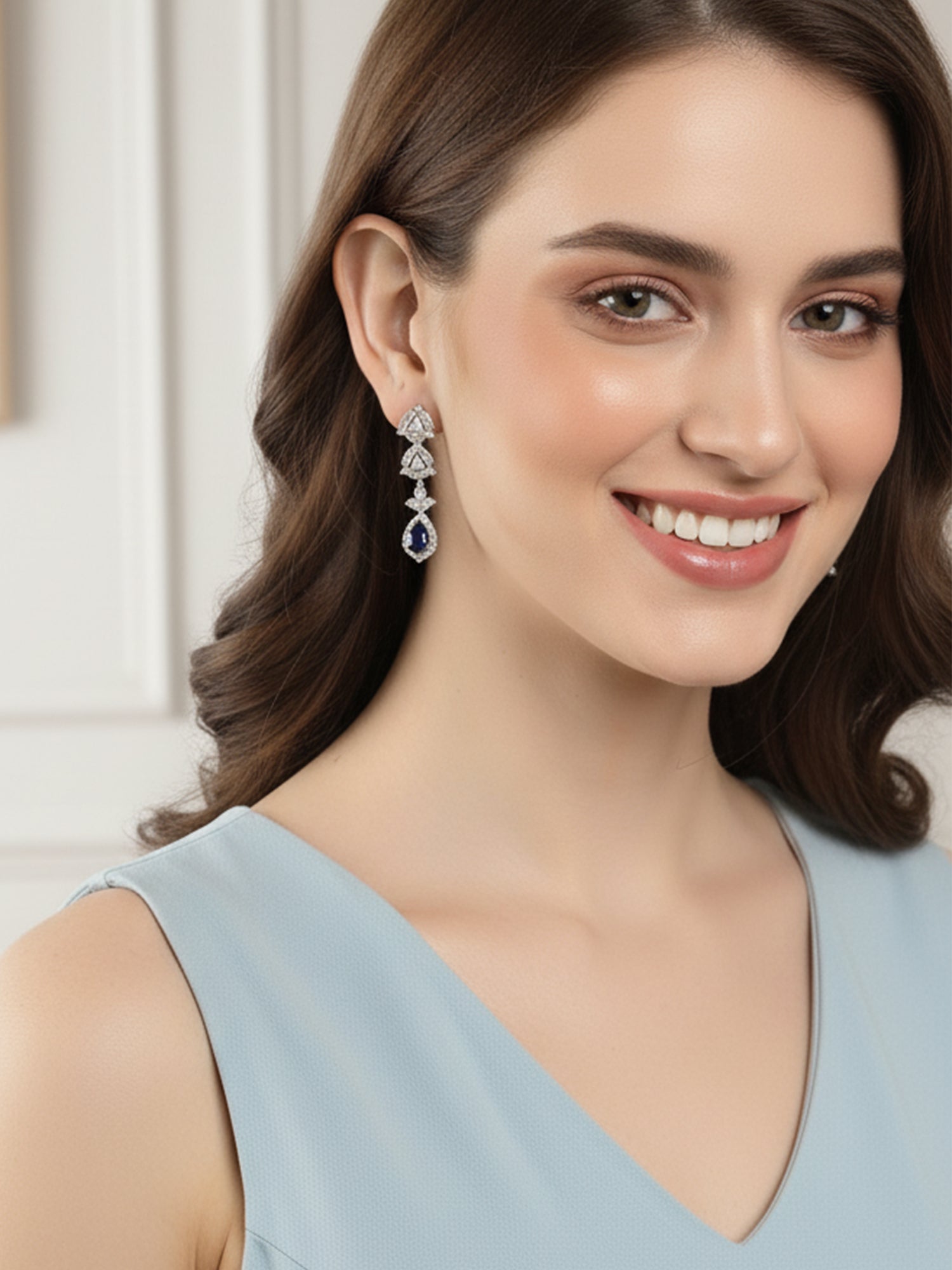 - Silver Tone Blue American Diamond Drop Earrings for Women. It is made with high-quality Kundan Stones which makes them very skin-friendly. Perfect for Weddings, Parties, Festivals, and Traditional Occasions. Gracefully pair Saree, Kurti, or any Indo-western outfit to enhance your look. These are made from toxic-free materials which are Anti-Allergic and Safe for the skin.