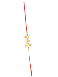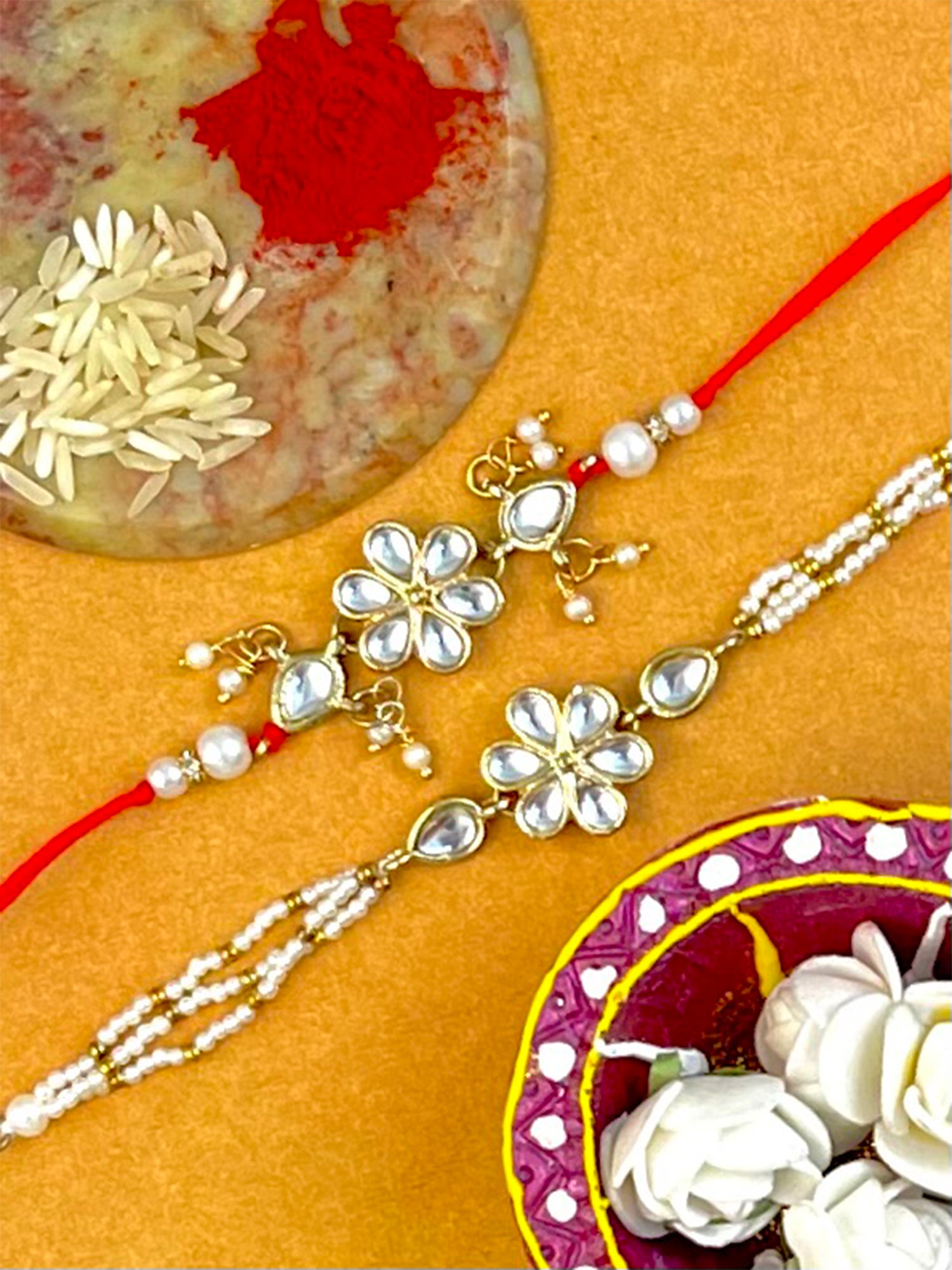 • Our rakhis are gold-plated and embellished with Kundan, Beads, Pearls, and Stones.
