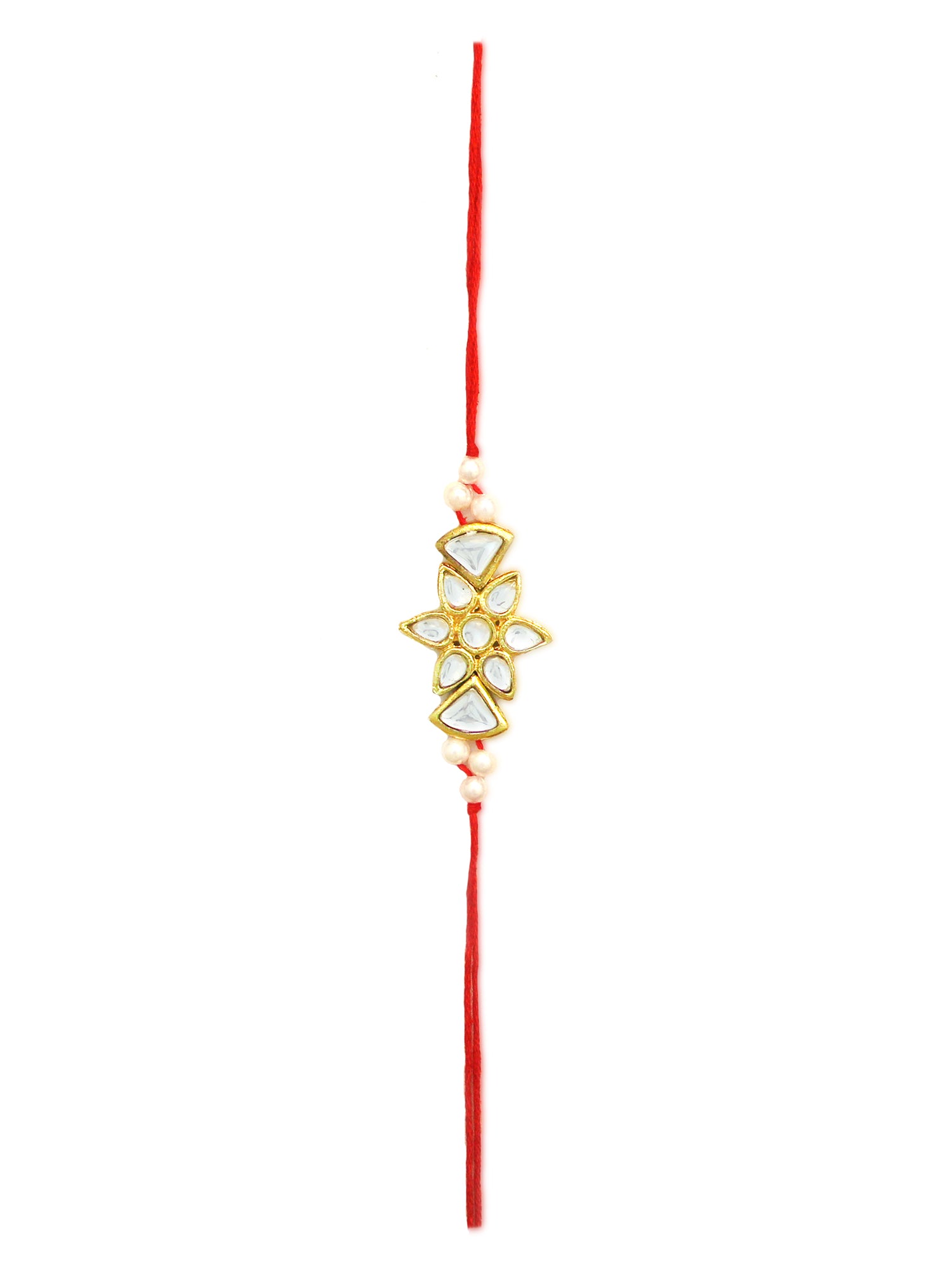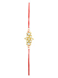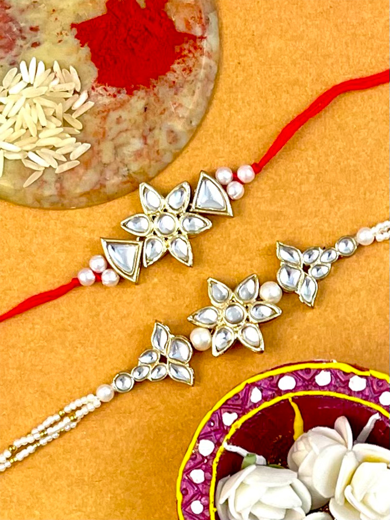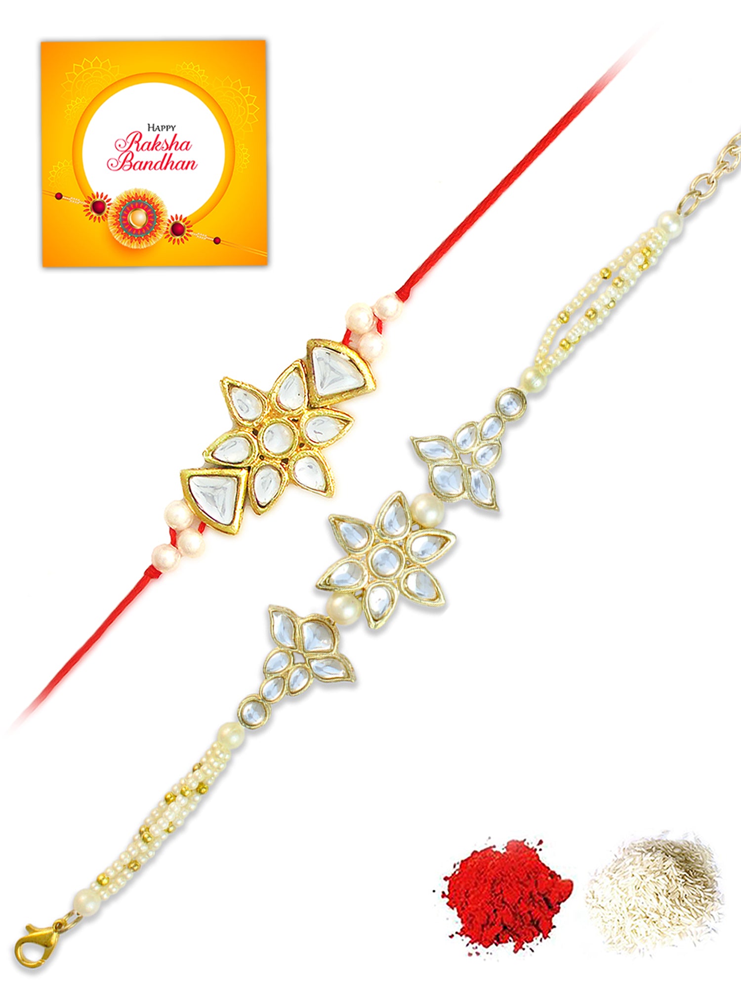 • Our rakhis are gold-plated and embellished with Kundan, Beads, Pearls, and Stones.