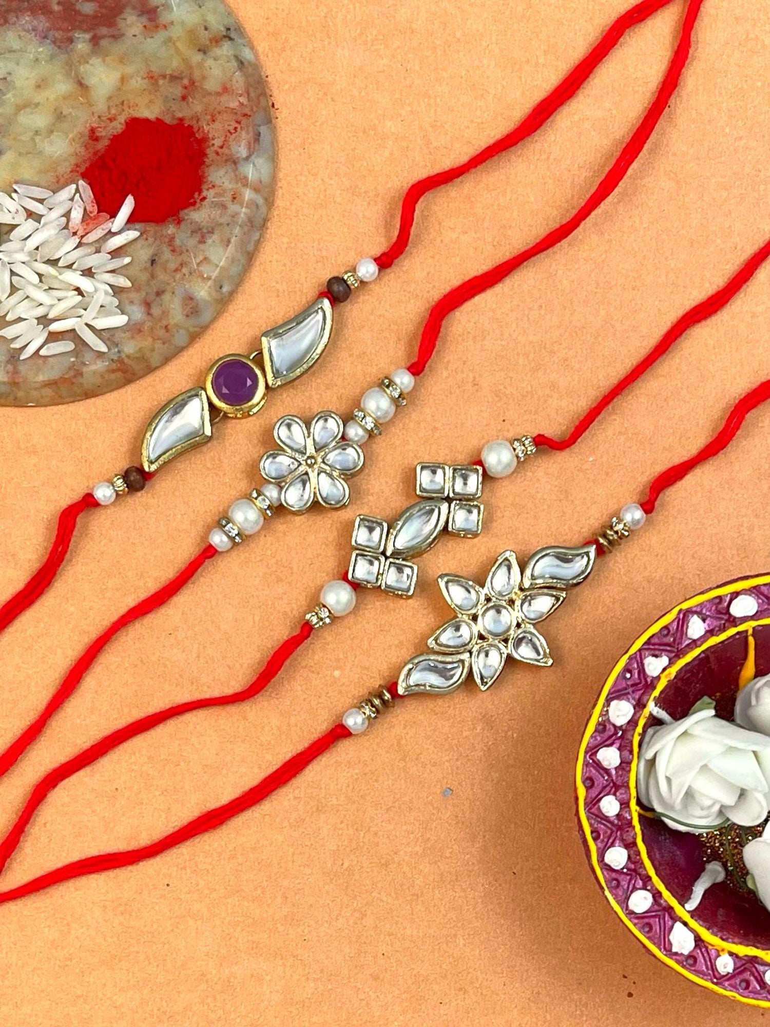 • Set of 4 Gold Plated Handmade Kundan Rakhi Combo with Roli & Chawal