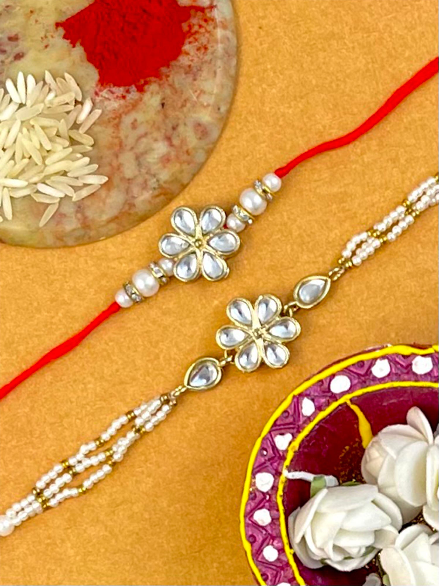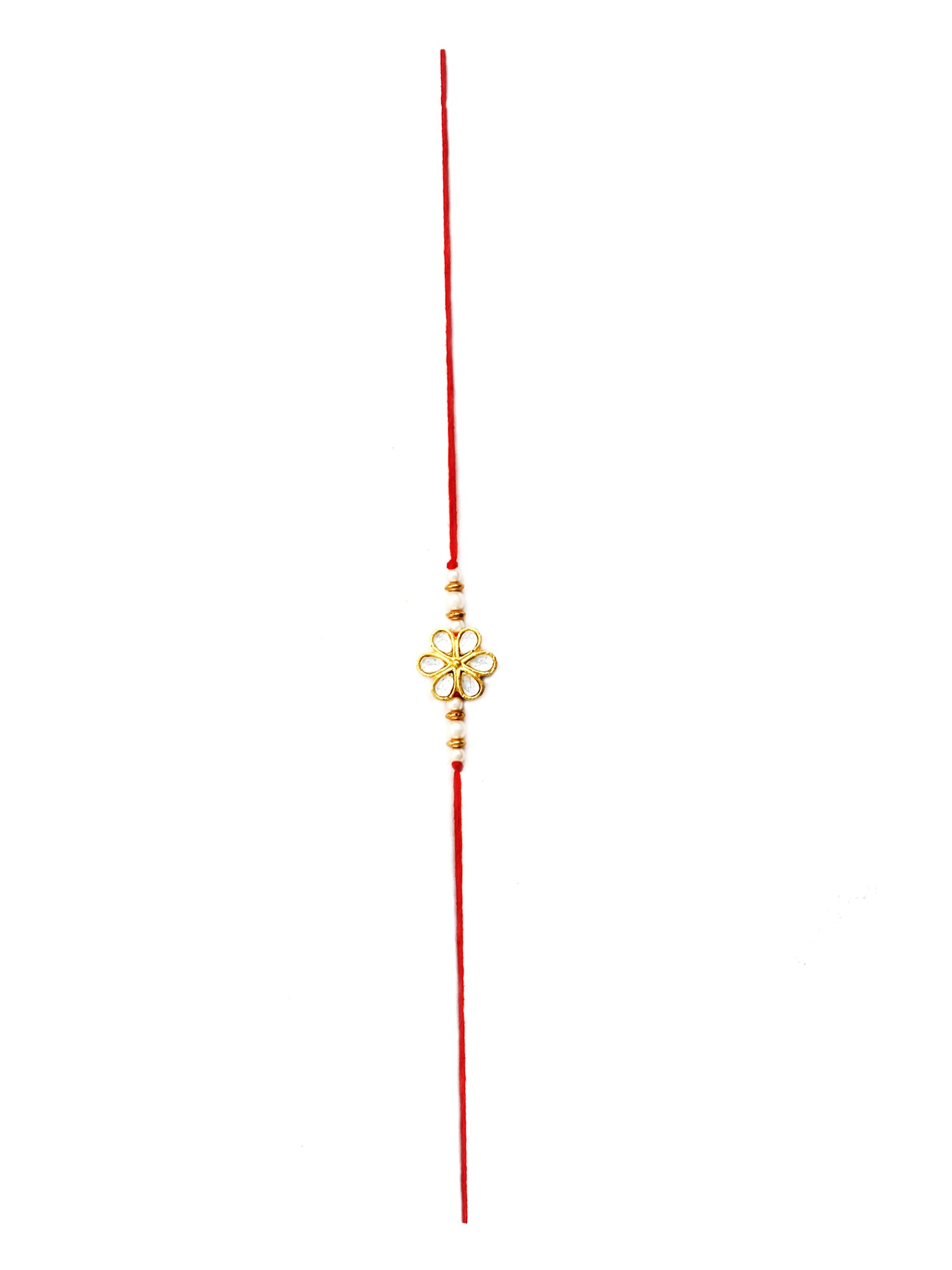 • Our rakhis are gold-plated and embellished with Kundan, Beads, Pearls, and Stones.